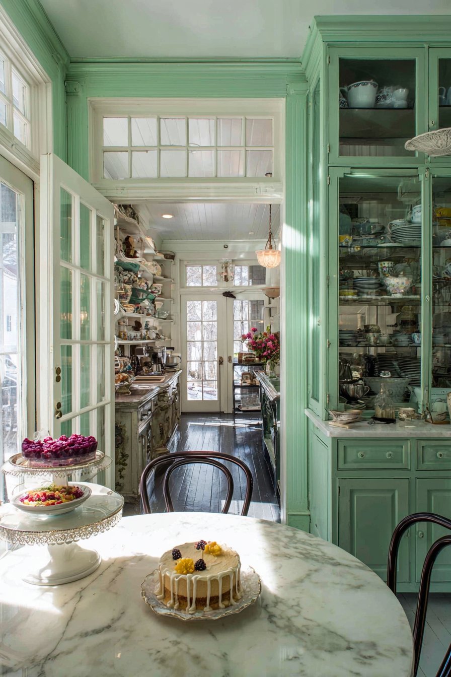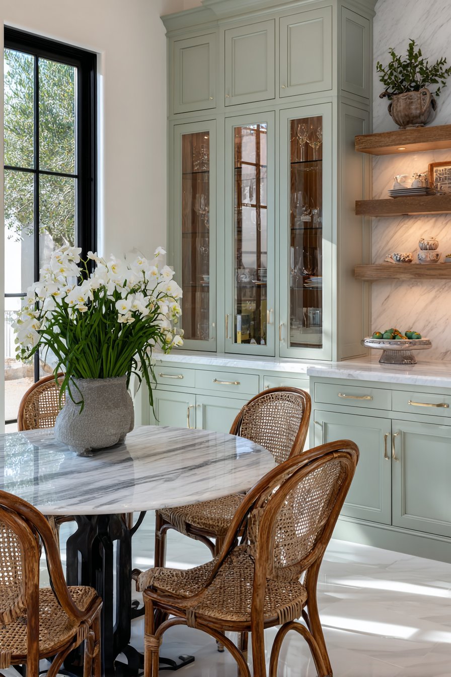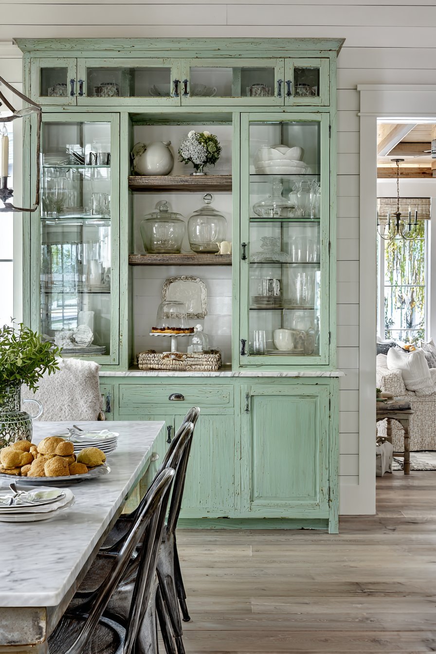 A butler’s pantry adjacent to the dining area features glass-front cabinets in soft green paint, creating visible storage that keeps items organized while adding decorative interest. The glass fronts encourage maintaining organized, aesthetically pleasing arrangement while the soft green color adds cottage charm. This transitional space between kitchen and dining room provides practical staging area for meals and storage for special occasion items.