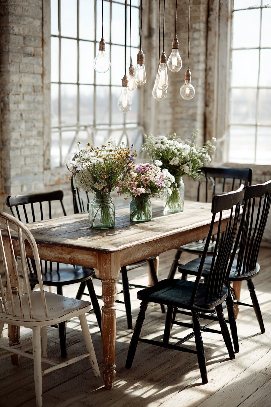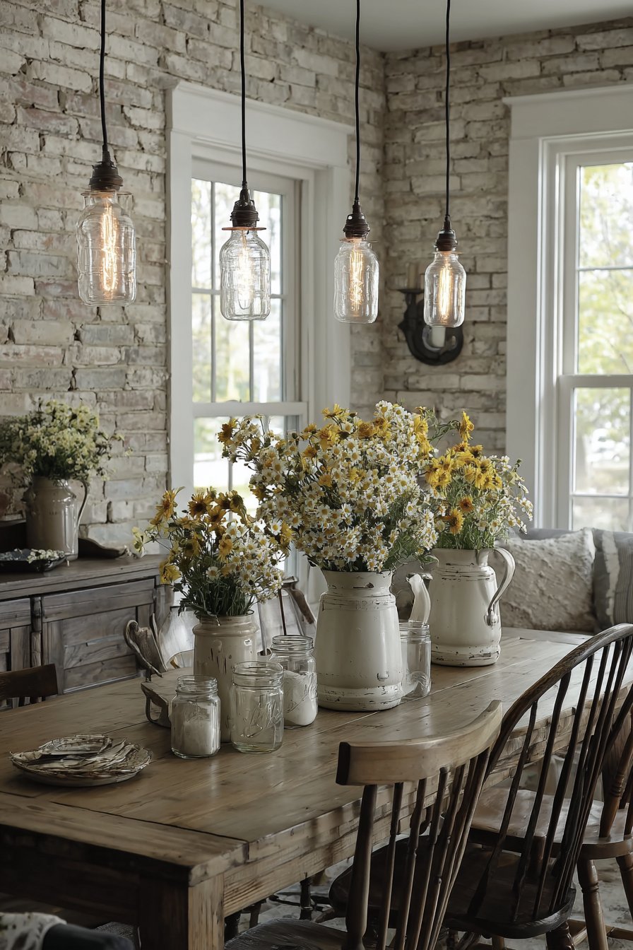 Mason jar pendant lights hang at varied heights above the table, their Edison bulbs casting warm, ambient light that enhances the room’s inviting atmosphere. This creative lighting solution exemplifies cottage style’s embrace of repurposed and unconventional materials. Fresh wildflowers arranged in vintage pitchers serve as centerpieces, bringing seasonal color and natural beauty to the table setting.