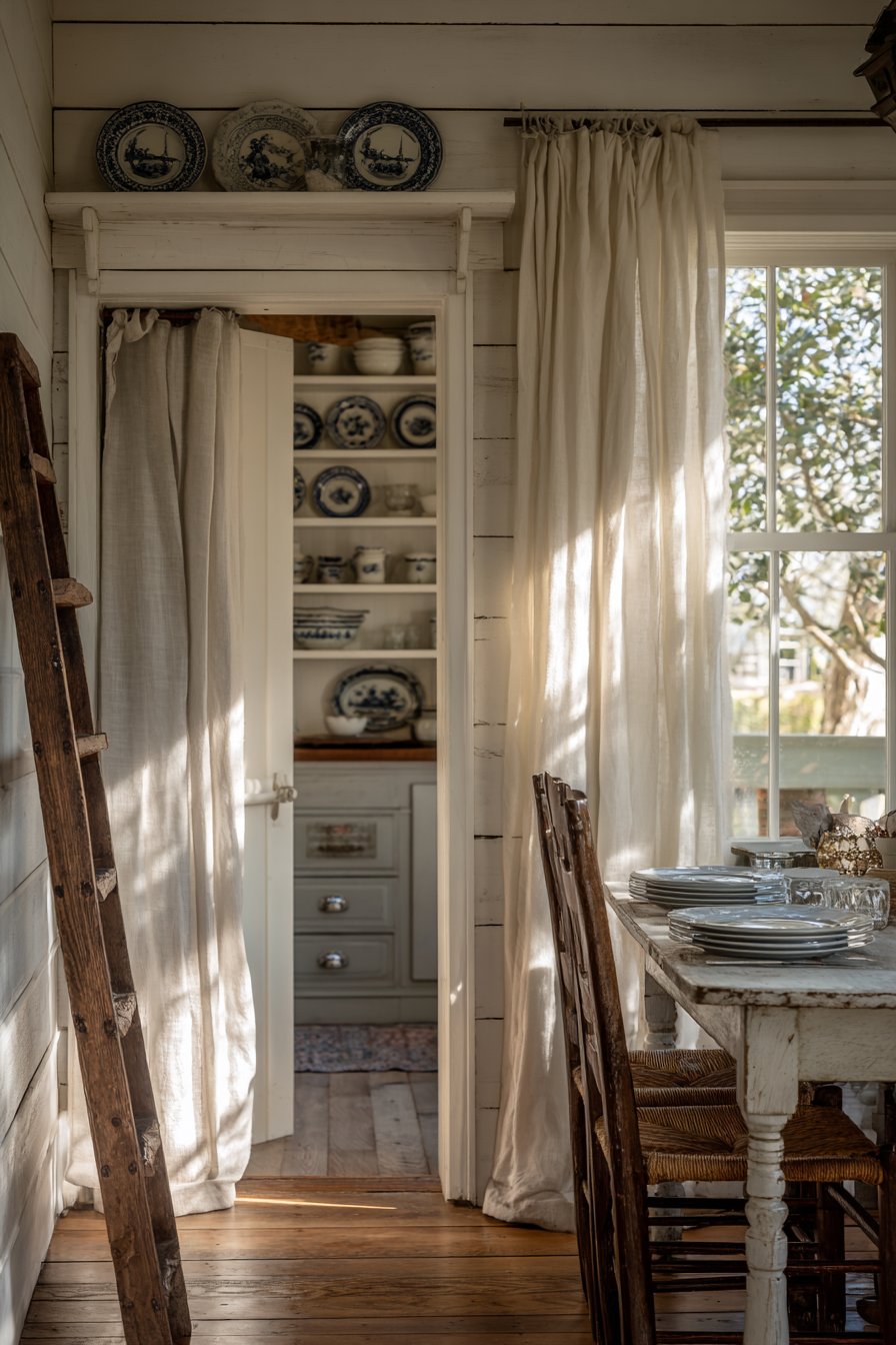 Natural light floods the space through divided-light windows dressed with simple linen café curtains that filter the sunshine into a soft, diffused glow. These half-length window treatments maintain privacy while maximizing light—a hallmark of cottage design that emphasizes connection to the outdoors. The curtains’ relaxed drape and natural fiber content reinforce the unpretentious cottage aesthetic.
