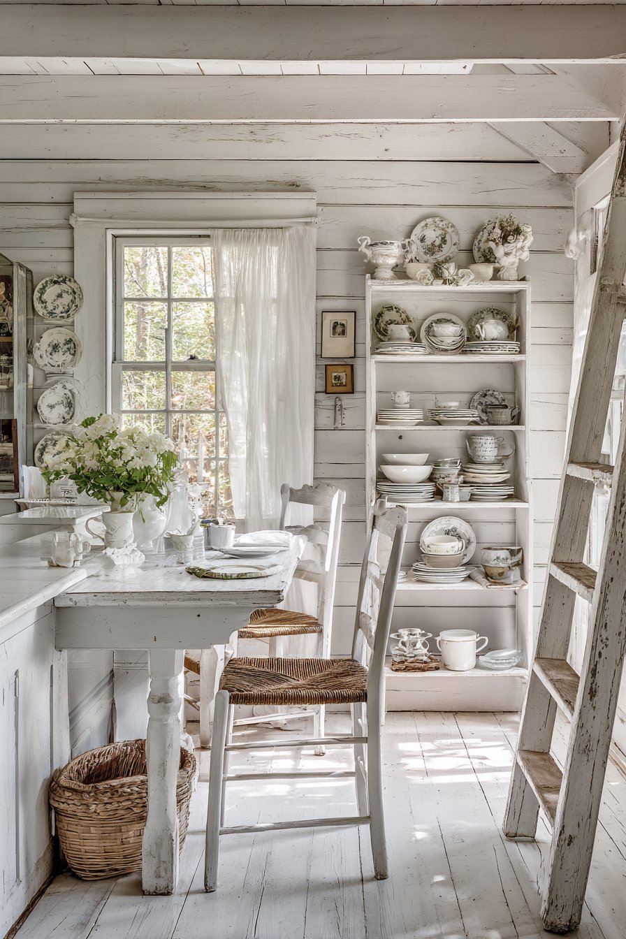 Storage solutions integrated throughout these designs demonstrate cottage style’s practical nature. Built-in hutches, corner cupboards, open shelving, and plate rails provide abundant storage while turning everyday items into decorative displays. This approach eliminates the need for extensive closed cabinetry, keeping rooms feeling open and uncluttered while ensuring necessities remain accessible. The display of collections—whether vintage dishes, ironstone, or serving pieces—adds personality and tells stories about the inhabitants’ interests and heritage.