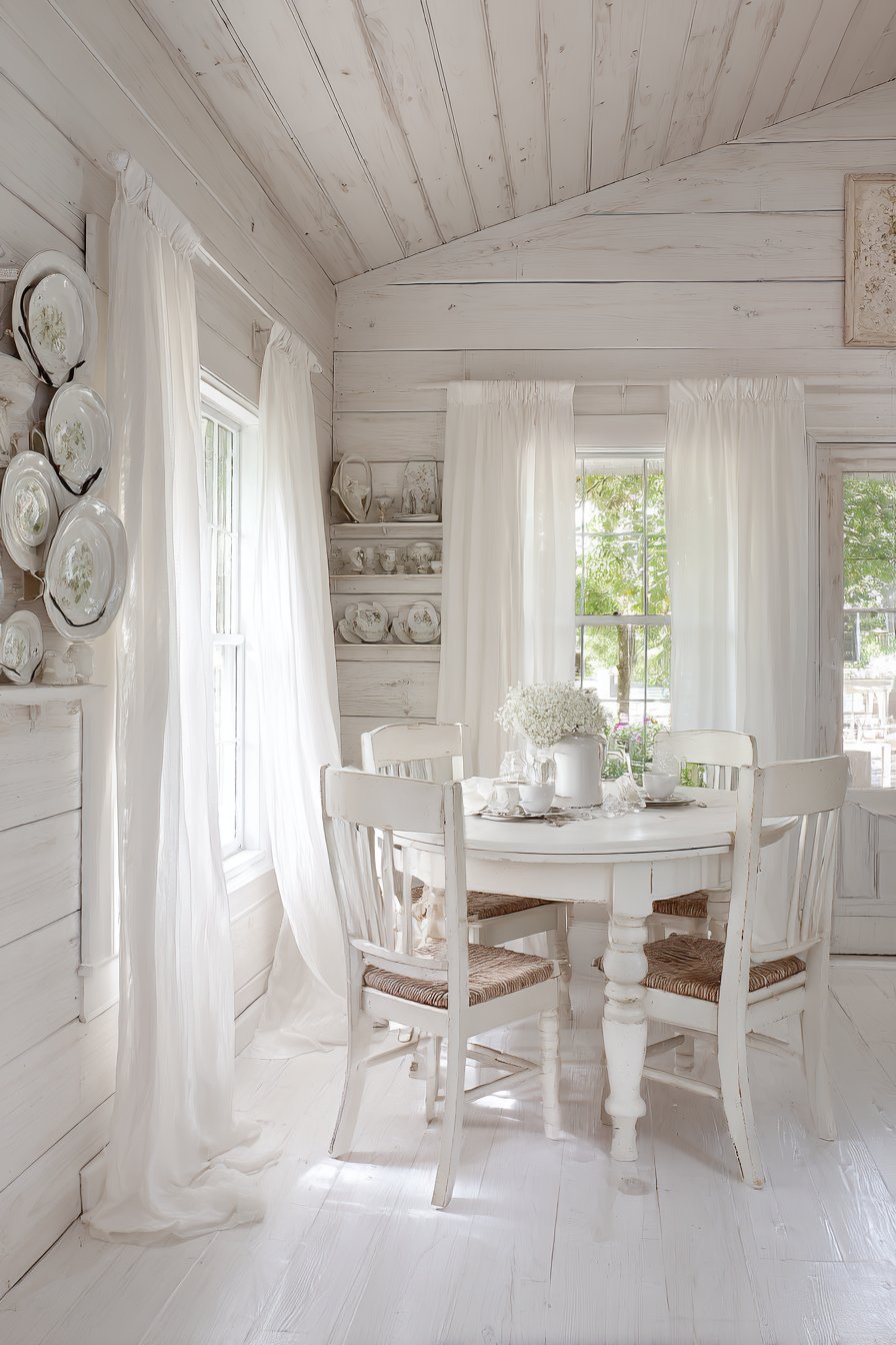 Pale gray shiplap walls with crisp white trim molding create a serene backdrop in this compact cottage dining room, where the horizontal wood planking adds subtle texture without overwhelming the space. The soft gray color provides sophistication while maintaining the light, airy quality essential to cottage design. White painted trim around windows and doors adds definition and architectural detail that elevates the simple material into something special.