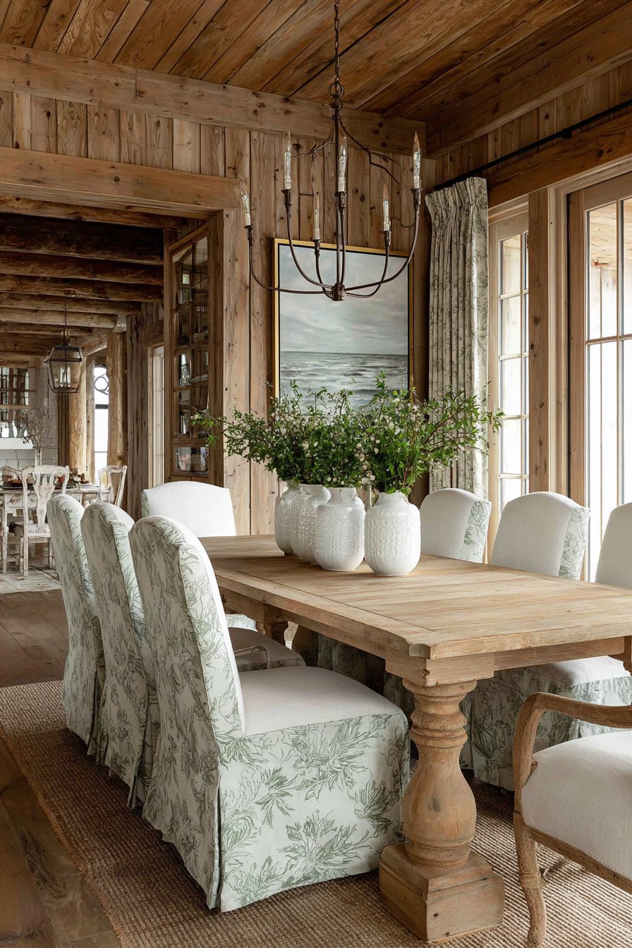 A rectangular farmhouse table with turned legs sits atop wide-plank flooring, its substantial presence anchoring the room while providing generous surface area for family-style dining. The turned legs add traditional detail that references colonial American furniture design, connecting this contemporary space to historical cottage traditions. Upholstered dining chairs covered in faded floral fabric soften the abundance of wood surfaces while introducing pattern and color.