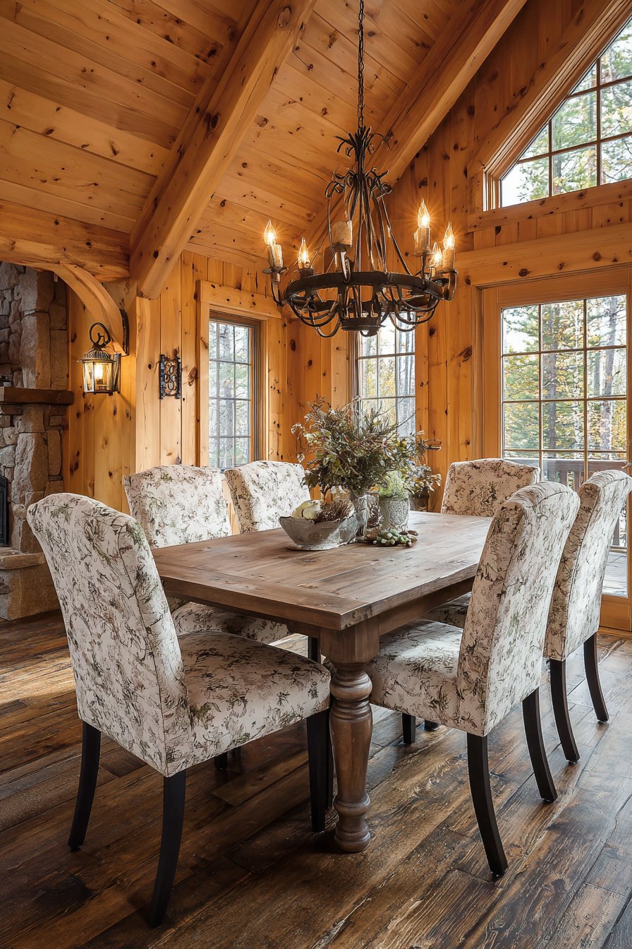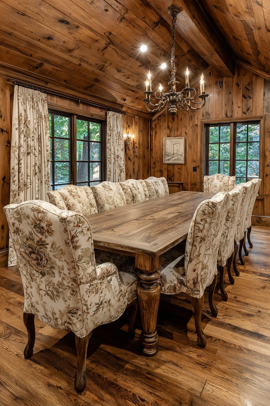 A rustic wooden chandelier with wrought iron accents hangs above the table, its design echoing the room’s natural materials while adding visual interest overhead. The fixture’s aged appearance complements the wood paneling’s warm tones, creating cohesive design that feels intentional rather than matched. This lighting choice provides adequate illumination while reinforcing the cottage aesthetic through its handcrafted appearance.