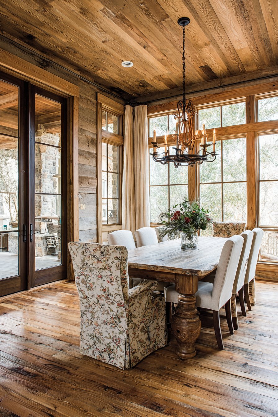 Tongue-and-groove wood paneling stained in natural oak tones envelops this cottage dining room, covering both walls and ceiling to create a warm, cabin-like atmosphere. The continuous wood treatment establishes an intimate, cocooning effect that makes the space feel protected and comfortable. The natural stain allows the oak’s beautiful grain patterns to shine through, celebrating the wood’s inherent beauty rather than concealing it.