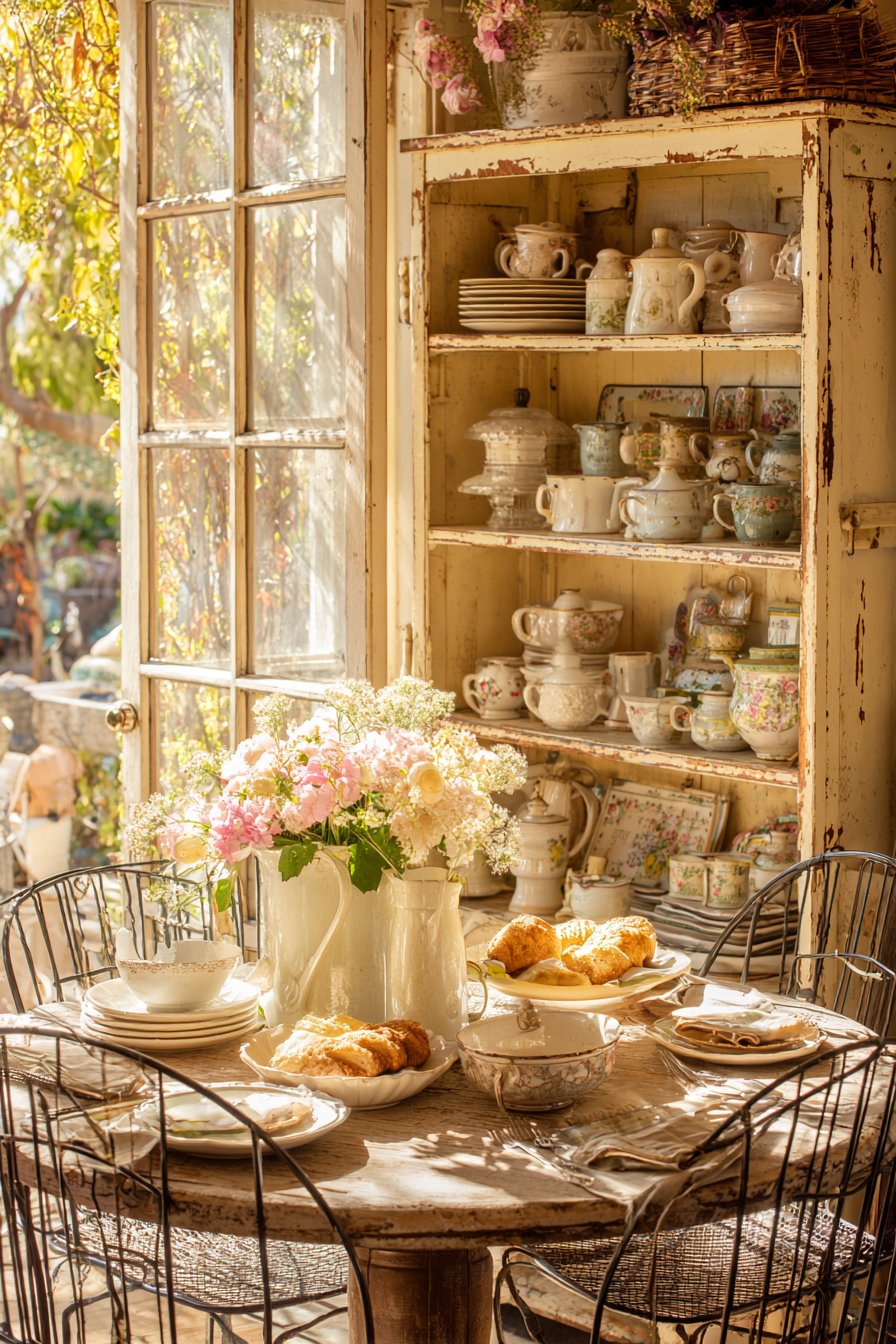 Fresh cut flowers arranged in enamelware pitchers add living color and organic shapes to the carefully curated setting. These simple, practical vessels perfectly suit the cottage aesthetic, their utilitarian design and chip-worn surfaces adding to rather than detracting from the arrangement’s charm. The flowers bring the garden indoors, maintaining the cottage connection to nature and seasonal rhythms.