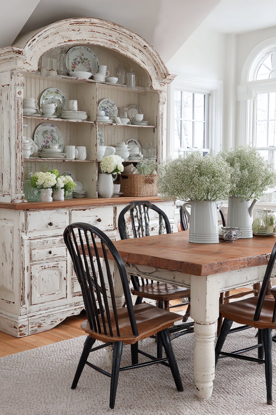 A vintage farmhouse hutch in chippy white paint becomes the statement piece in this cottage dining room, its weathered finish revealing layers of history through intentionally worn edges and corners. The substantial piece provides both storage and display opportunities, with lower cabinets concealing everyday items while upper shelves showcase collections of ironstone and transferware. This combination of function and beauty epitomizes cottage design philosophy.