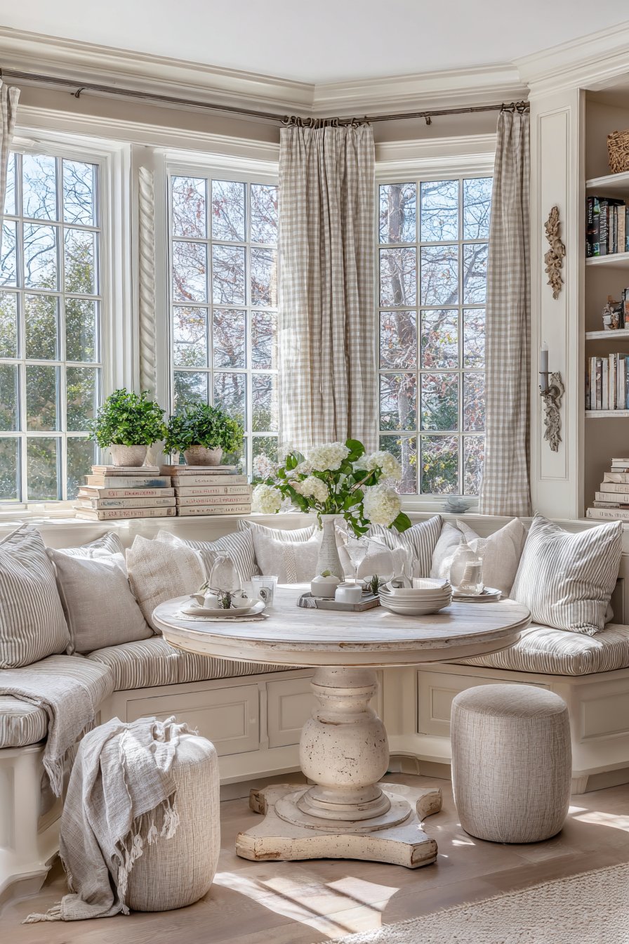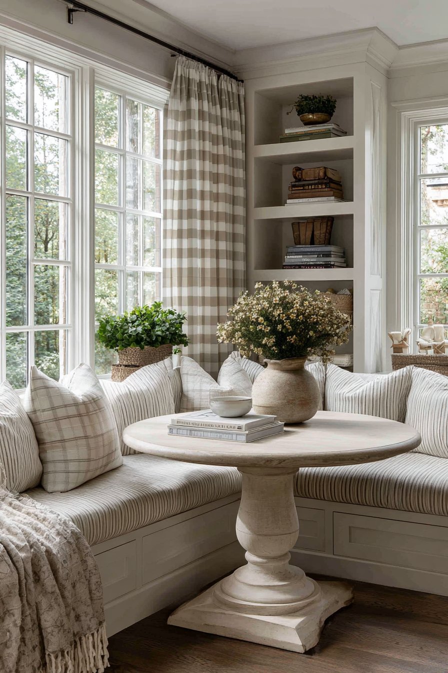 A small round pedestal table in distressed cream finish centers the nook, its compact size perfectly proportioned for morning coffee and casual meals. The pedestal base eliminates corner table legs, allowing diners to slide in and out of the banquette seating more easily. Stacked vintage books and potted plants line the windowsill, adding personality and life to the space without requiring floor space.