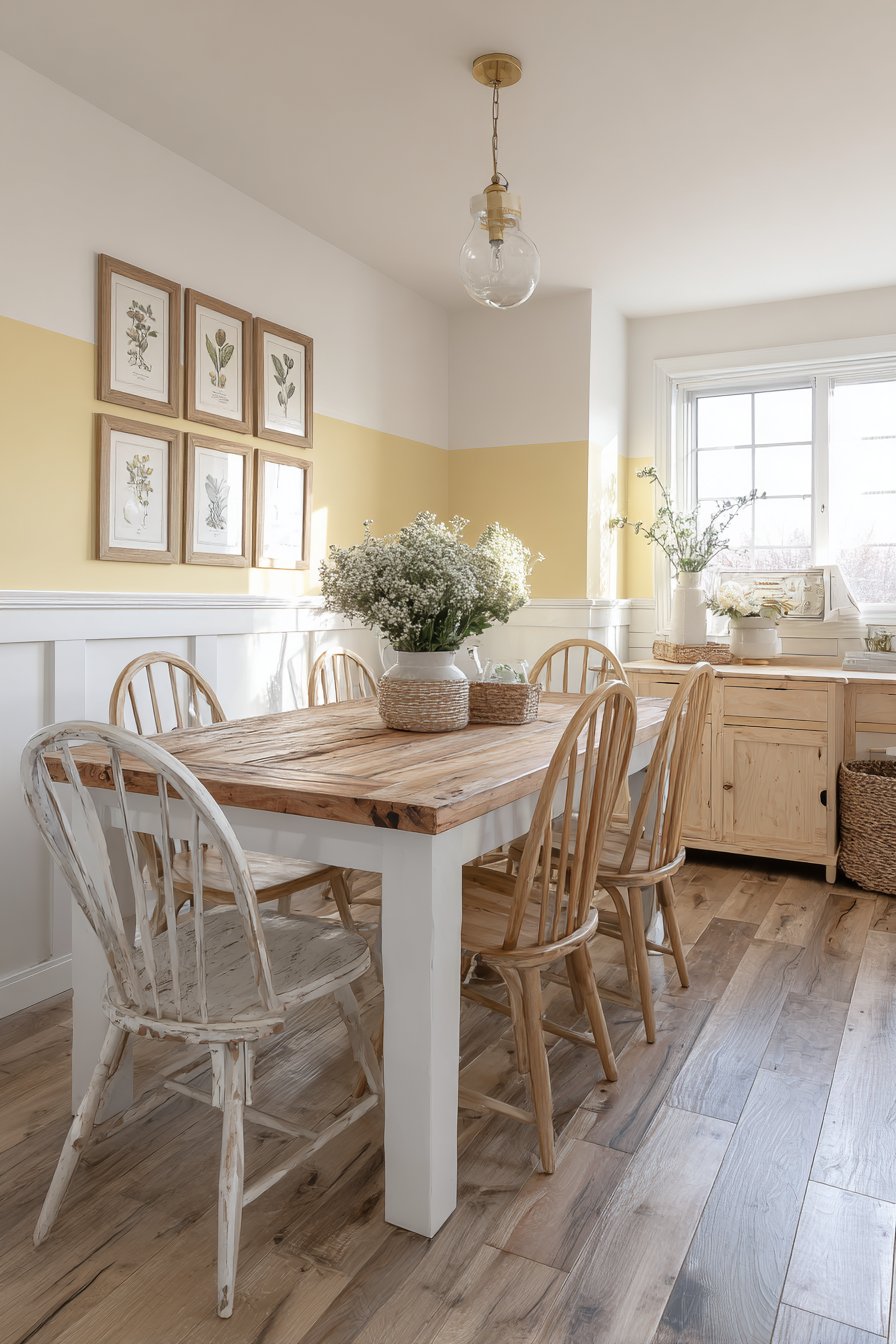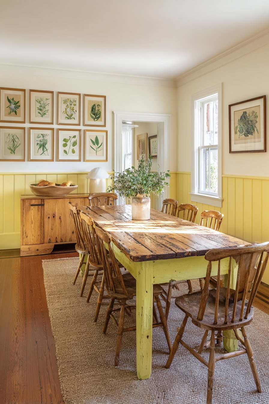 Board-and-batten wall treatment painted in soft butter yellow brings sunshine into this cheerful cottage dining room, the vertical battens adding architectural dimension while the warm color creates an inviting atmosphere. This classic wall treatment originated as practical weatherproofing in barns and cottages but has evolved into a beloved decorative element that adds instant cottage character. The butter yellow hue feels optimistic without being overwhelming, making it suitable for rooms receiving varying amounts of natural light.