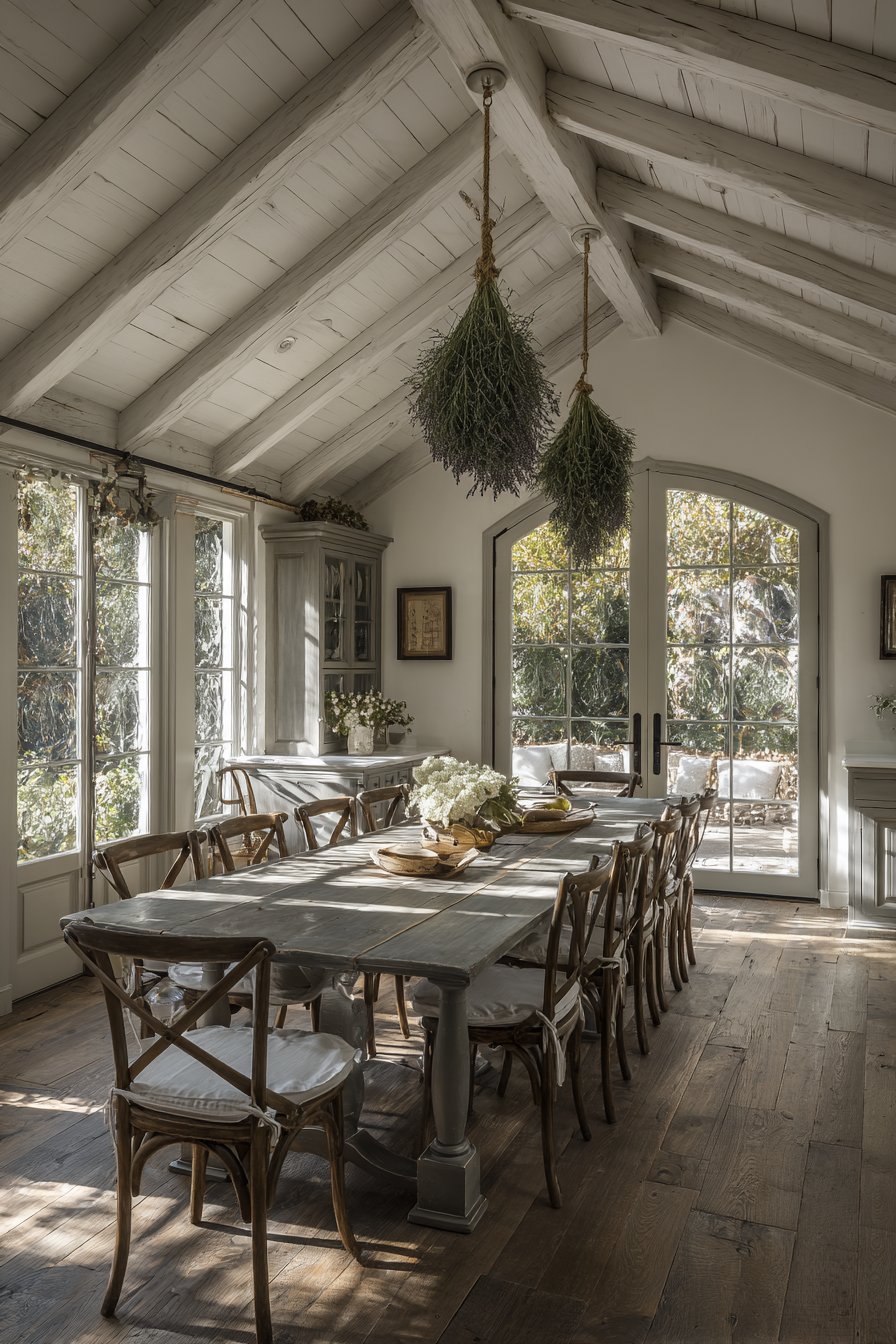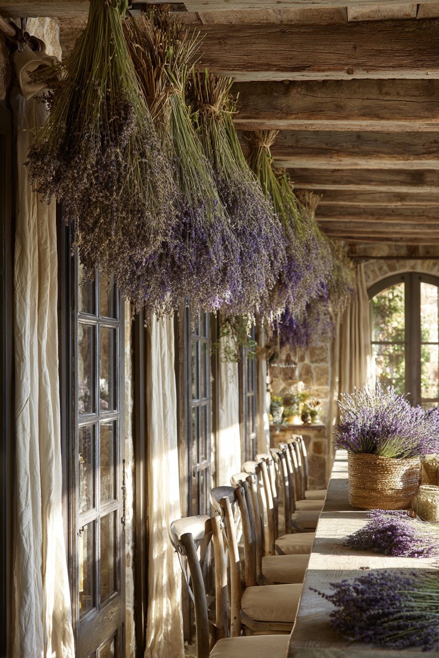 A long harvest table in weathered gray finish stretches across the room, accommodating eight ladder-back chairs with cushioned seats for comfortable extended dining. The table’s substantial length makes it ideal for family gatherings and dinner parties, while its weathered finish suggests years of use and shared meals. Bundles of dried lavender hang from the overhead beams, adding subtle color, texture, and gentle fragrance to the space.