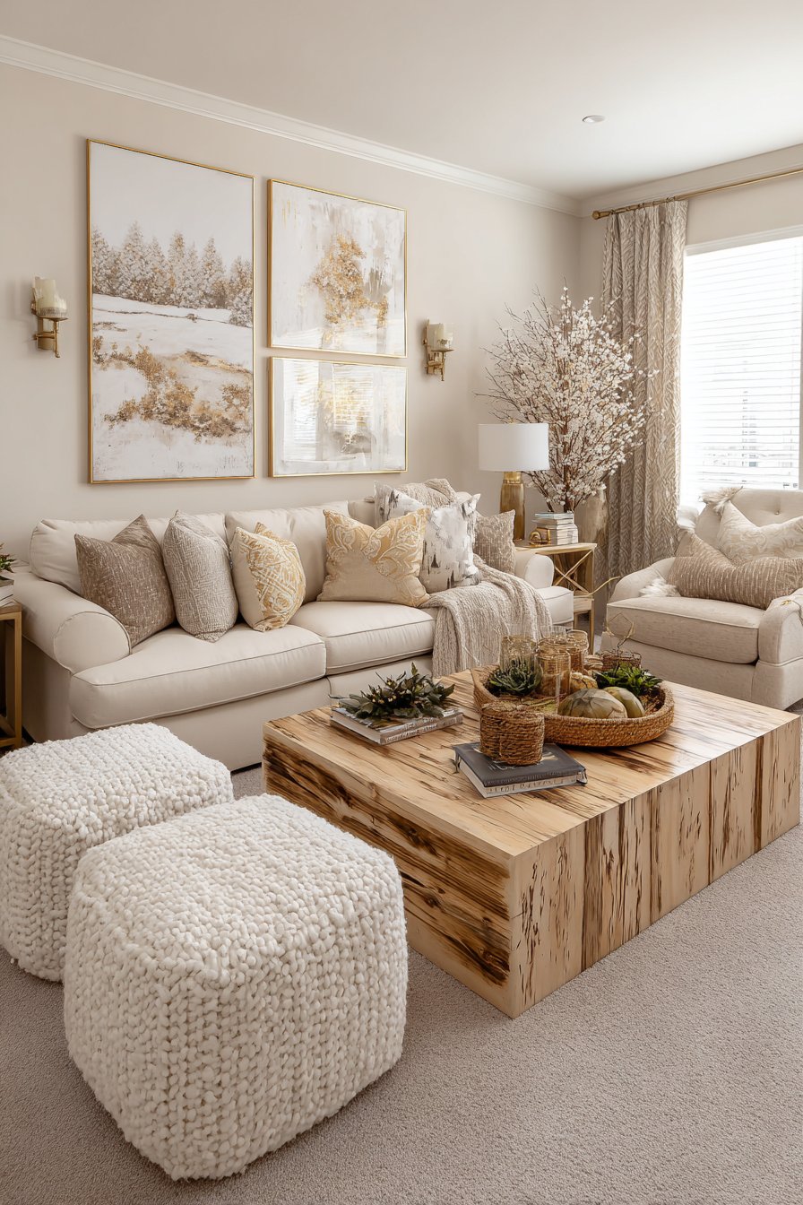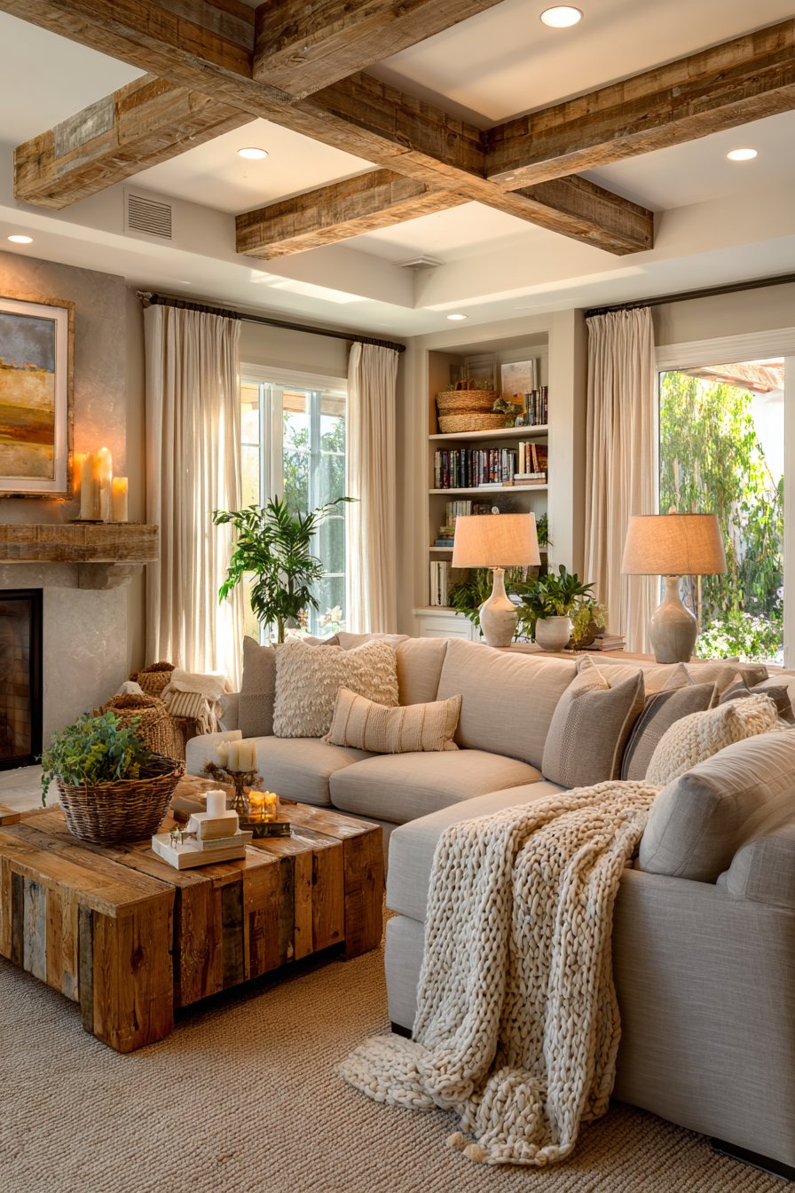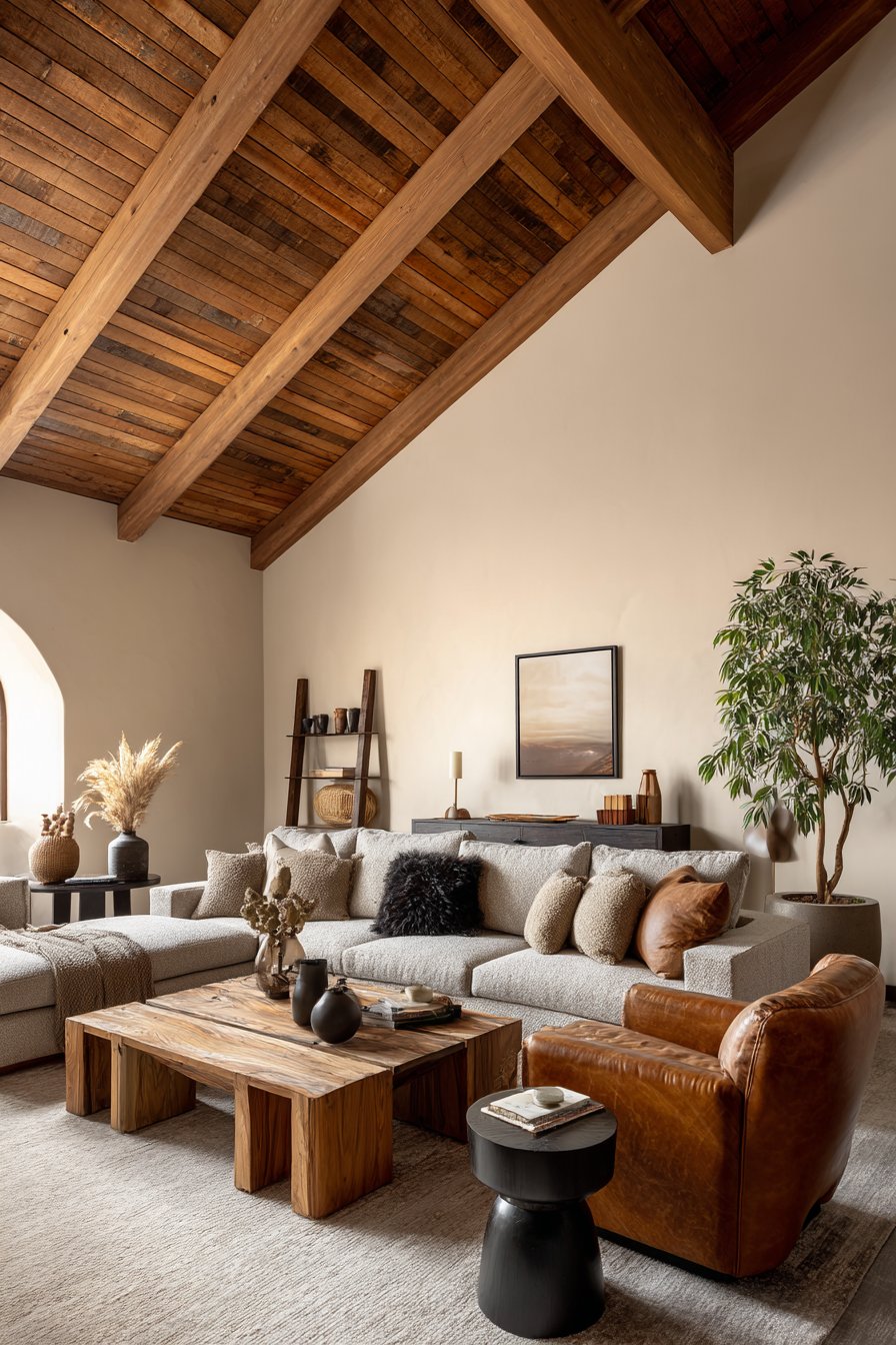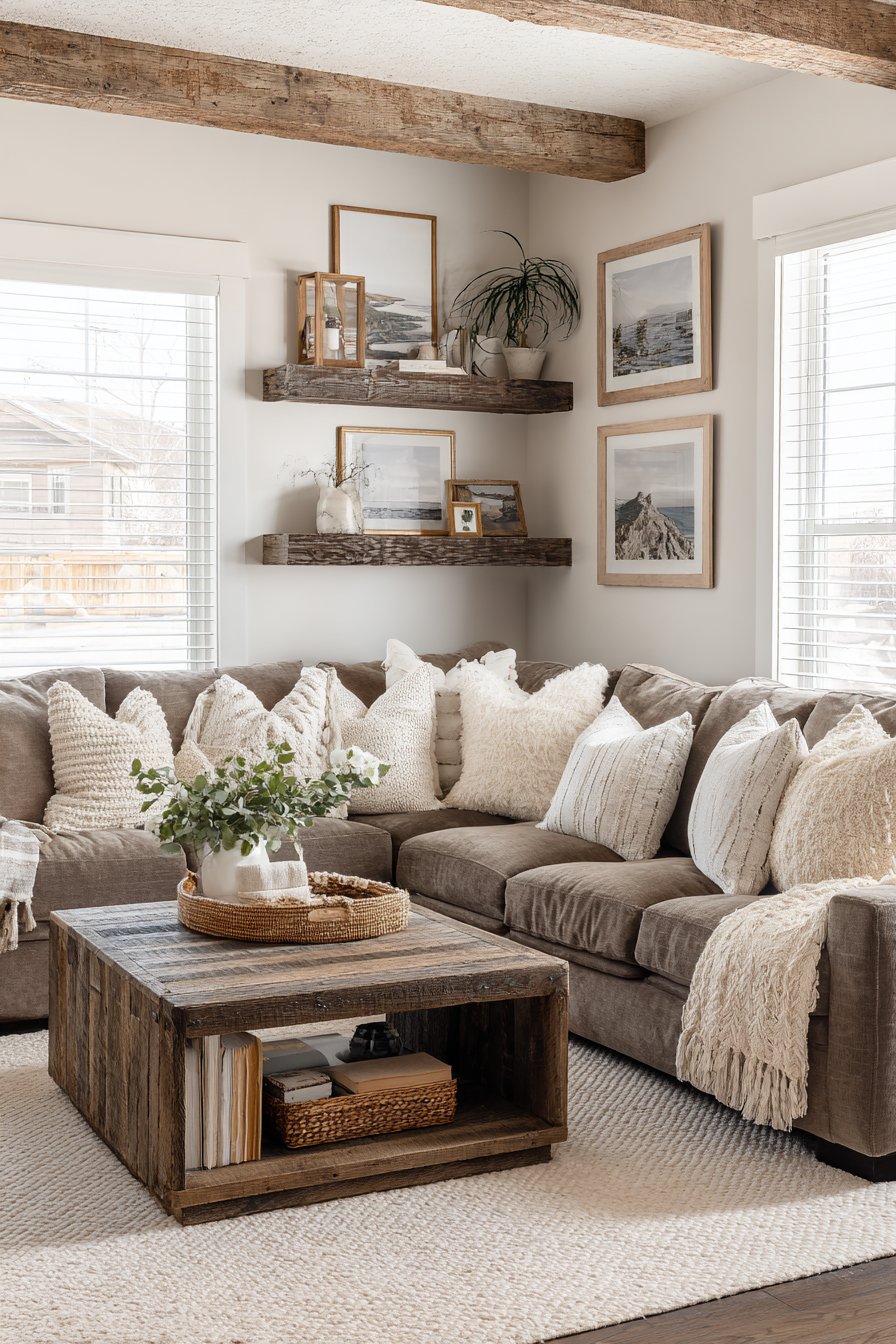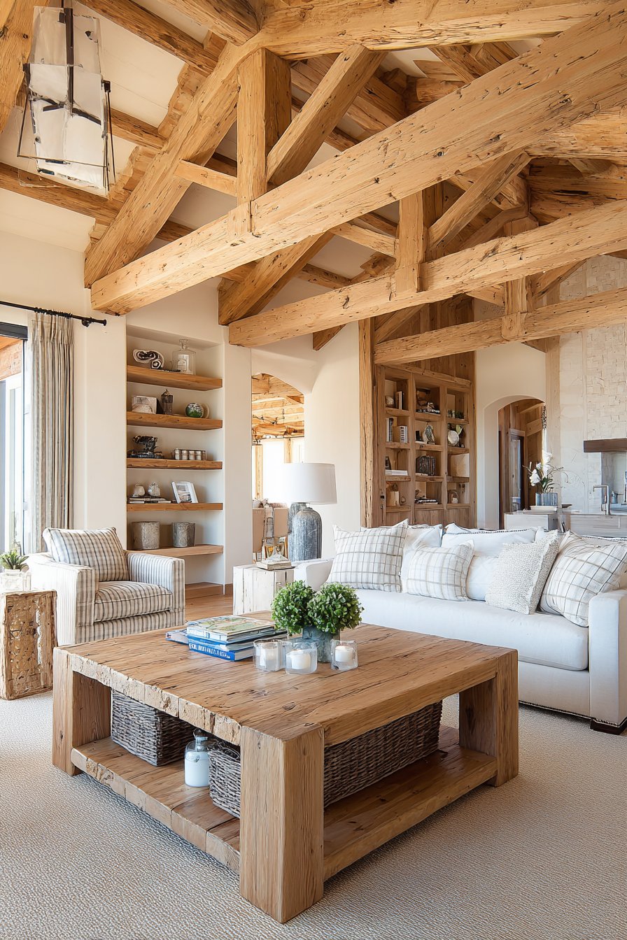Natural wood elements bring unparalleled warmth and organic beauty to cozy living spaces, and this design showcases how varied wood tones can work together harmoniously. Exposed ceiling beams in warm honey tones draw the eye upward and add architectural character, while a solid wood coffee table with live edge details celebrates the natural form and grain of the tree. Floating shelves made from reclaimed barn wood introduce history and texture, and wooden picture frames in various finishes tie the look together. The wood tones range from light oak to deeper walnut shades, creating depth through variation while maintaining cohesion through their shared natural warmth.
