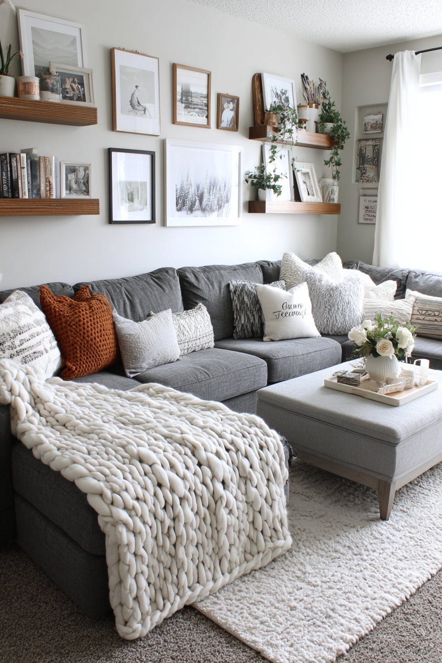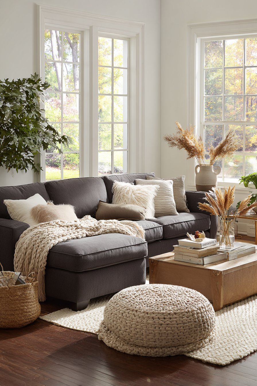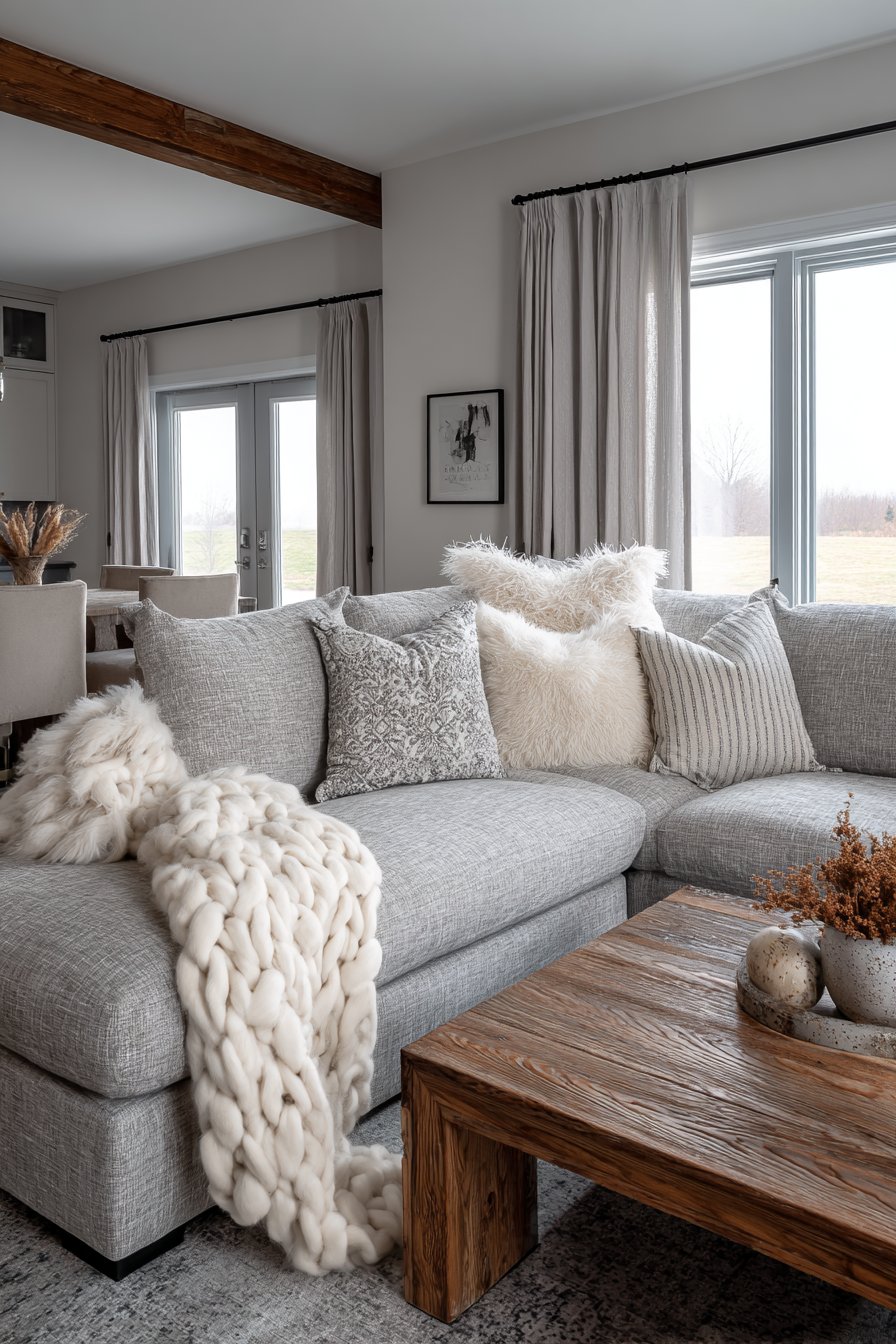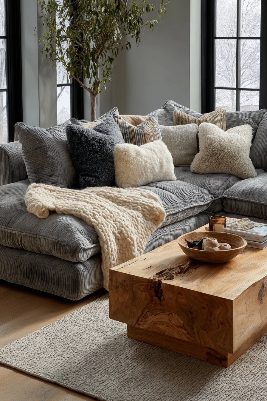 The foundation of any truly cozy living room begins with seating that invites you to sink in and stay awhile. A deep-seated sectional sofa upholstered in soft grey chenille fabric creates an irresistible anchor for relaxation and gathering. The beauty of this approach lies in its generous proportions—oversized cushions that cradle you in comfort, paired with multiple throw pillows in varying textures including velvet, linen, and faux fur. This layering of fabrics creates visual depth while offering tactile variety that makes the space feel curated and lived-in.