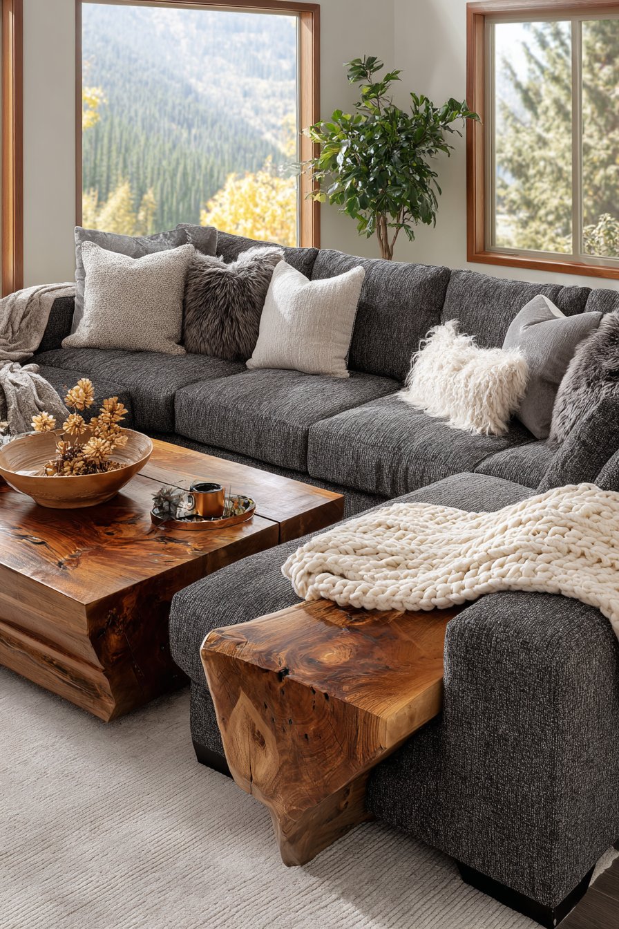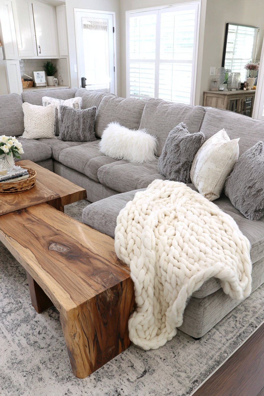 The magic happens when you introduce that essential cozy element: the chunky cable-knit throw blanket in cream, casually draped over the armrest as if someone just finished curling up with a good book. This seemingly effortless styling speaks to the heart of cozy design—spaces that look beautiful but feel genuinely functional and accessible. The positioning of the sectional facing a rustic wood coffee table with visible grain patterns and natural edge details creates a conversation area that feels both intimate and welcoming.