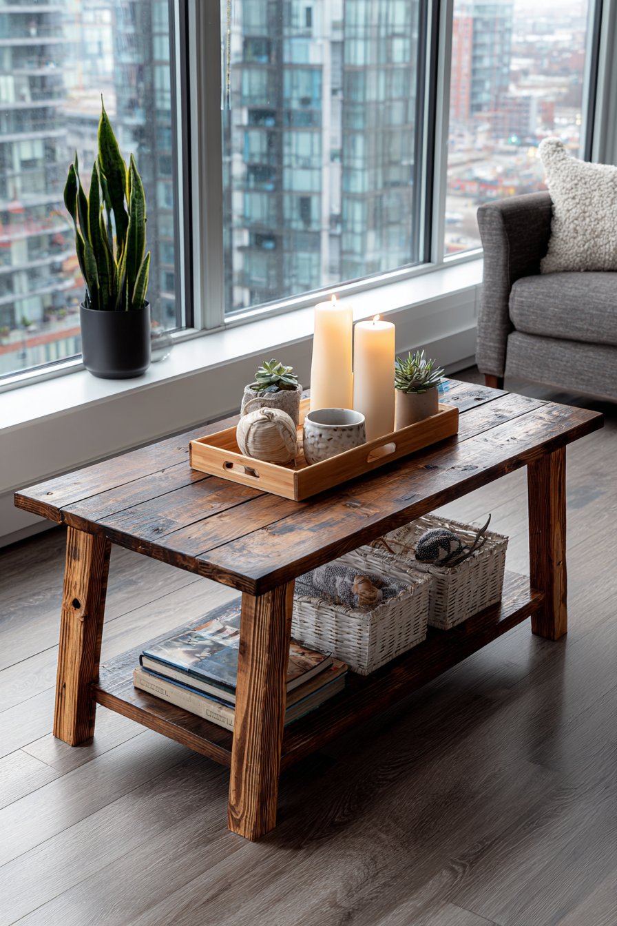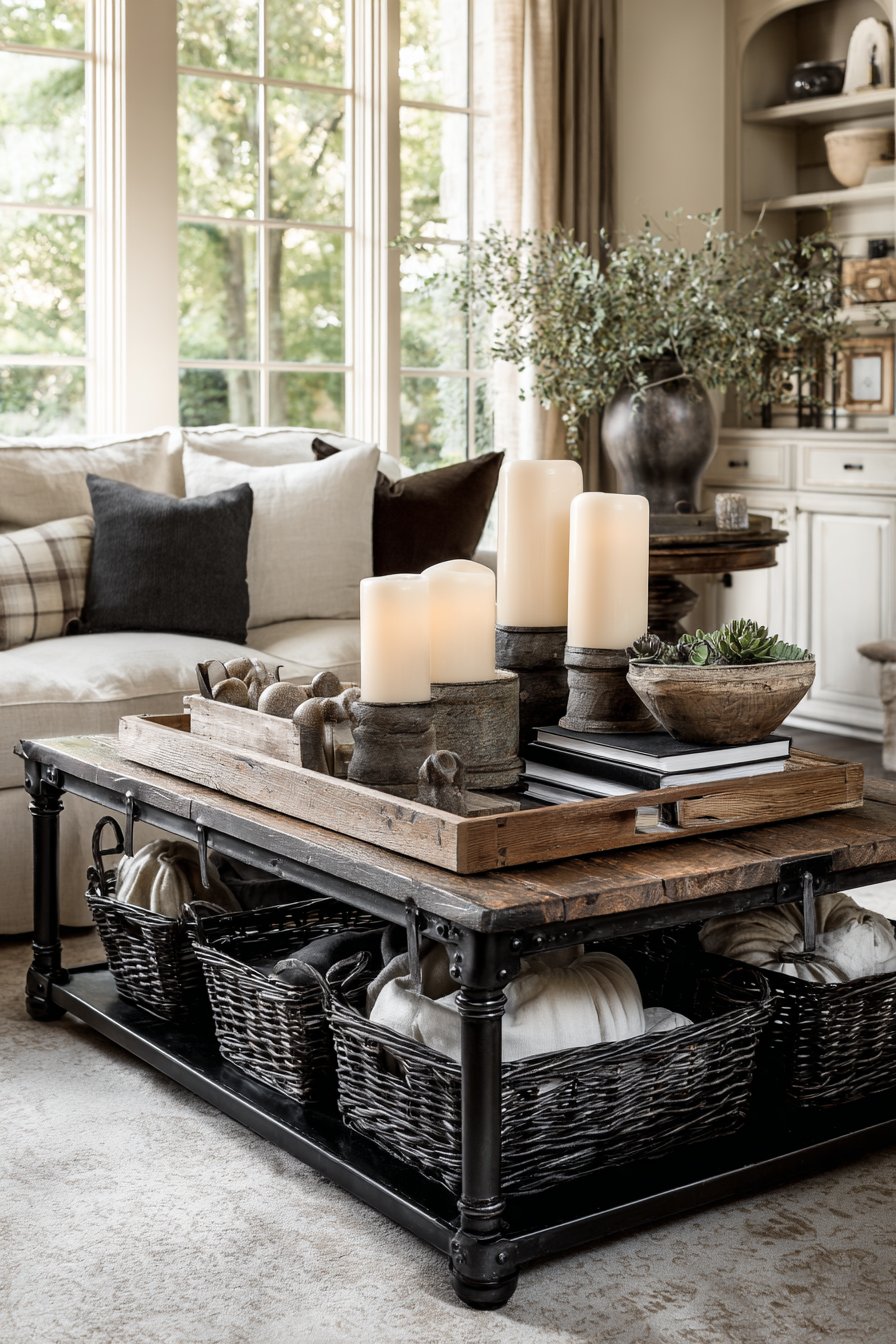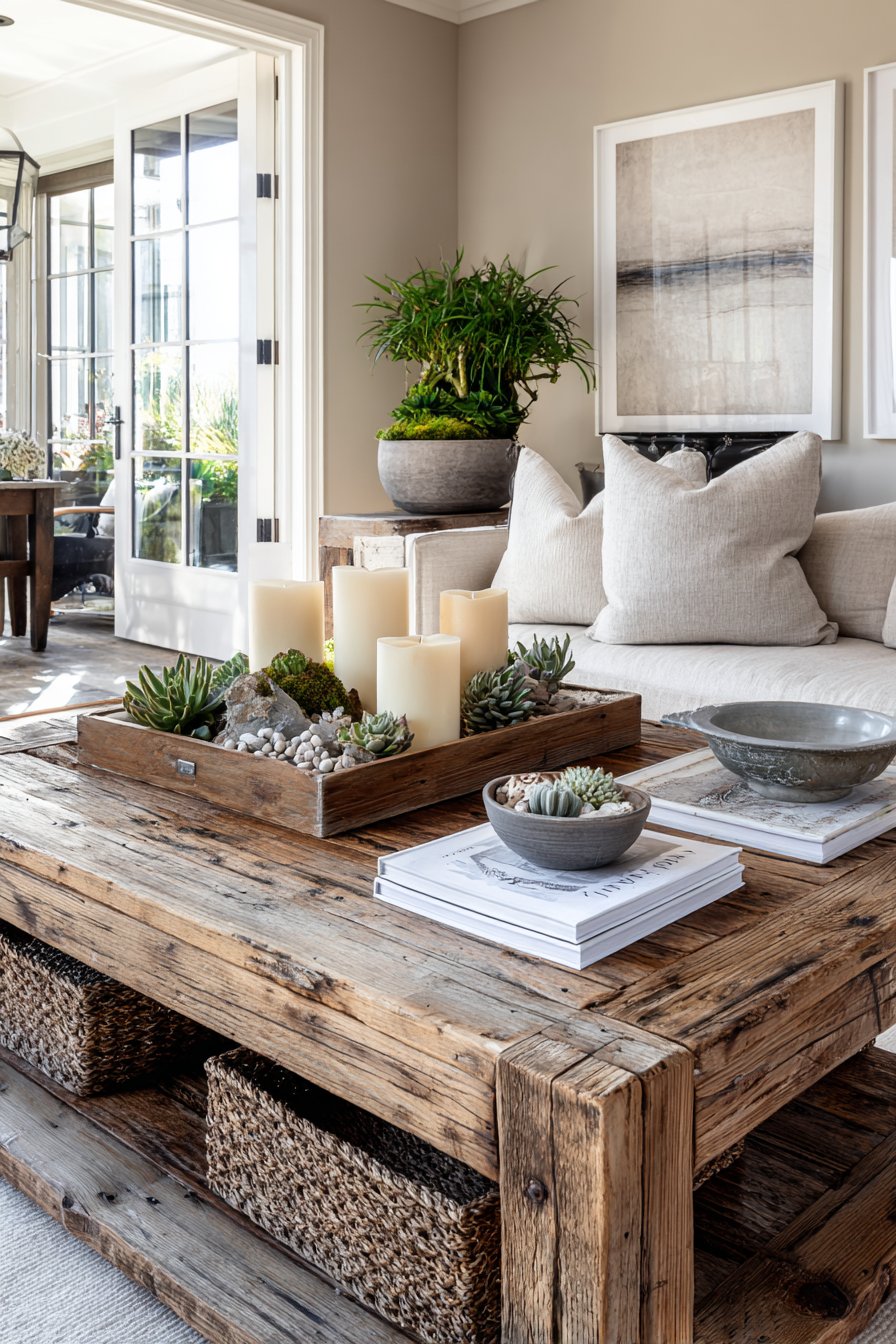 A coffee table serves as the central hub of living room activity, and this design demonstrates how thoughtful styling can balance aesthetics with function. A wooden tray provides structure and delineation, holding pillar candles of varying heights that can be lit for ambiance, a small ceramic bowl with decorative objects that add personality, a few carefully selected hardcover books stacked artfully that introduce color and interest, and a small potted plant or succulent arrangement that adds life and organic form. The coffee table itself features reclaimed wood construction with a lower shelf that accommodates woven storage baskets, proving that beauty and practicality can coexist harmoniously.