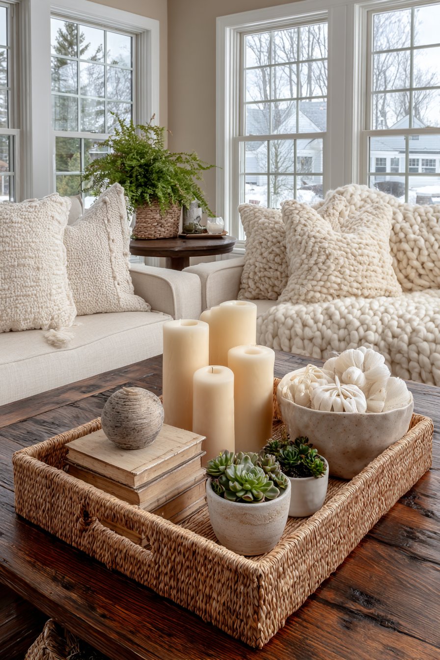 The tray-based styling approach offers multiple benefits beyond aesthetics. It creates visual organization, grouping items together so they read as a cohesive vignette rather than random objects. The tray can be easily moved when you need the full table surface for entertaining or activities, providing flexibility that’s essential in well-used spaces. The varied heights of items within the tray create visual rhythm—the vertical lines of candles contrast with the horizontal mass of stacked books, while the organic form of the plant or succulent introduces natural curves that soften the composition.