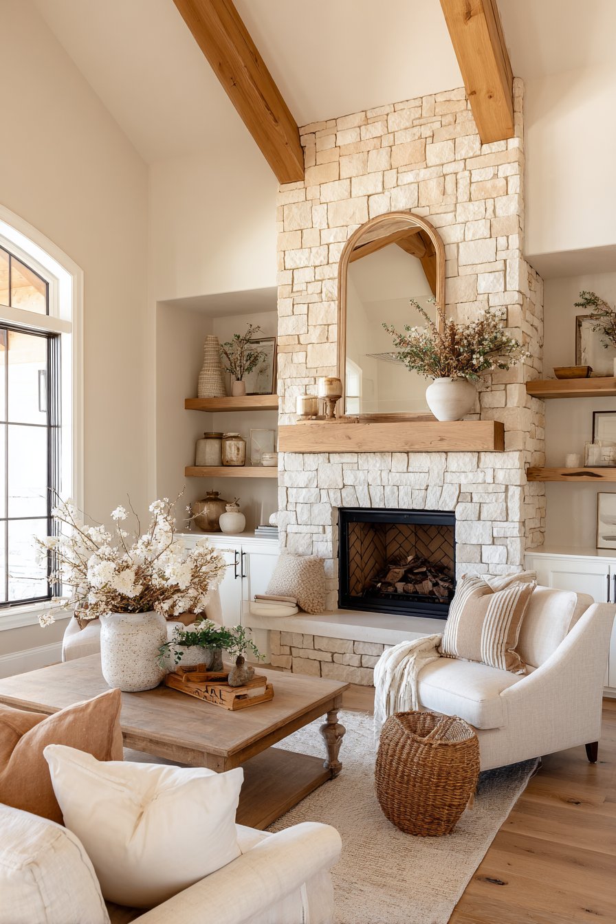 The real magic of this fireplace design lies in its ability to create atmosphere. The combination of natural stone texture, reclaimed wood character, candlelight, and firelight produces a multi-sensory experience that engages sight, warmth, and even sound as logs crackle. This is a space designed for gathering, for conversations that last long into the evening, for creating memories around a timeless architectural element that has brought people together for centuries.