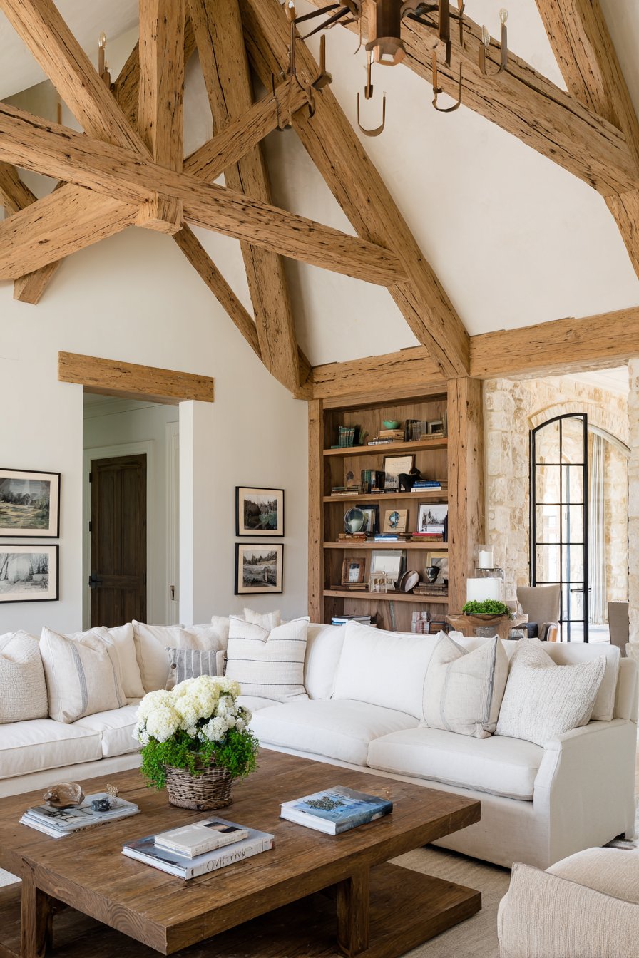 The strategic placement of wood elements throughout the vertical plane of the room creates visual flow and prevents any single area from feeling weighted. Ceiling beams establish presence overhead, floating shelves occupy the middle zone of the walls, and the coffee table anchors the floor level. This distribution ensures the eye travels naturally through the space, experiencing the warmth of wood at every level. The varied applications—structural beams, functional furniture, decorative frames—demonstrate wood’s versatility as both a building material and design element.
