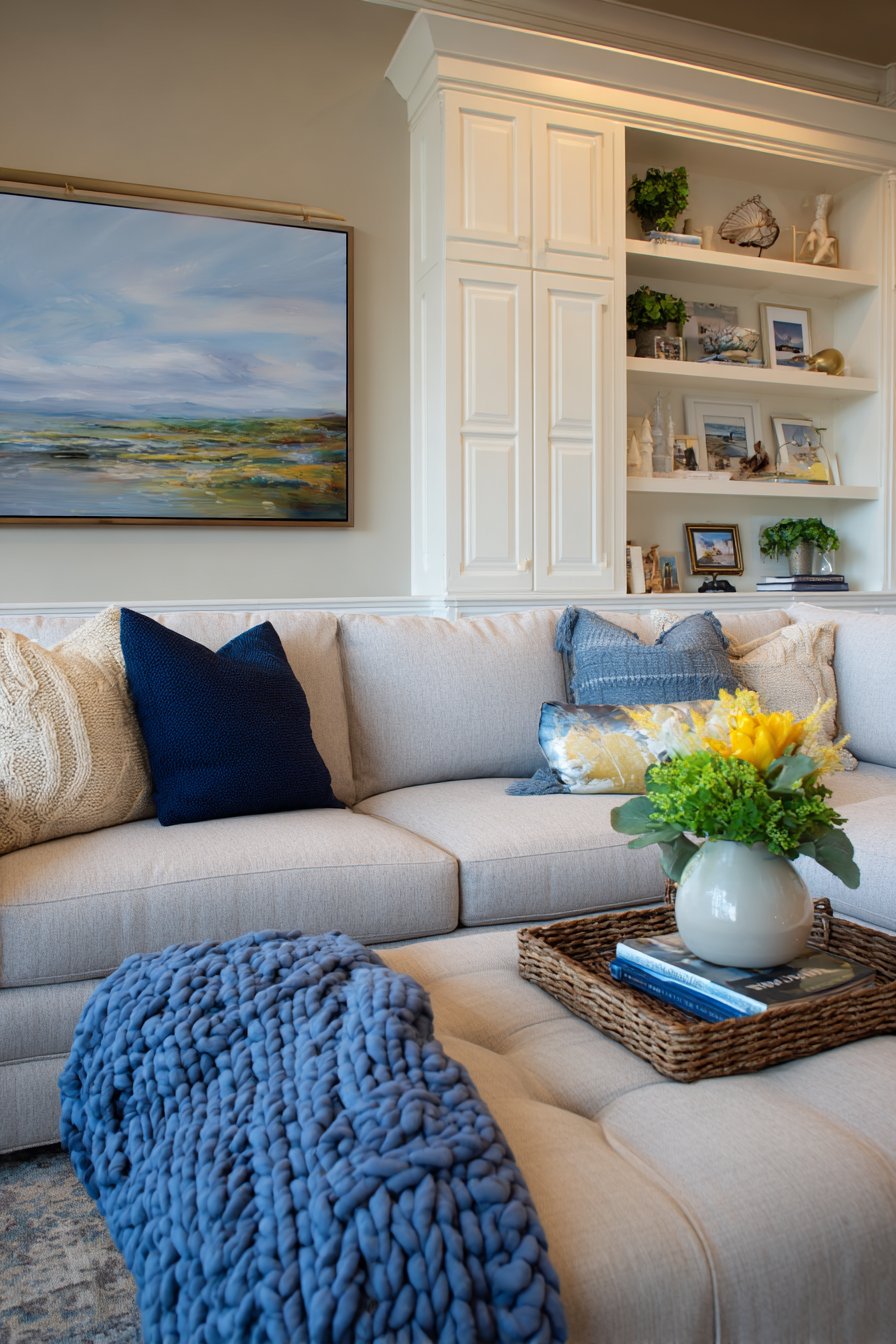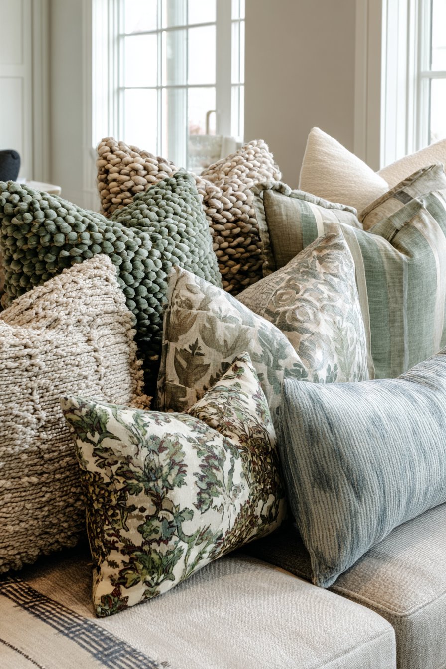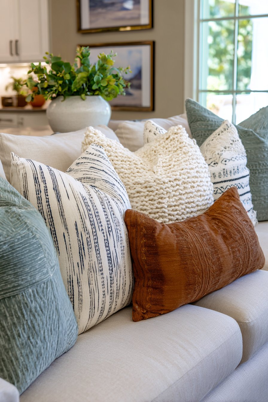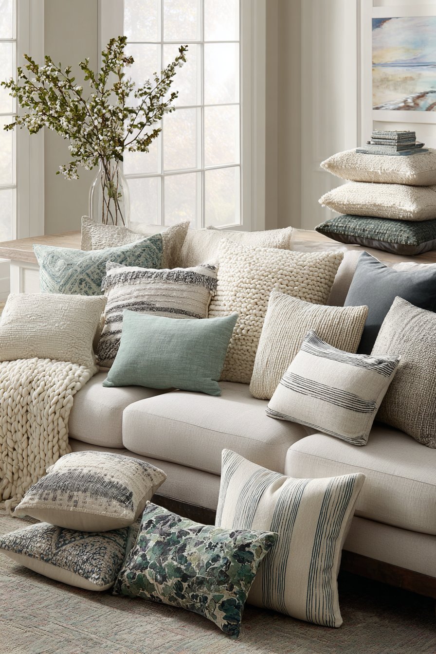 The art of pillow arrangement might seem simple, but this design reveals how thoughtfully chosen and arranged throw pillows can transform a neutral sofa into a cozy focal point. The collection includes chunky knit covers that add substantial texture and handmade appeal, linen pillows with subtle stripes that introduce pattern without overwhelming, velvet cushions in muted jewel tones that catch light beautifully, and patterned options with geometric or botanical prints that add visual interest. The cohesive color palette of warm neutrals, soft blues, and earthy greens ensures that despite the variety, the overall effect remains harmonious and intentional.