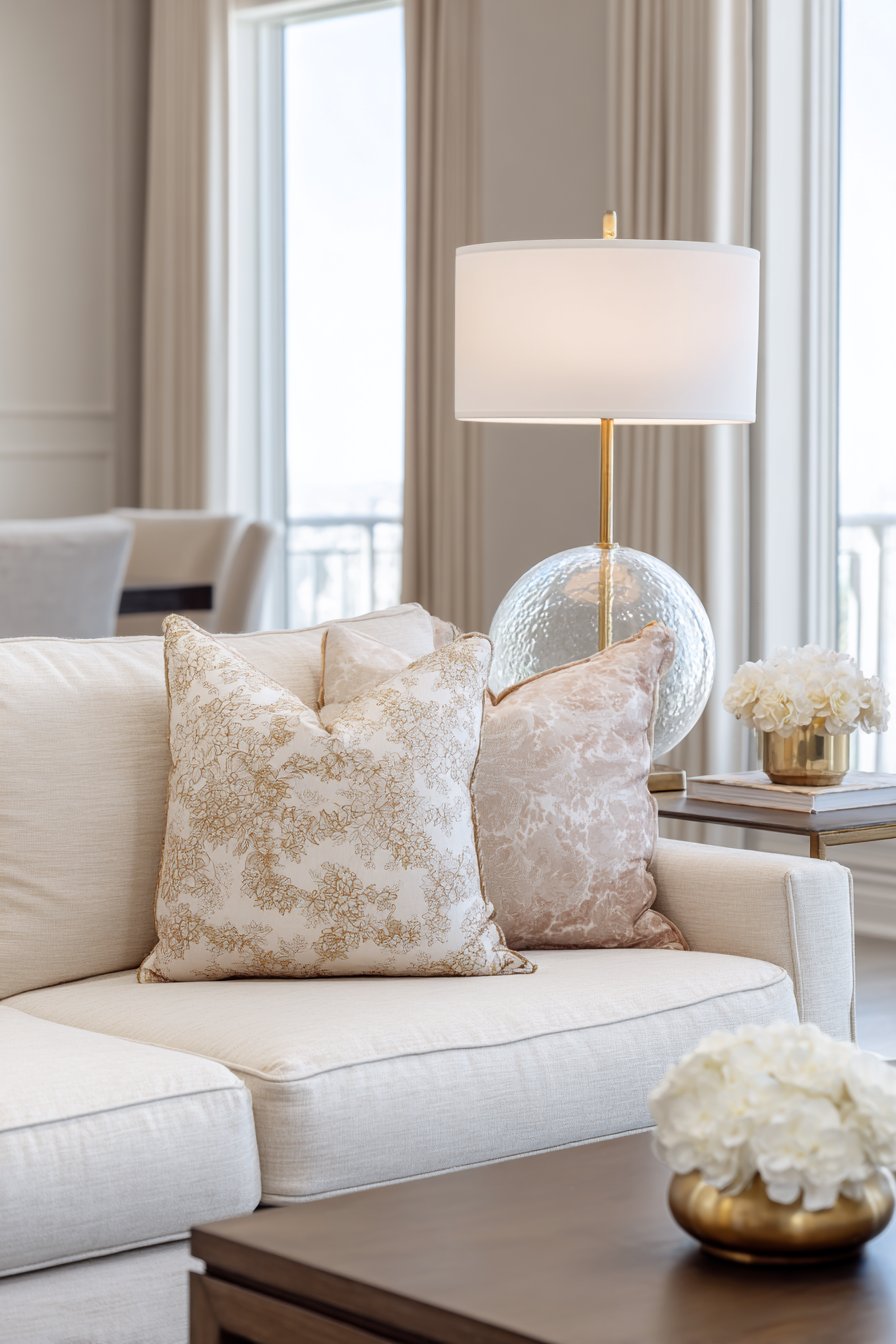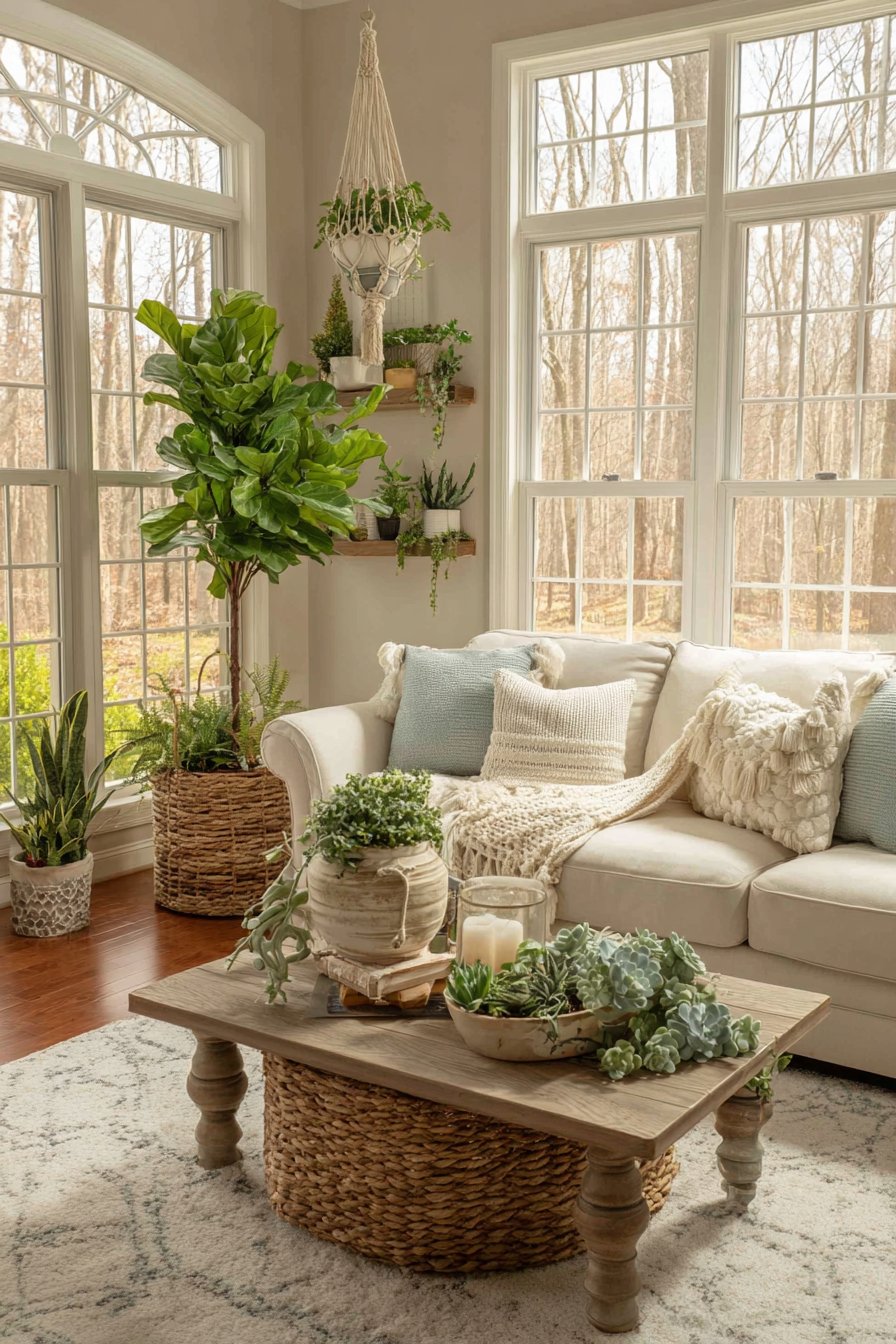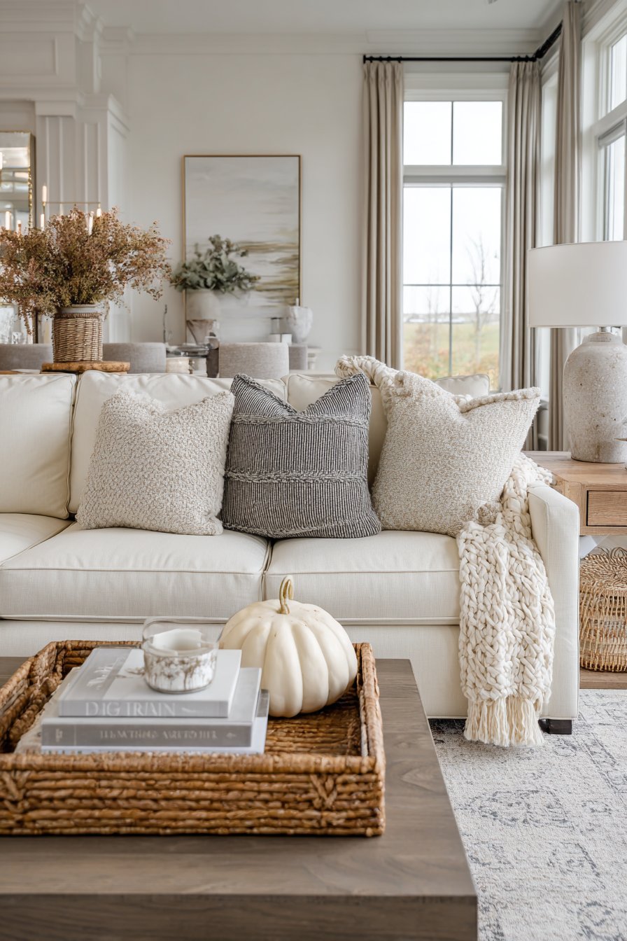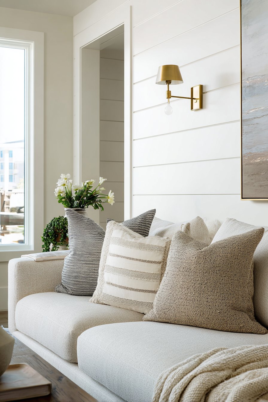 The art of pillow arrangement might seem simple, but this design reveals how thoughtfully chosen and arranged throw pillows can transform a neutral sofa into a cozy focal point. The collection includes chunky knit covers that add substantial texture and handmade appeal, linen pillows with subtle stripes that introduce pattern without overwhelming, velvet cushions in muted jewel tones that catch light beautifully, and patterned options with geometric or botanical prints that add visual interest. The cohesive color palette of warm neutrals, soft blues, and earthy greens ensures that despite the variety, the overall effect remains harmonious and intentional.