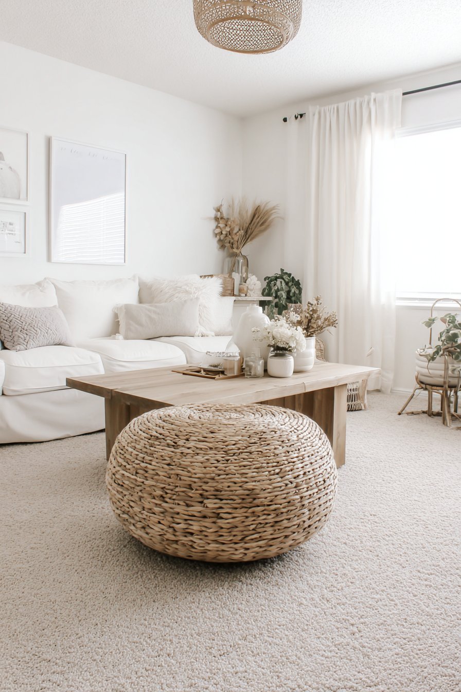 The layering of textures in this space creates exceptional visual warmth without relying on color for impact. The rough, tactile quality of jute contrasts beautifully with smooth linen upholstery, while the turned wood details of the coffee table add another textural dimension. This approach proves that neutral doesn’t mean boring—when you layer varied textures in similar color tones, you create sophisticated depth that remains calming and cohesive. The space invites touch as much as sight, engaging multiple senses in the experience of comfort.