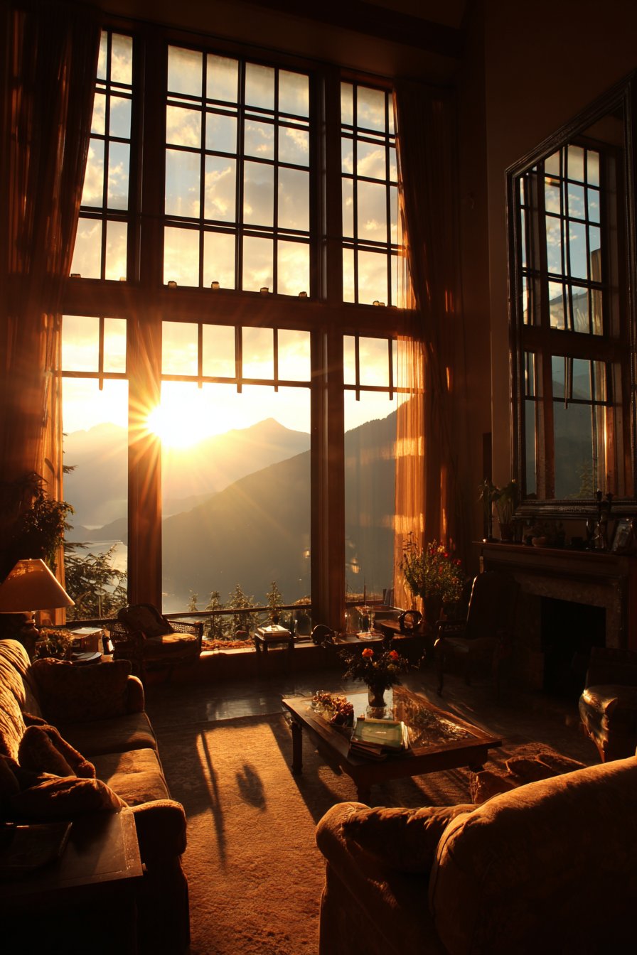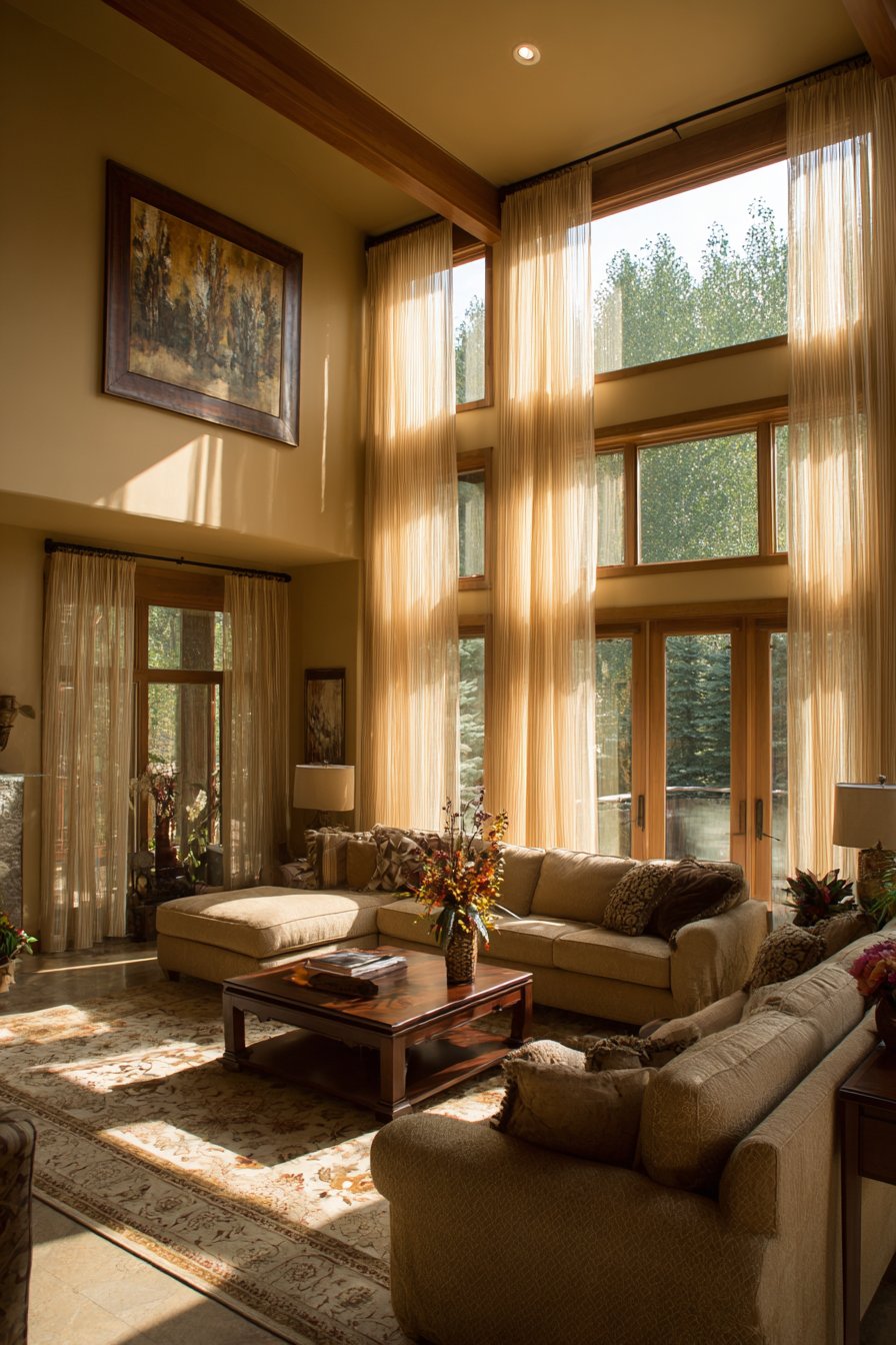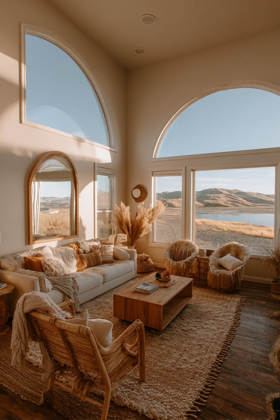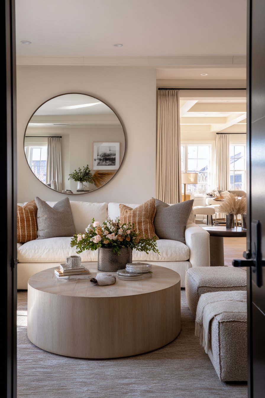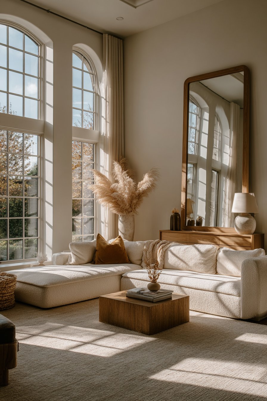 Light transforms spaces, and this design demonstrates strategies for maximizing natural illumination while maintaining warmth and coziness. Large windows feature minimal treatments that allow maximum light penetration—perhaps sheer panels or simple Roman shades that can be raised completely during the day. A large mirror with simple wood frame hangs opposite the windows, reflecting and amplifying natural light throughout the room while creating the illusion of additional windows. Light-colored walls in warm whites and furnishings in neutral tones further enhance the bright, airy feeling. Strategic placement of reflective surfaces and the absence of heavy, light-blocking furniture near windows ensures illumination reaches every corner.