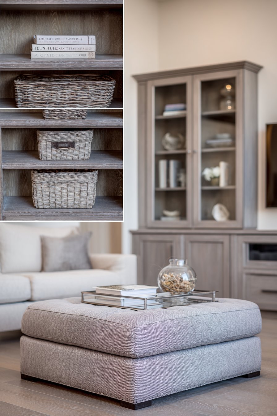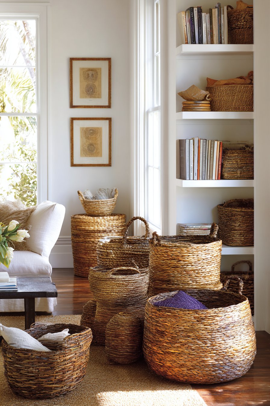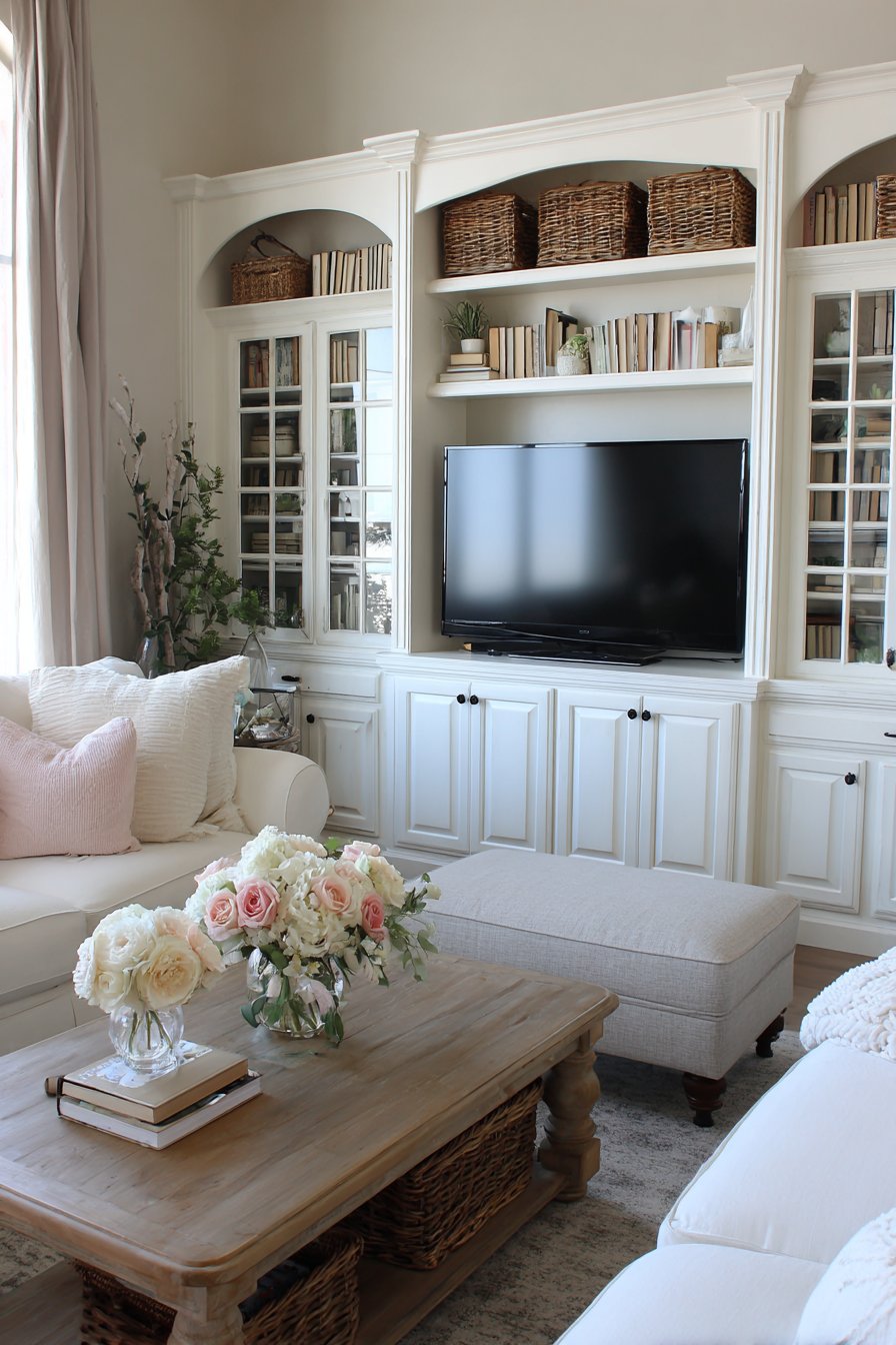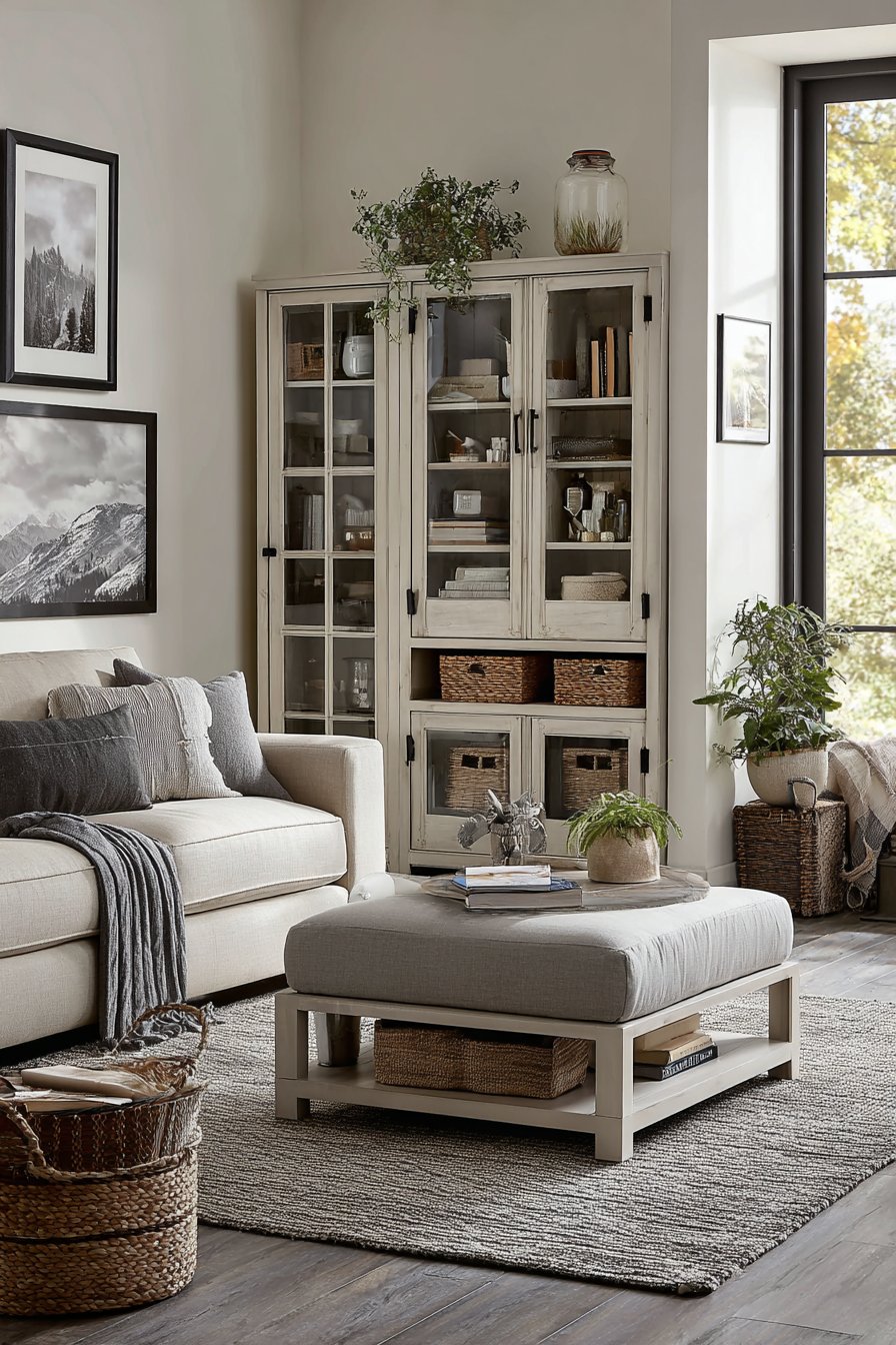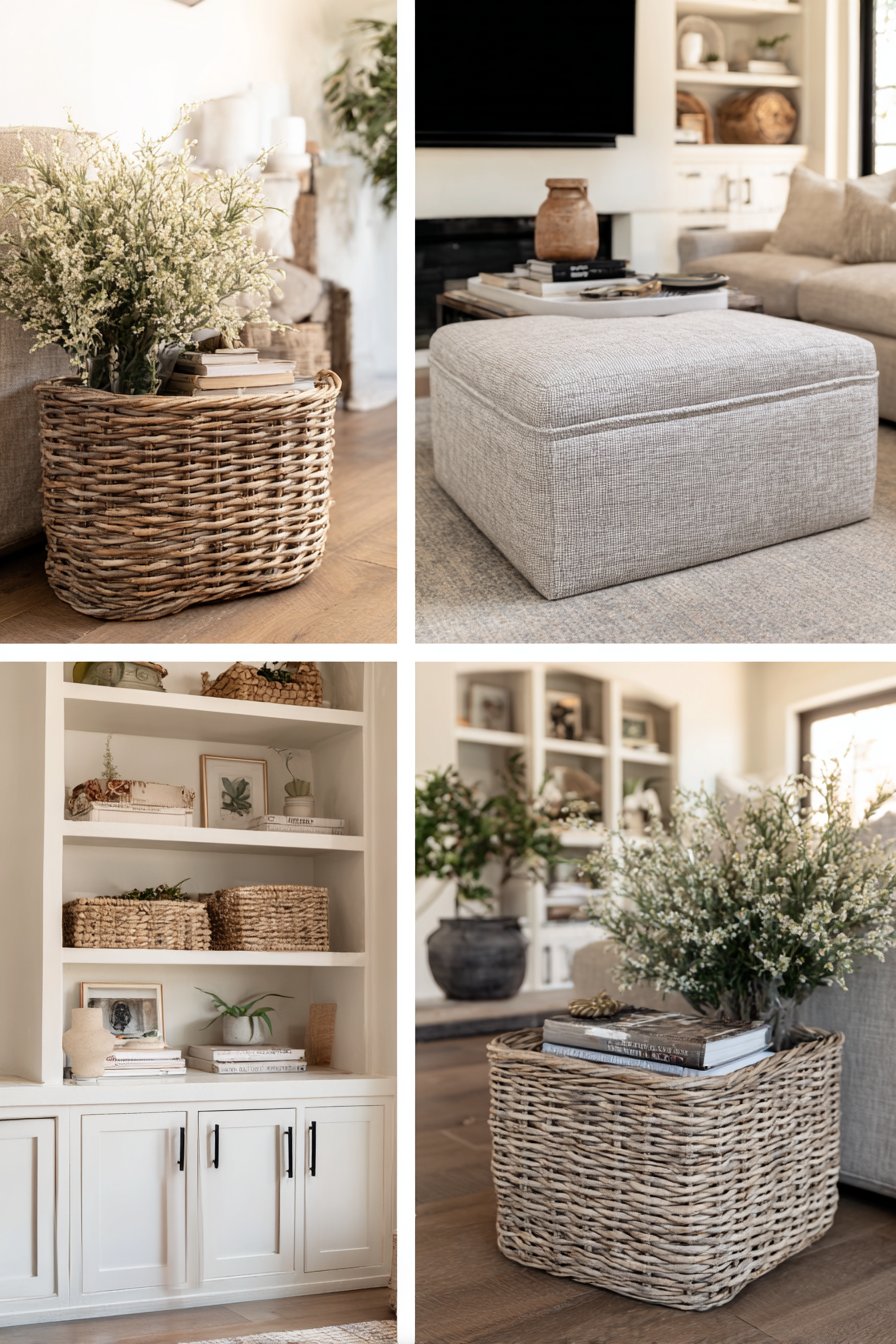 The lower shelf storage demonstrates smart design thinking for cozy, lived-in spaces. Woven baskets conceal the everyday items that tend to accumulate—remote controls, coasters, reading glasses, magazines—keeping them accessible but visually contained. This approach acknowledges that truly cozy living rooms are used and enjoyed, not just displayed, and provides solutions for managing the items that make life comfortable without sacrificing aesthetic appeal.