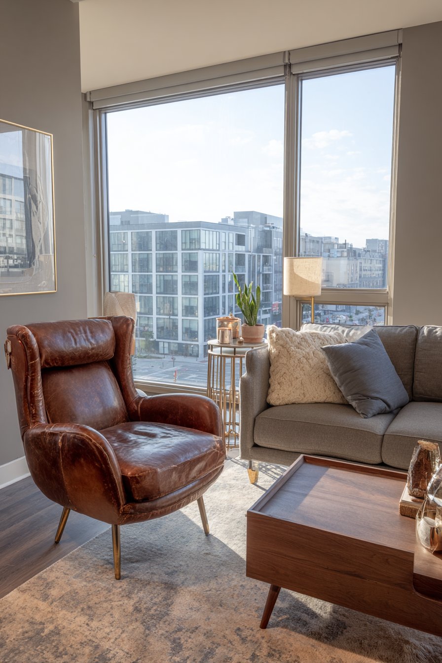 There’s something inherently peaceful about a dedicated reading nook, especially when positioned to capture natural daylight. This design concept centers on an oversized armchair upholstered in warm caramel leather that develops a beautiful natural patina over time, telling the story of countless hours spent lost in books. The chair’s generous proportions provide the kind of enveloping comfort that makes it difficult to leave, while the leather’s warmth and character add a sophisticated yet approachable element to the space.