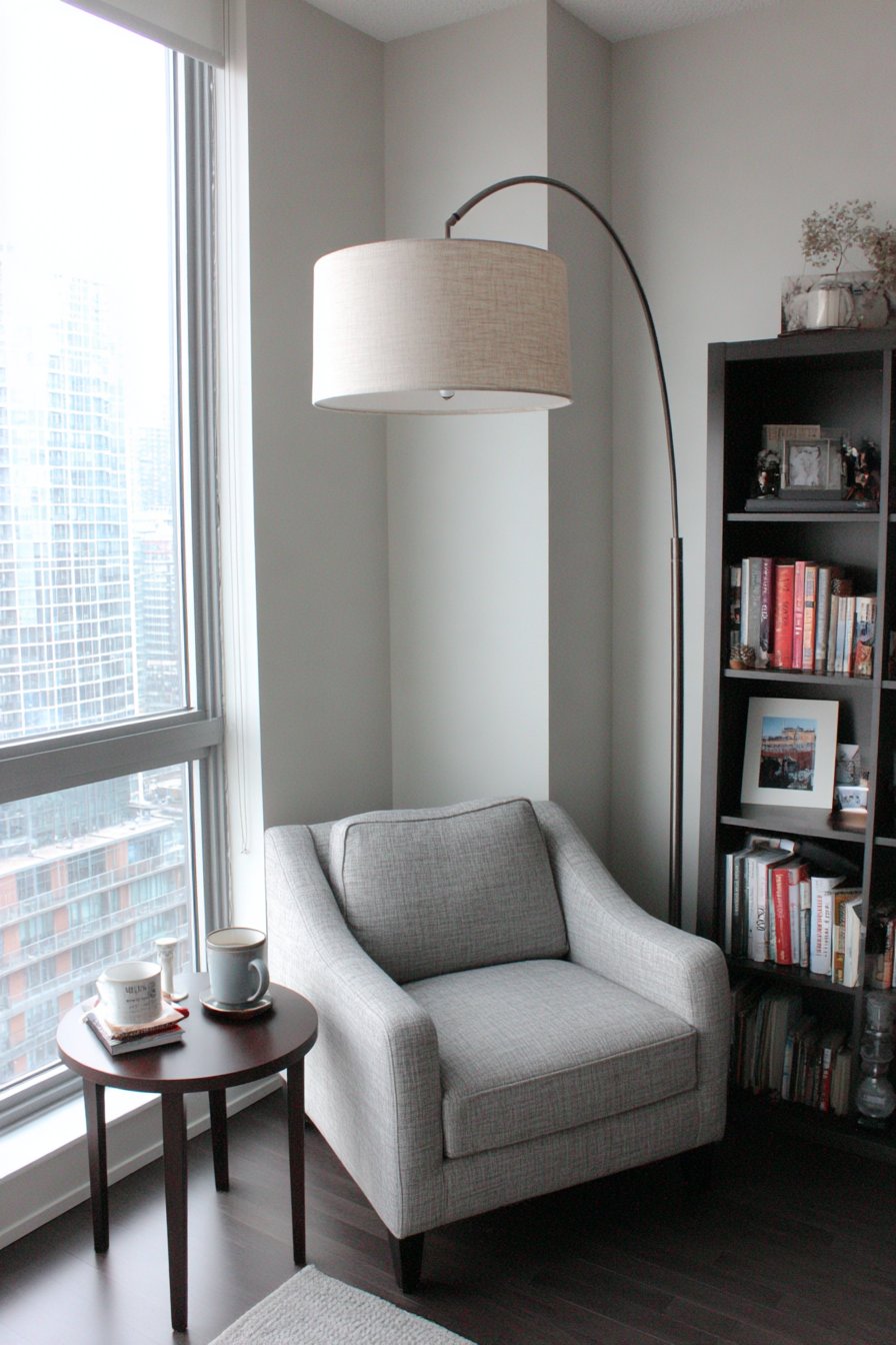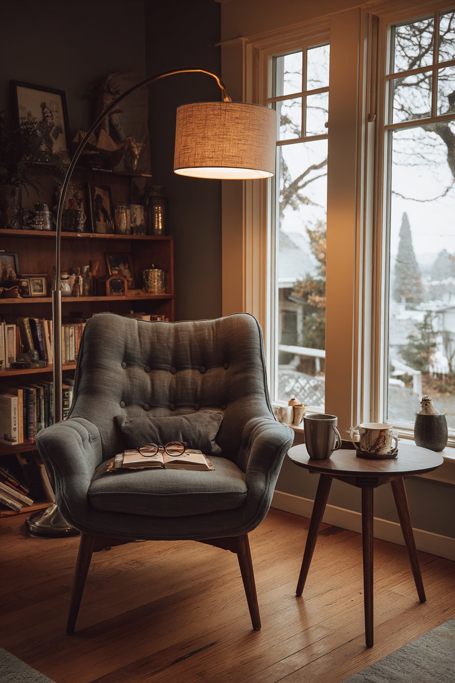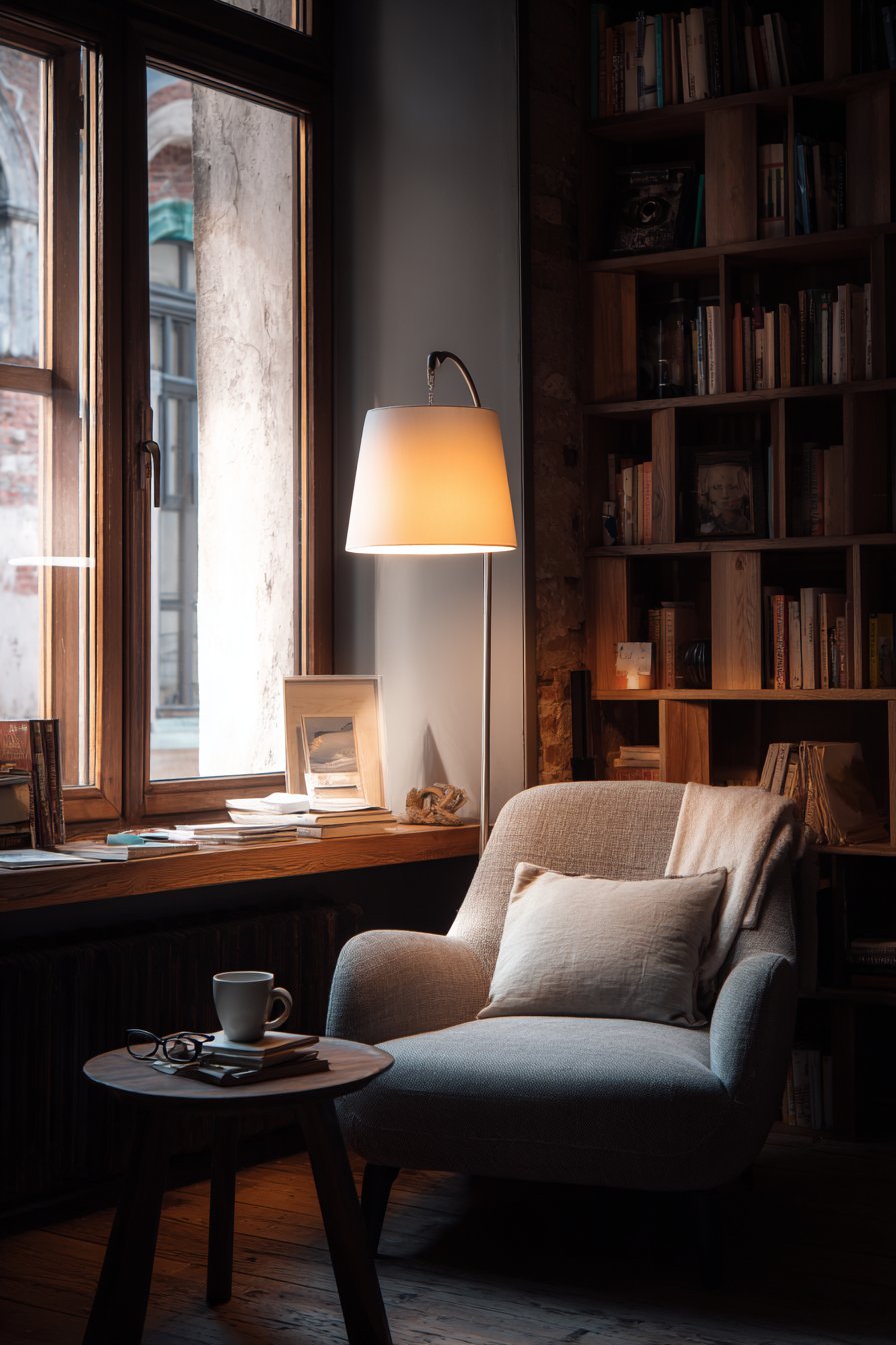 What elevates this corner from merely functional to truly cozy is its personal nature. The bookshelf displays aren’t perfectly styled—they show the reality of a well-read collection with books of varying sizes, some worn spines indicating favorites, personal mementos interspersed that trigger memories. The corner receives natural light but feels enclosed and safe, creating that essential sense of retreat. The soft grey linen of the chair invites sinking in for extended periods, while the adjustable lamp ensures you can read comfortably whatever the time of day. This is a space designed by and for someone who truly loves reading, and that authenticity creates its appeal.