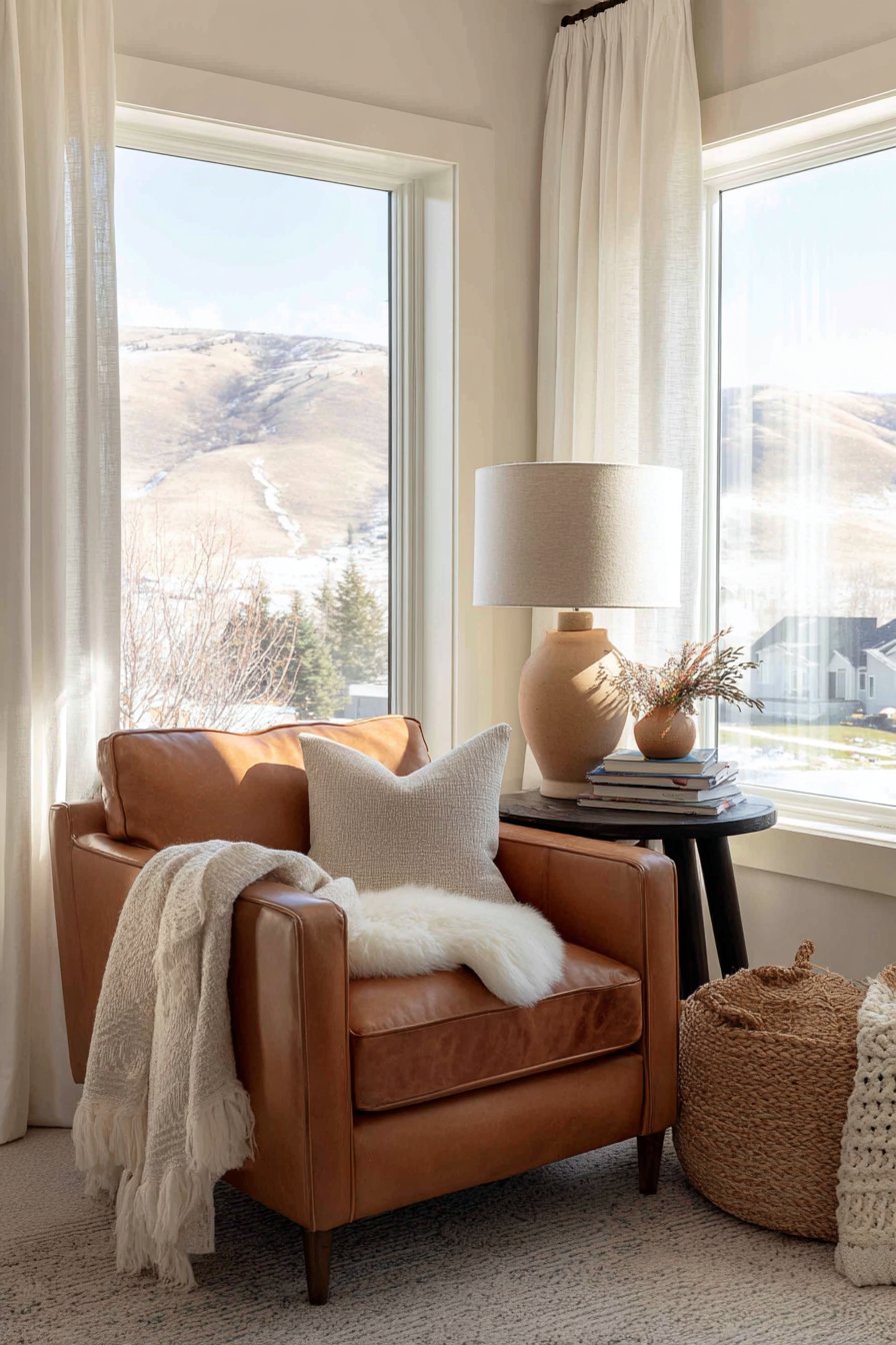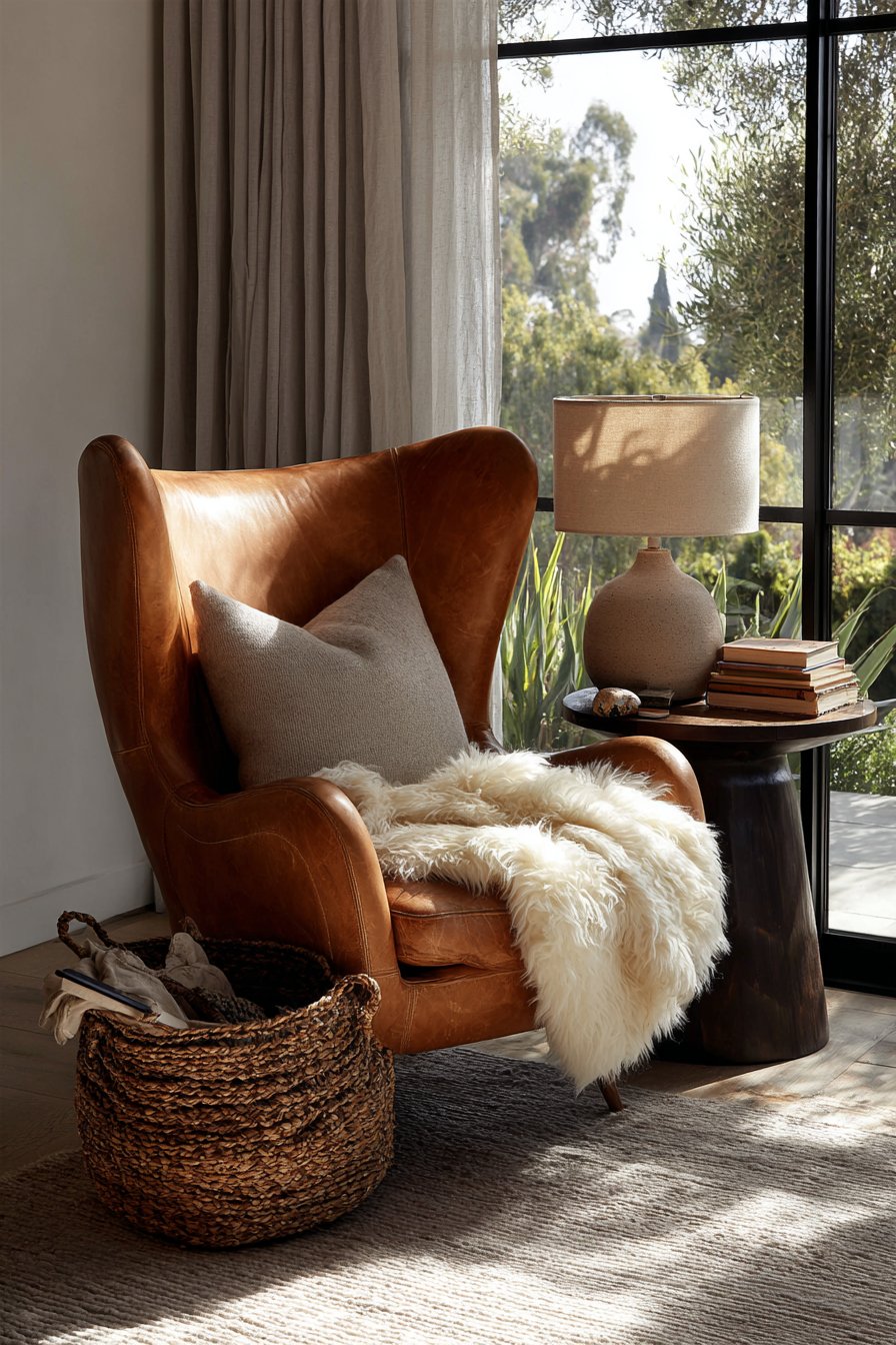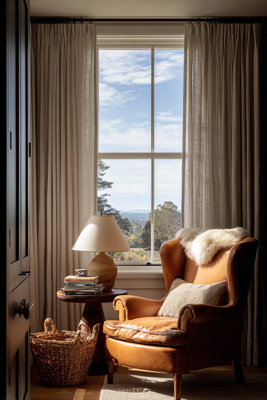 The supporting elements in this vignette are thoughtfully chosen to enhance both function and atmosphere. A small round side table in dark walnut provides the perfect perch for a ceramic table lamp with a linen shade—essential for extending reading hours into the evening. The stack of well-loved books on the table surface speaks to the space’s purpose while adding vertical interest and personal character. The sheepskin throw draped over the chair back introduces another layer of texture and warmth, inviting you to snuggle in during cooler months.