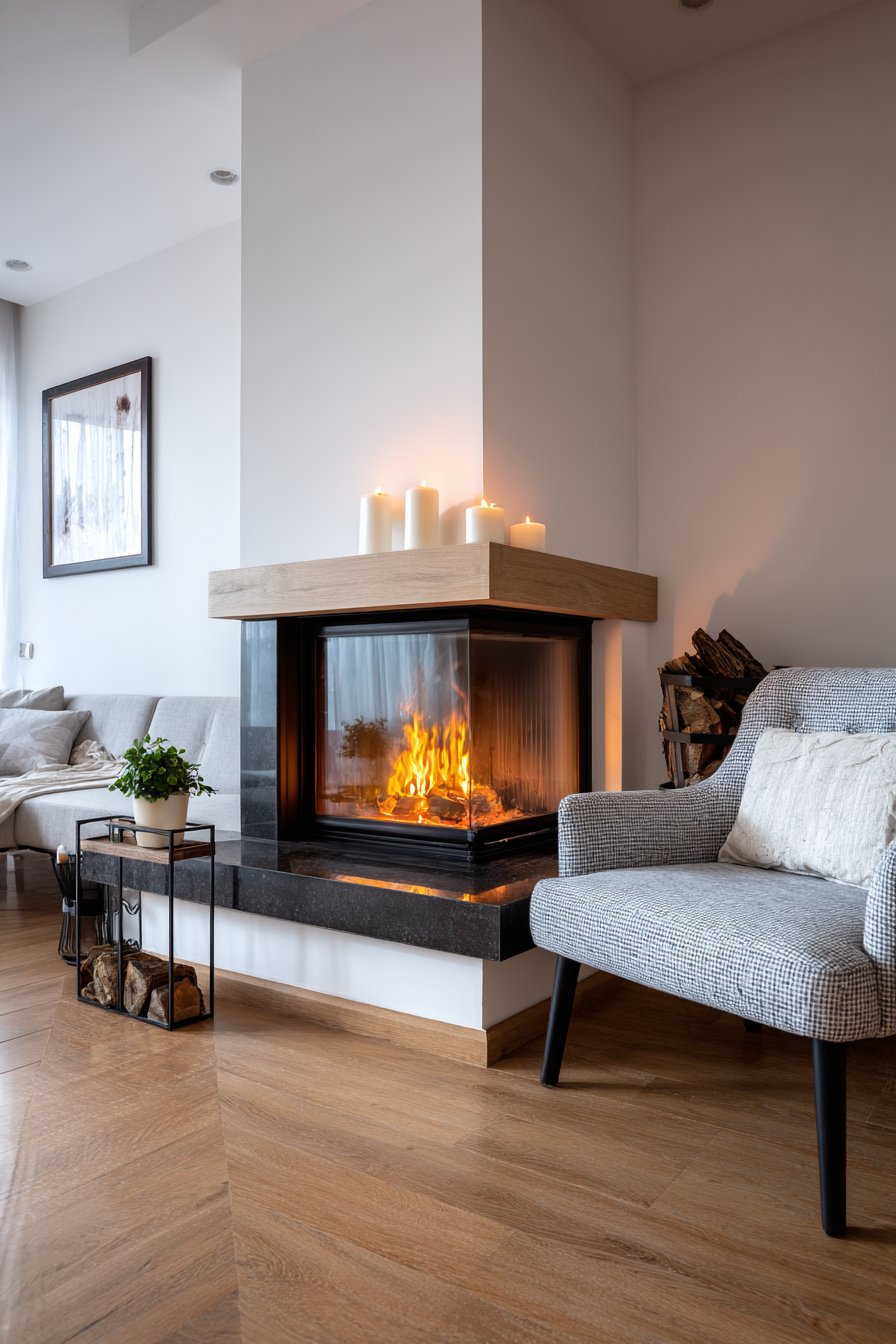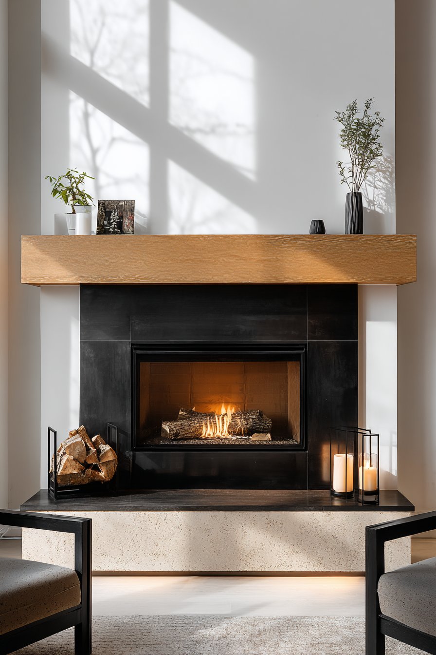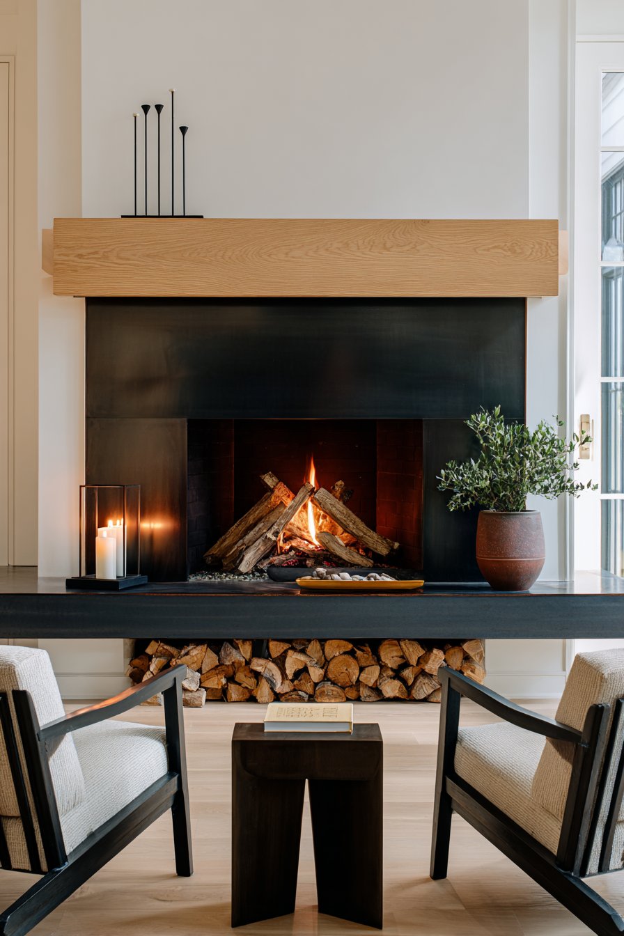 A fireplace can serve as a cozy focal point even in contemporary spaces, and this design demonstrates how minimalist aesthetics can create warmth. The fireplace features a sleek black metal surround that creates strong visual contrast against white walls, its clean lines embodying modern simplicity. A simple wooden mantel in light oak provides the perfect perch for minimal styling—a few pieces of decorative firewood in a black metal holder that’s both functional and sculptural, two pillar candles, and a small potted plant. Two comfortable chairs face the fireplace, creating an intimate conversation area that capitalizes on the focal point.