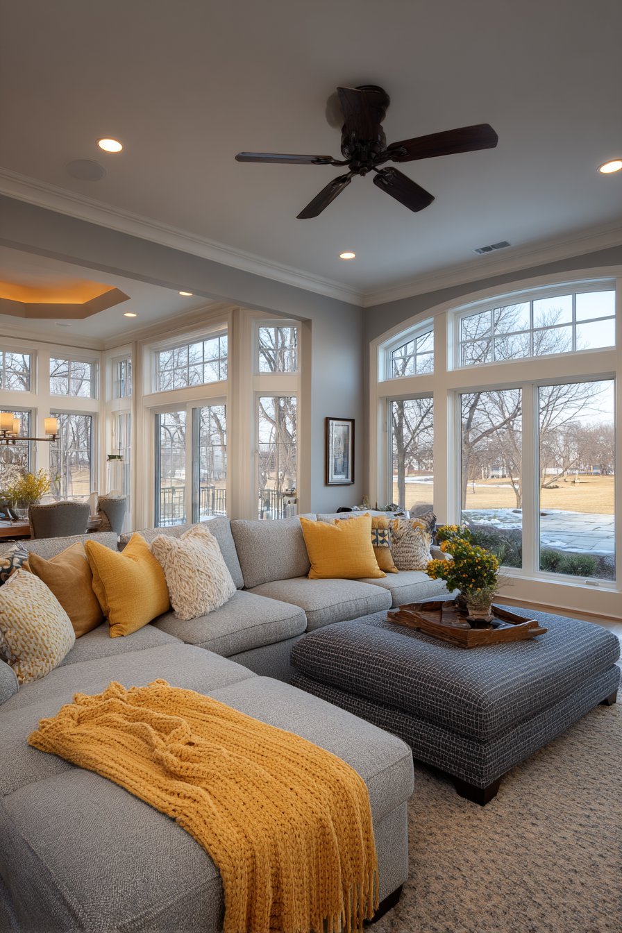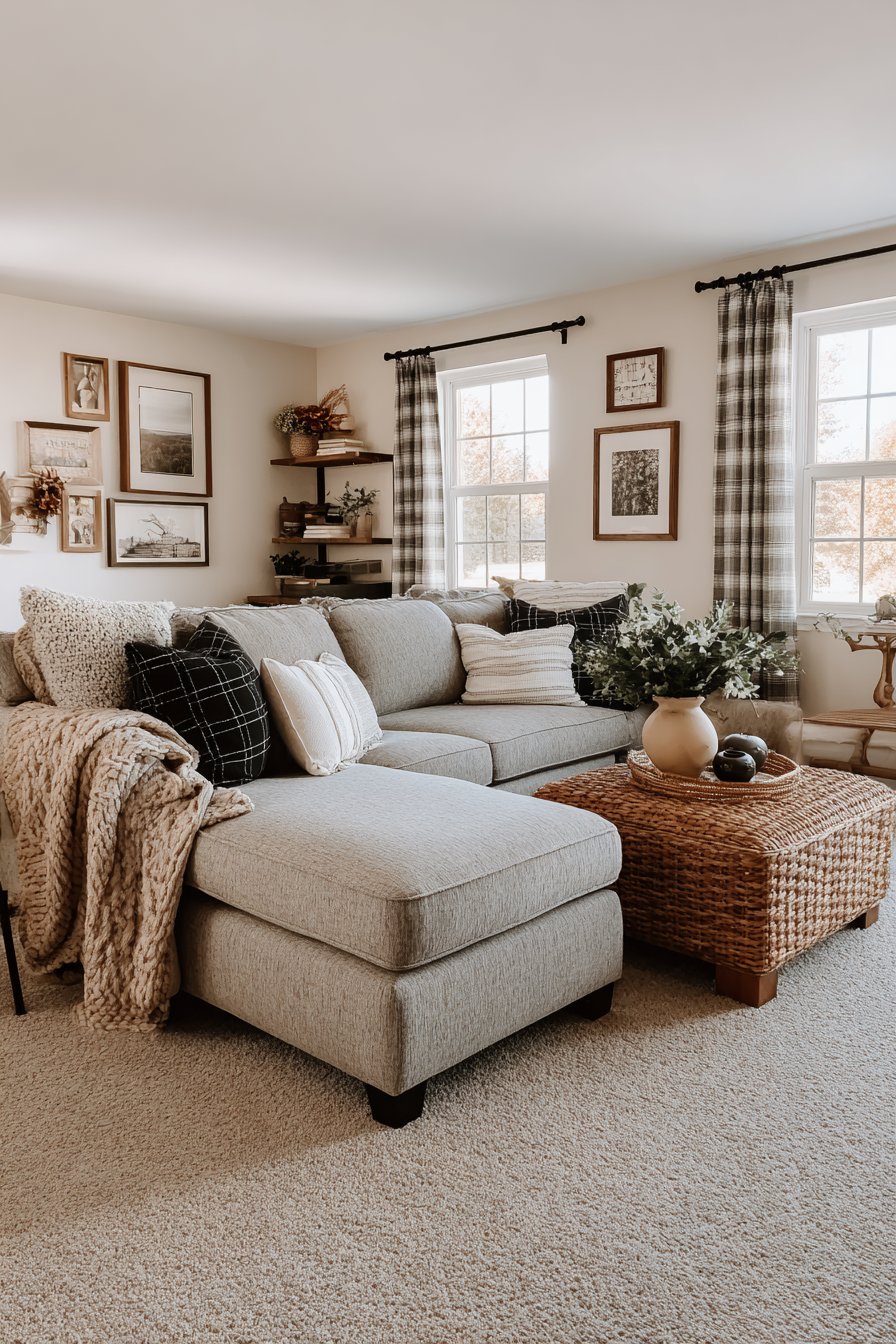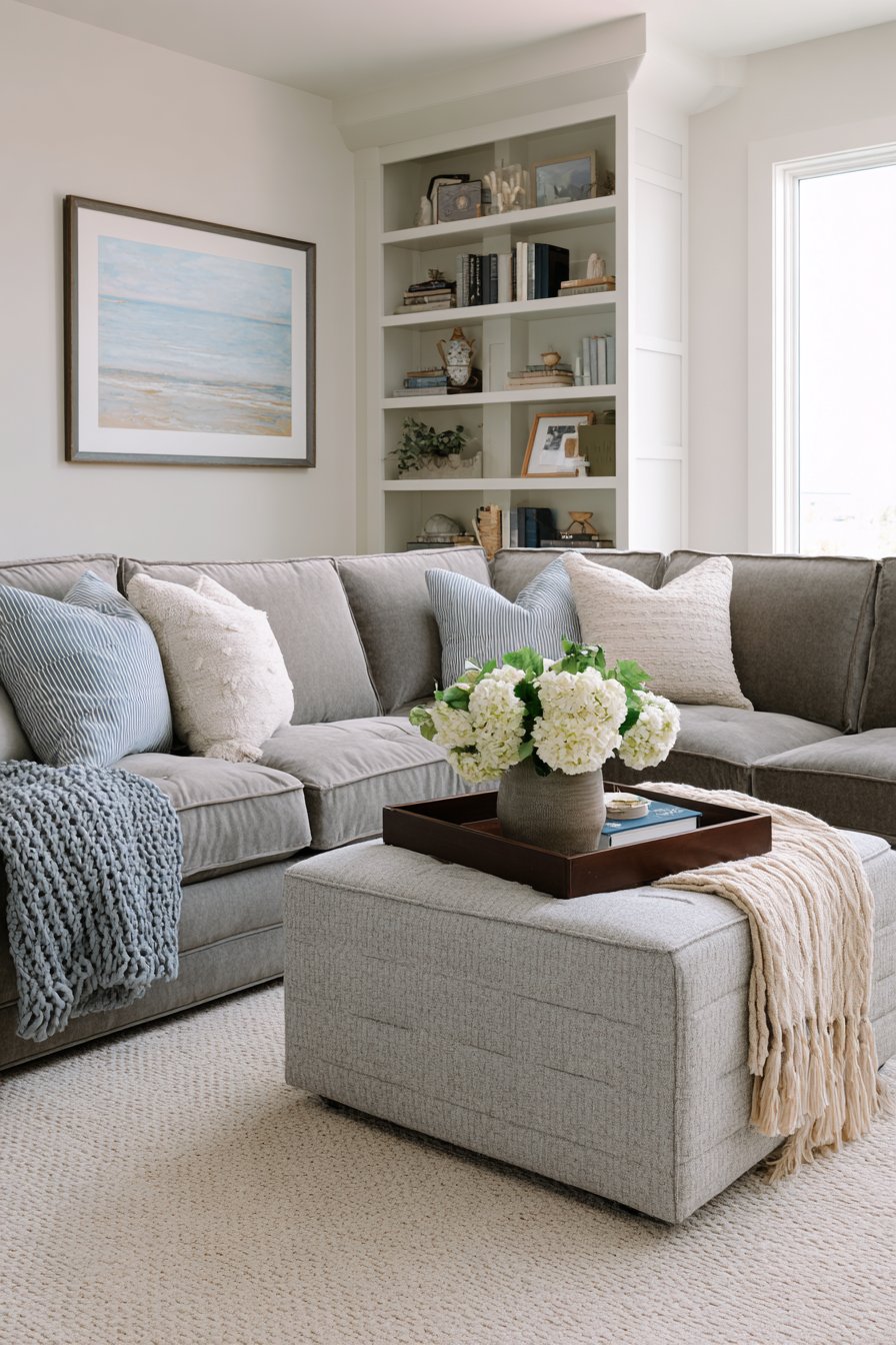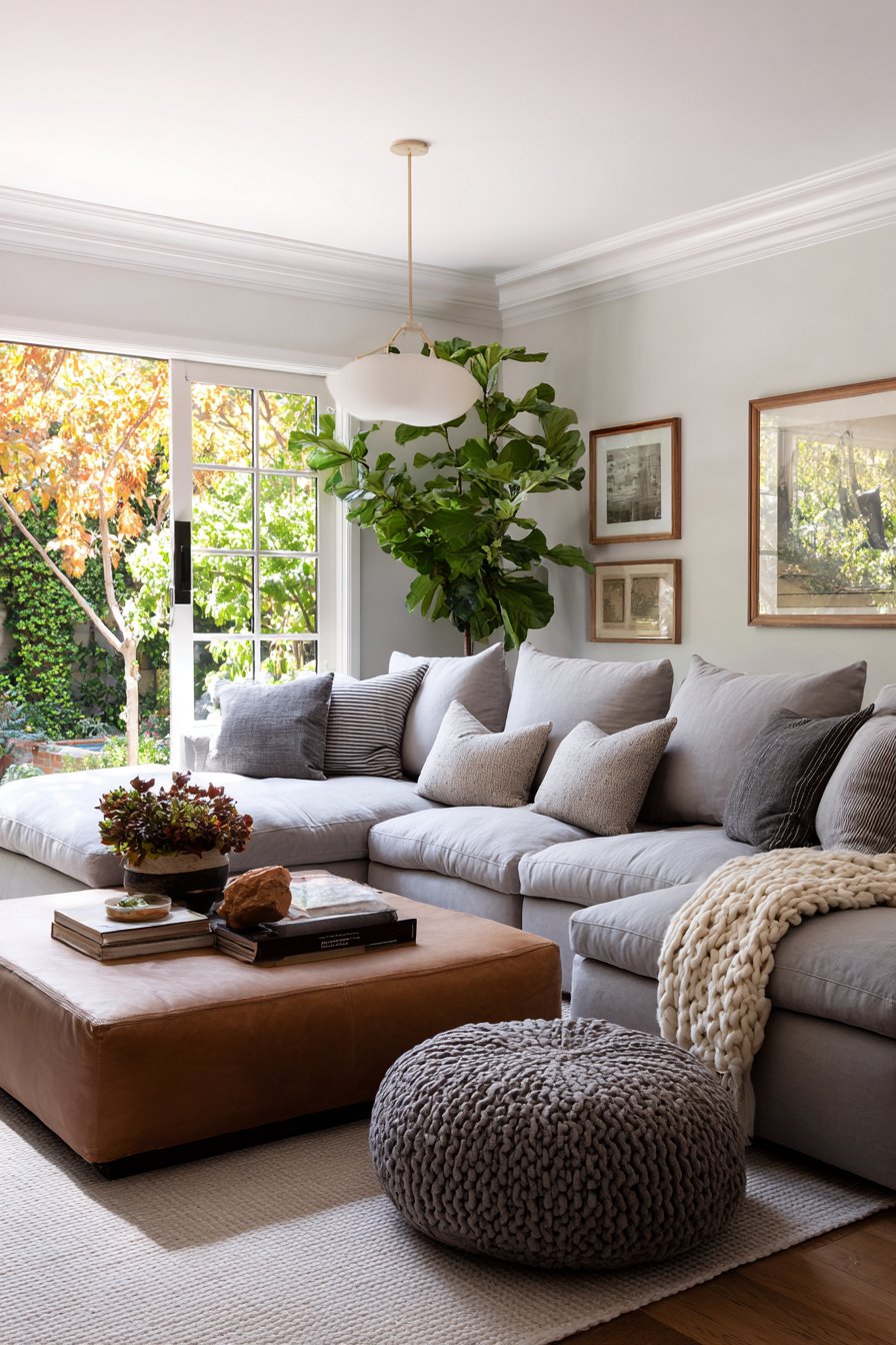 A family living room must balance style with durability and function, and this sectional configuration demonstrates how to achieve that balance beautifully. The sectional sofa features performance fabric upholstery in warm grey with subtle texture—beautiful enough for design appeal, durable enough for daily family use including kids and pets. The generous proportions include a chaise end perfect for stretching out, while the L-shape configuration creates defined seating that naturally encourages gathering. Multiple pillows and a cable-knit throw add comfort and coziness, while a large ottoman serves triple duty as coffee table, extra seating, and footrest.