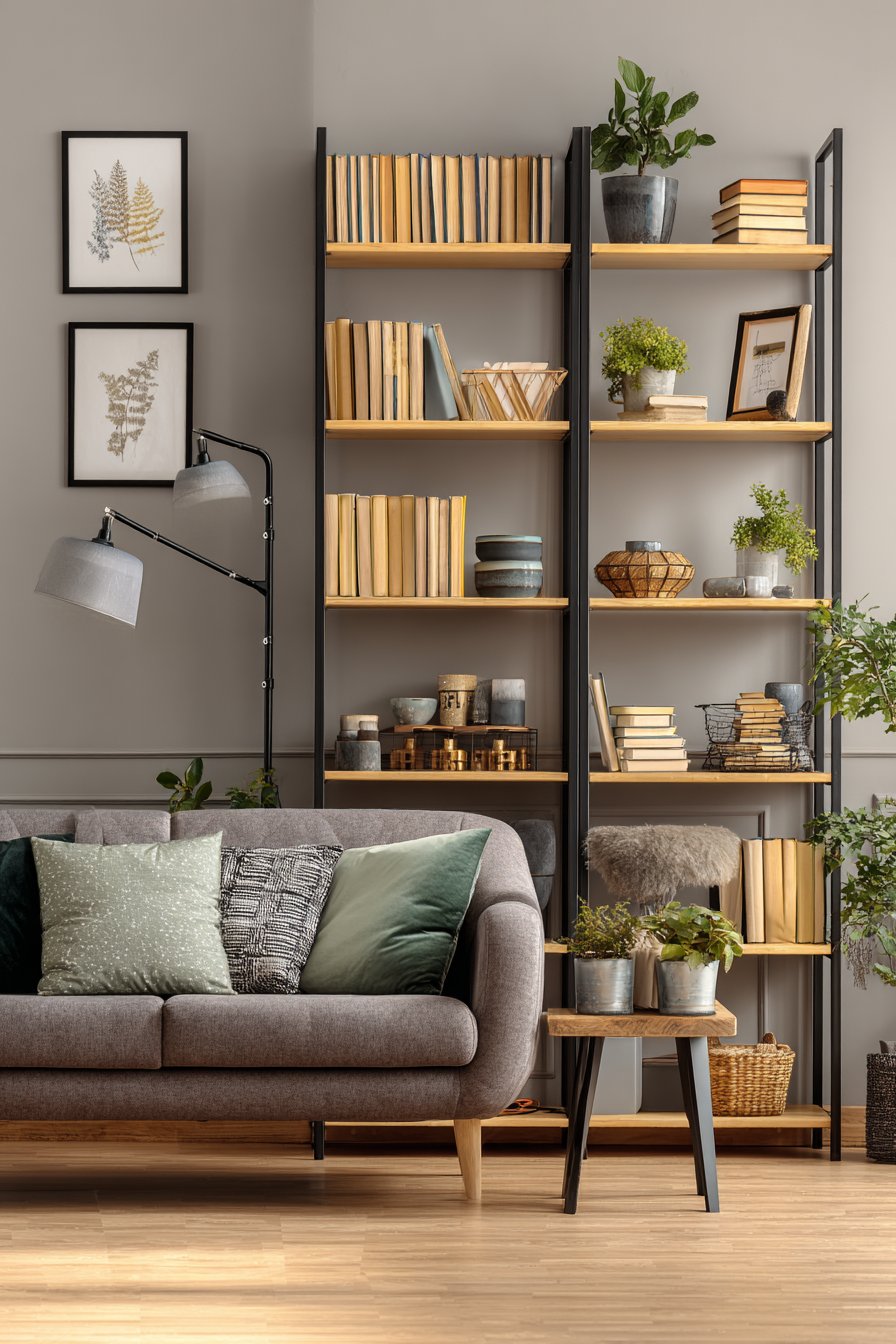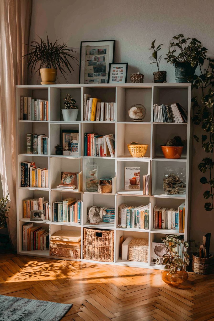 The integration of decorative elements demonstrates restraint and purpose. Plants aren’t scattered randomly but placed thoughtfully to create visual balance—perhaps a trailing pothos on an upper shelf with a small succulent below. Decorative bowls might hold small items like paper clips or bookmarks, combining beauty with function. Framed photos appear in strategic locations, creating focal points without overwhelming. Woven baskets on lower shelves provide attractive homes for items that don’t need to be visible but should be accessible. This is styling that respects both form and function, creating a shelf that’s beautiful to look at and practical to use.