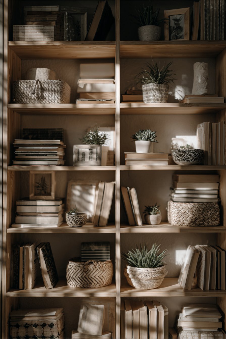 A well-styled bookshelf balances aesthetics with functionality, and this design demonstrates the art of creating visual interest while maintaining practical book storage. Books are arranged in varied orientations—some vertical in traditional fashion, others horizontal in stacks that create visual rhythm and provide platforms for decorative objects. Small potted plants intersperse throughout, adding life and organic form that softens the linear nature of shelving. Decorative bowls, framed photos, and woven baskets provide additional visual interest while serving practical purposes. The overall effect feels intentional yet not overly designed, as if the shelf evolved naturally over time.