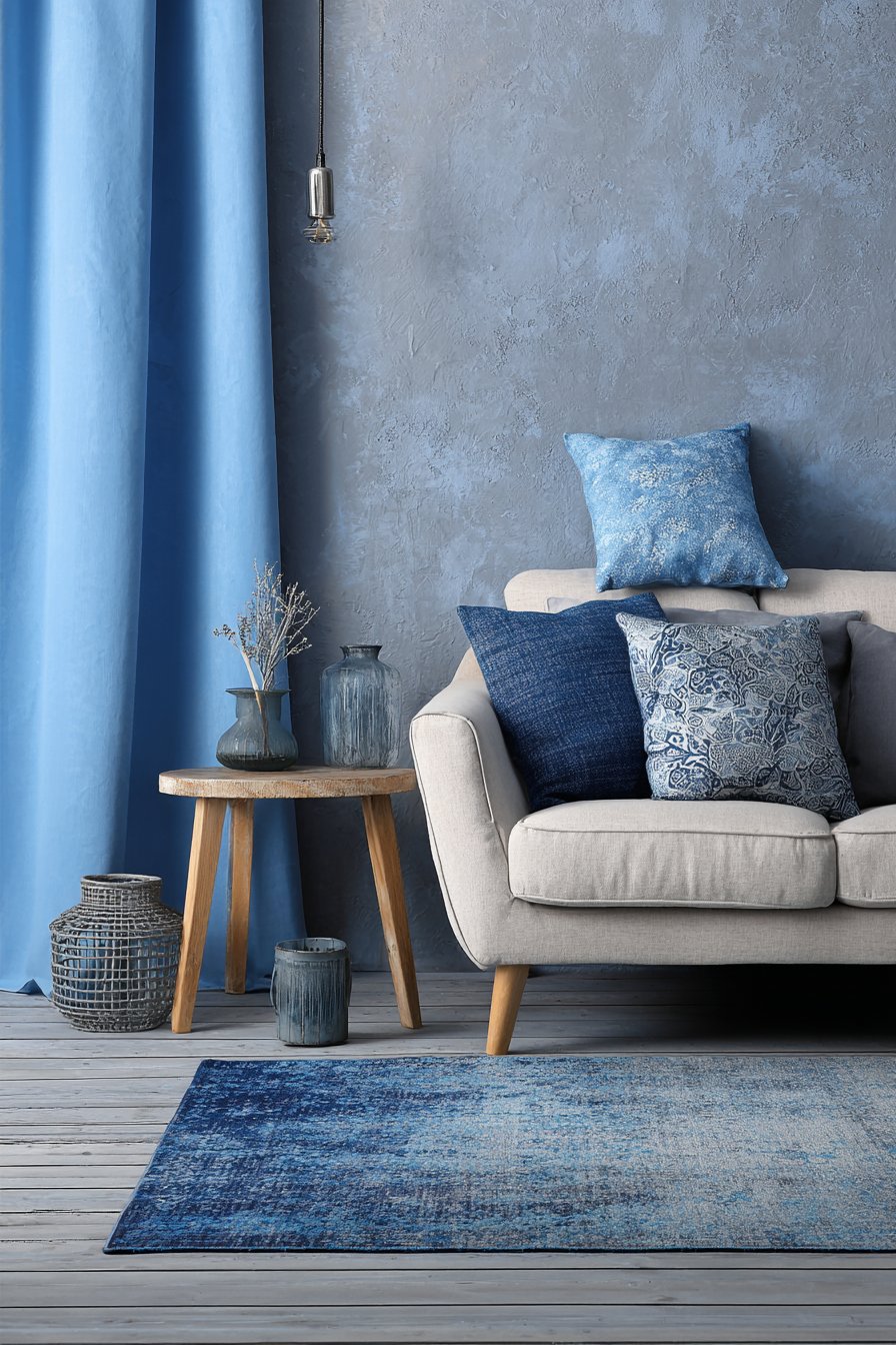 A monochromatic color scheme creates sophisticated cohesion while allowing for surprising depth, and this blue-based palette demonstrates the approach beautifully. Soft blues range from pale sky blue on walls to deeper slate blue in accent pillows, with medium blue-grey curtains and a faded blue vintage rug bridging the tonal range. Natural wood furniture and cream-colored upholstery prevent the blue palette from feeling cold, introducing warmth that balances the cool tones. The varied shades create visual depth while maintaining serene, harmonious atmosphere that feels calming yet visually interesting.