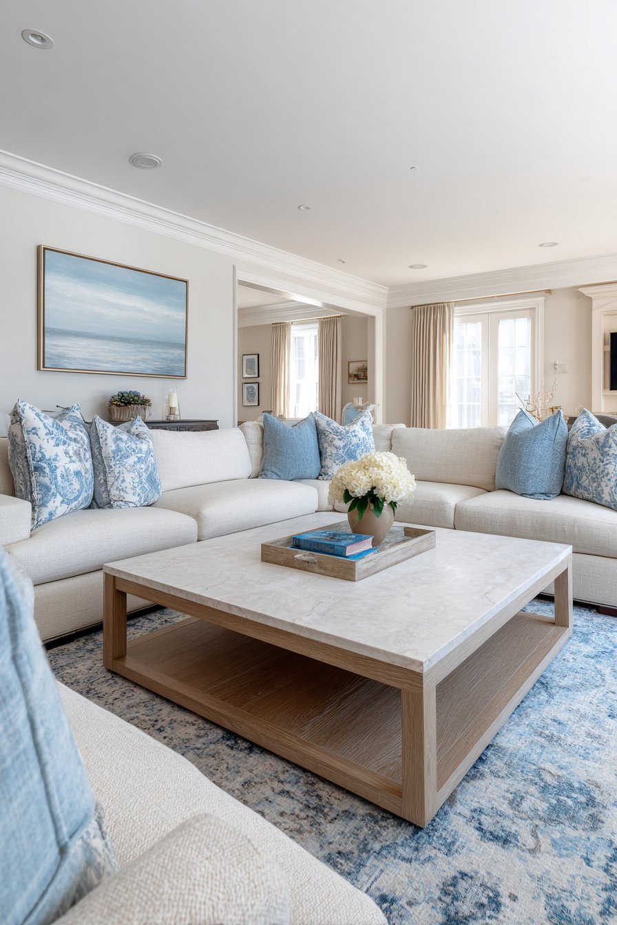 The introduction of warm elements prevents this cool color scheme from feeling cold or unwelcoming. Natural wood in honey or walnut tones adds essential warmth, while cream upholstery provides neutral relief from the blue saturation. These warm elements might constitute only 20-30% of the room’s color story, but their impact is significant in creating balance and livability. The result is a room that feels serene and cohesive through its color discipline while remaining warm and welcoming through thoughtful material choices—proving that cool colors can indeed create cozy atmospheres when balanced appropriately.