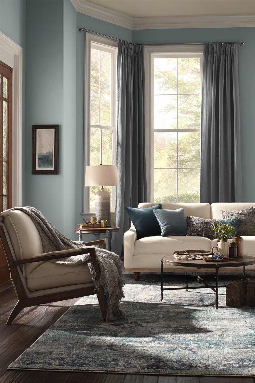 The success of this monochromatic approach relies on varying the value (lightness and darkness) and saturation (intensity) of blue rather than introducing many different hues. Pale wall blue provides an airy backdrop that makes the room feel spacious and peaceful. Medium blue-grey curtains add substance without heaviness, their soft drape creating vertical interest. Deeper slate blue pillows create focal points and visual anchors, preventing the lighter blues from floating away. The faded vintage rug ties all the tones together while introducing pattern and additional color variation through age-related fading and patina.