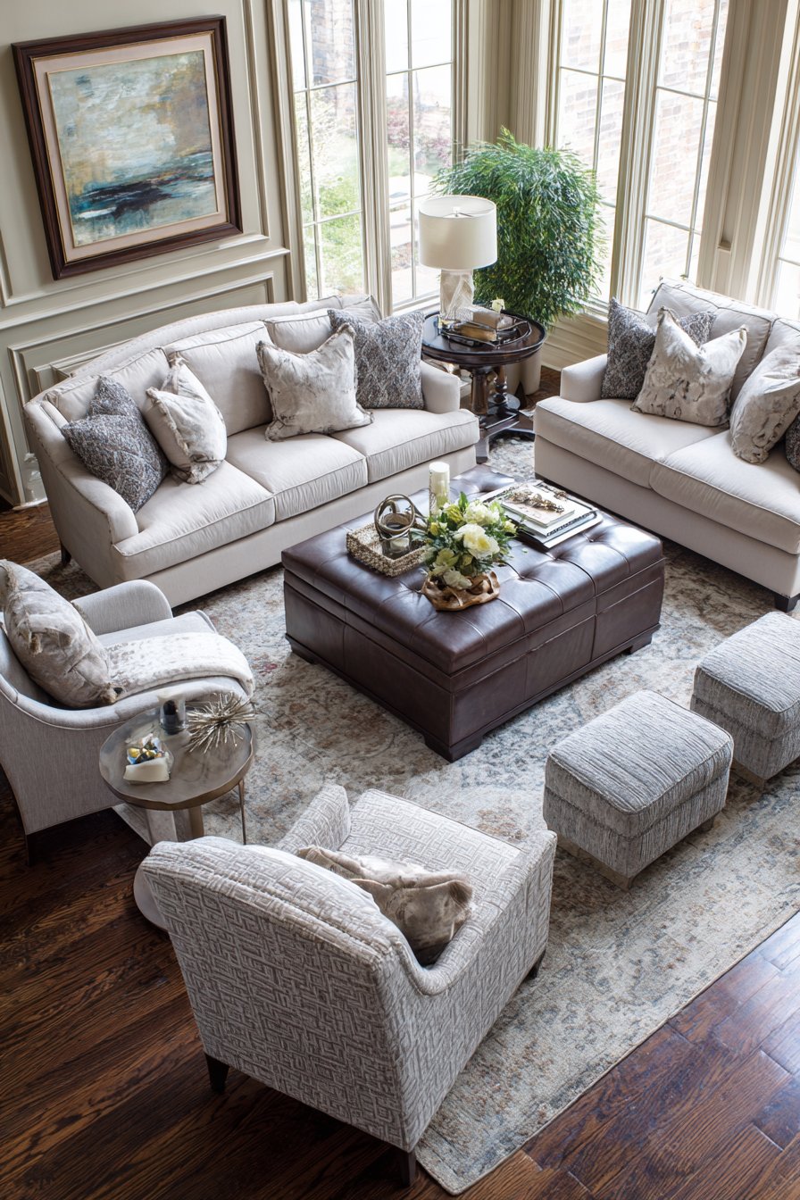 - Include varied seating options (sofa, chairs, ottoman) to accommodate different preferences and numbers of people