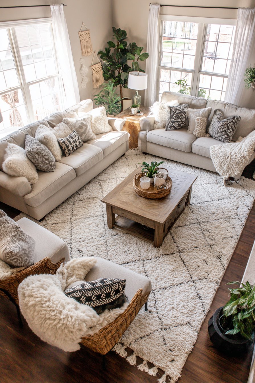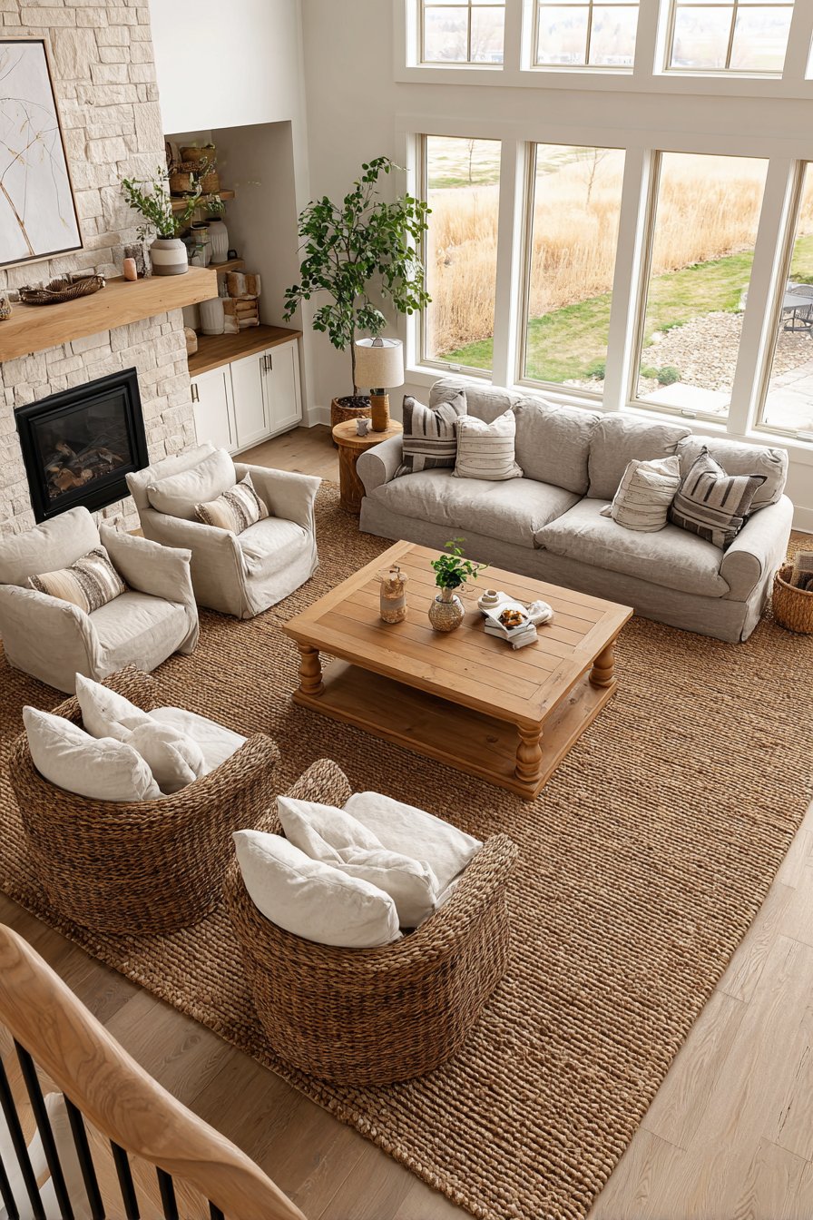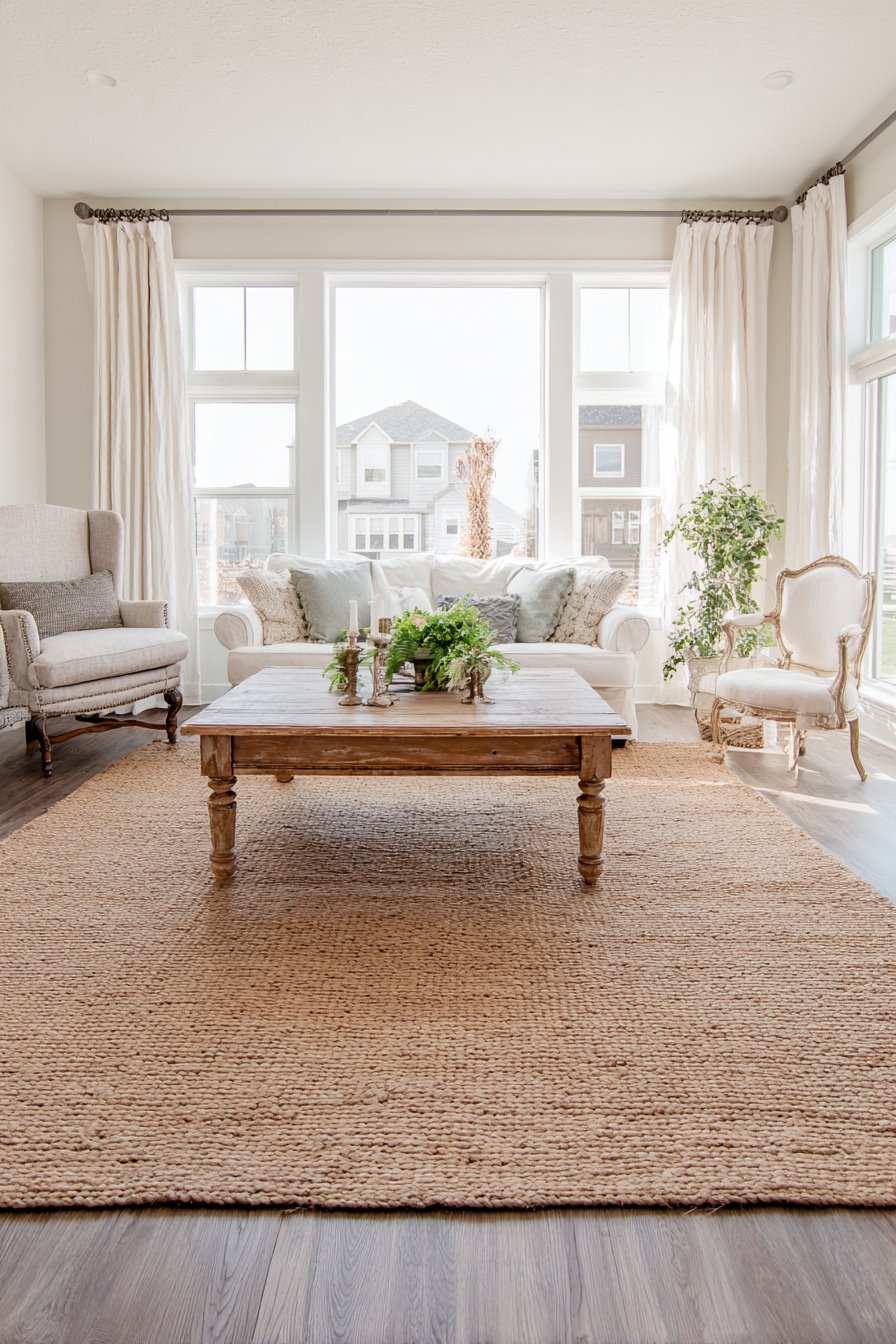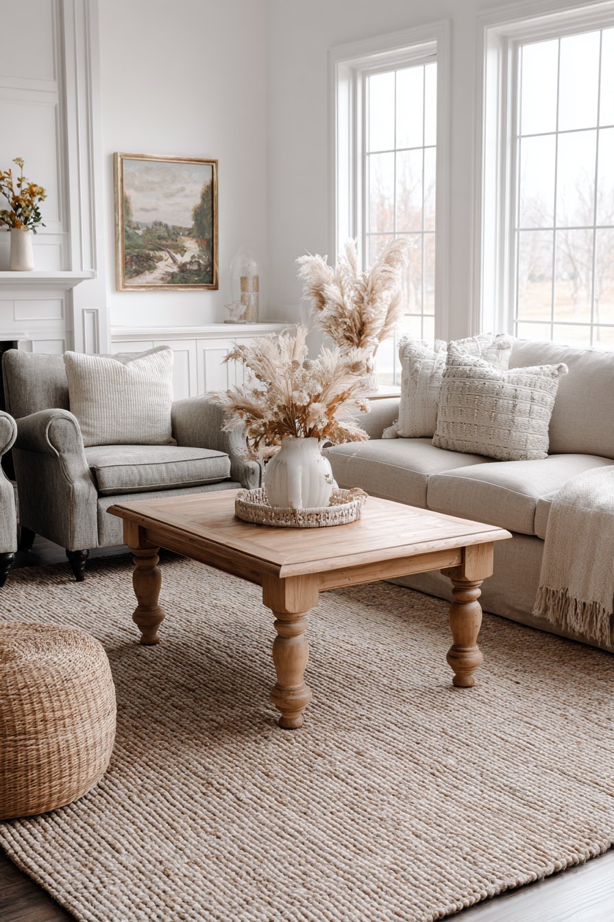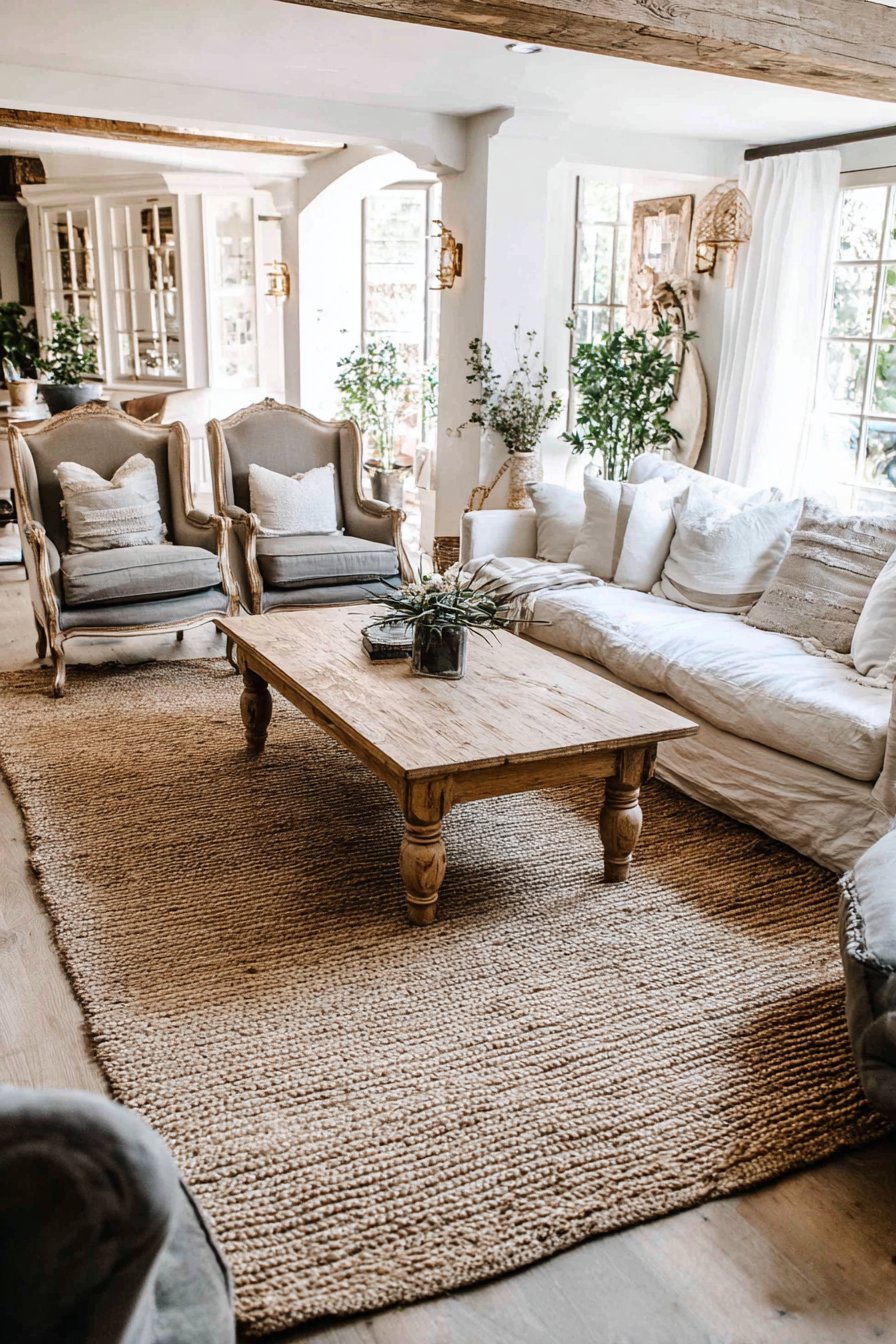 Building upon this natural foundation, the furniture arrangement demonstrates how varied pieces can create a cohesive, collected look. A wooden coffee table with turned legs occupies the rug’s center, surrounded by a linen sofa and two mismatched vintage armchairs reupholstered in complementary neutral fabrics. This mixing of furniture styles prevents the space from feeling too matched or showroom-perfect, instead creating that lived-in, accumulated-over-time quality that defines truly cozy interiors. Each piece brings its own character while contributing to the overall neutral, textured aesthetic.