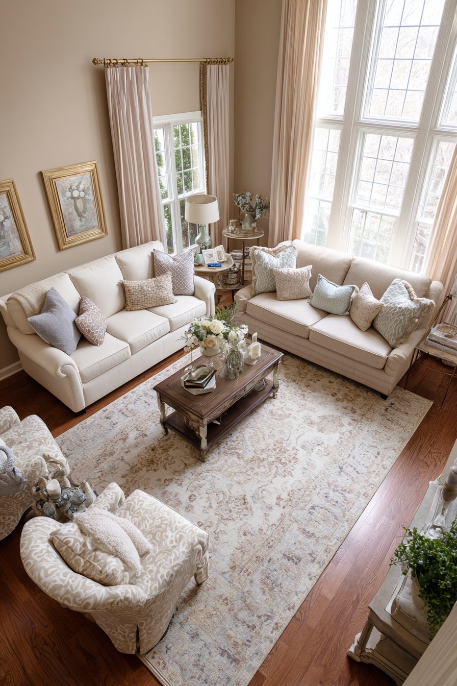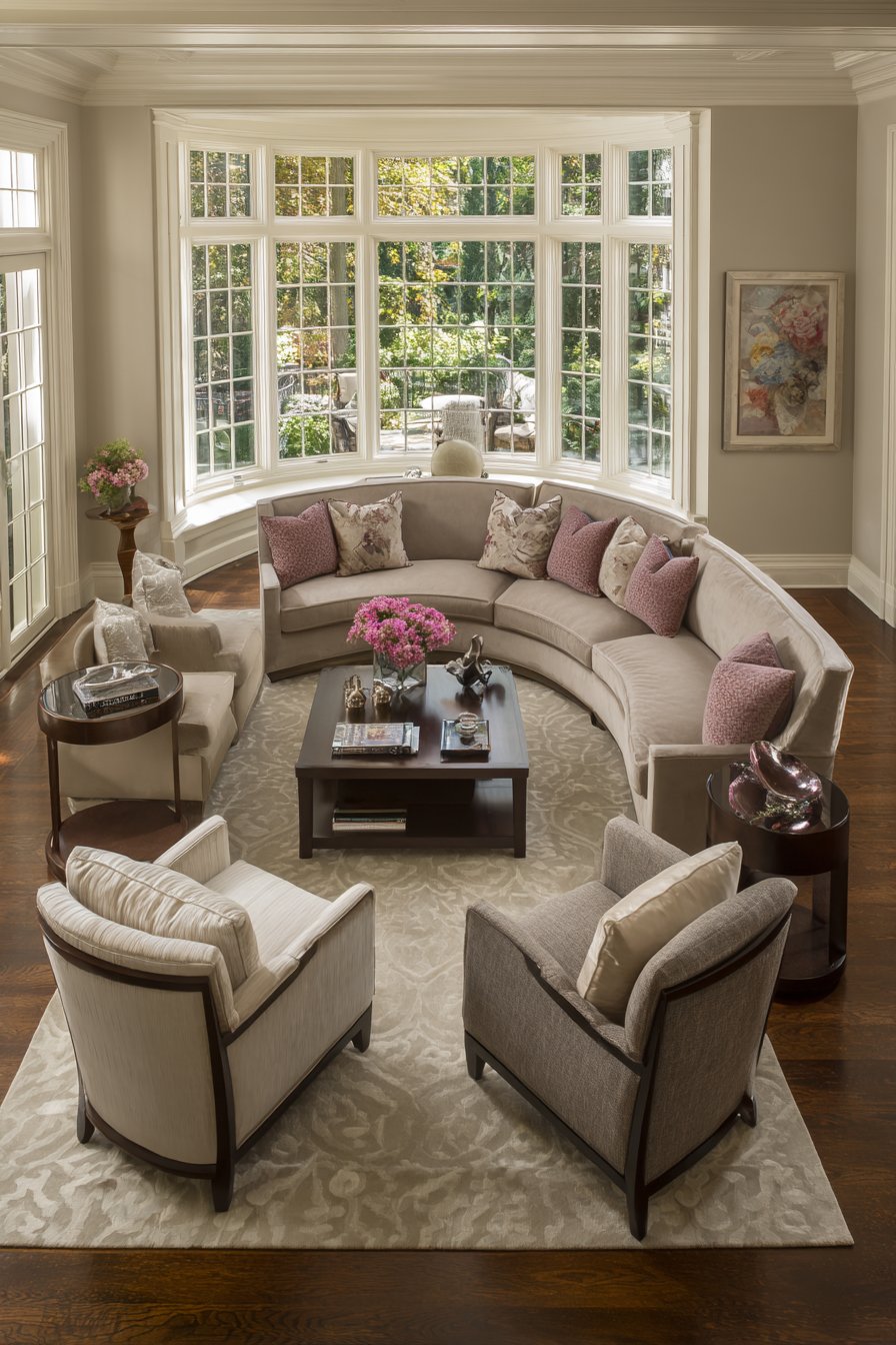 The layout of furniture fundamentally affects how a room functions and feels, and this conversation-focused arrangement demonstrates how thoughtful positioning creates intimacy and connection. Two sofas face each other across a coffee table, creating the primary conversation axis. Two accent chairs positioned at the ends create an intimate grouping that naturally encourages face-to-face interaction while maintaining comfortable personal space. All seating is upholstered in complementary neutral fabrics with varied textures, providing visual cohesion while preventing monotony. A large area rug defines and anchors the seating arrangement, creating a room within the room.