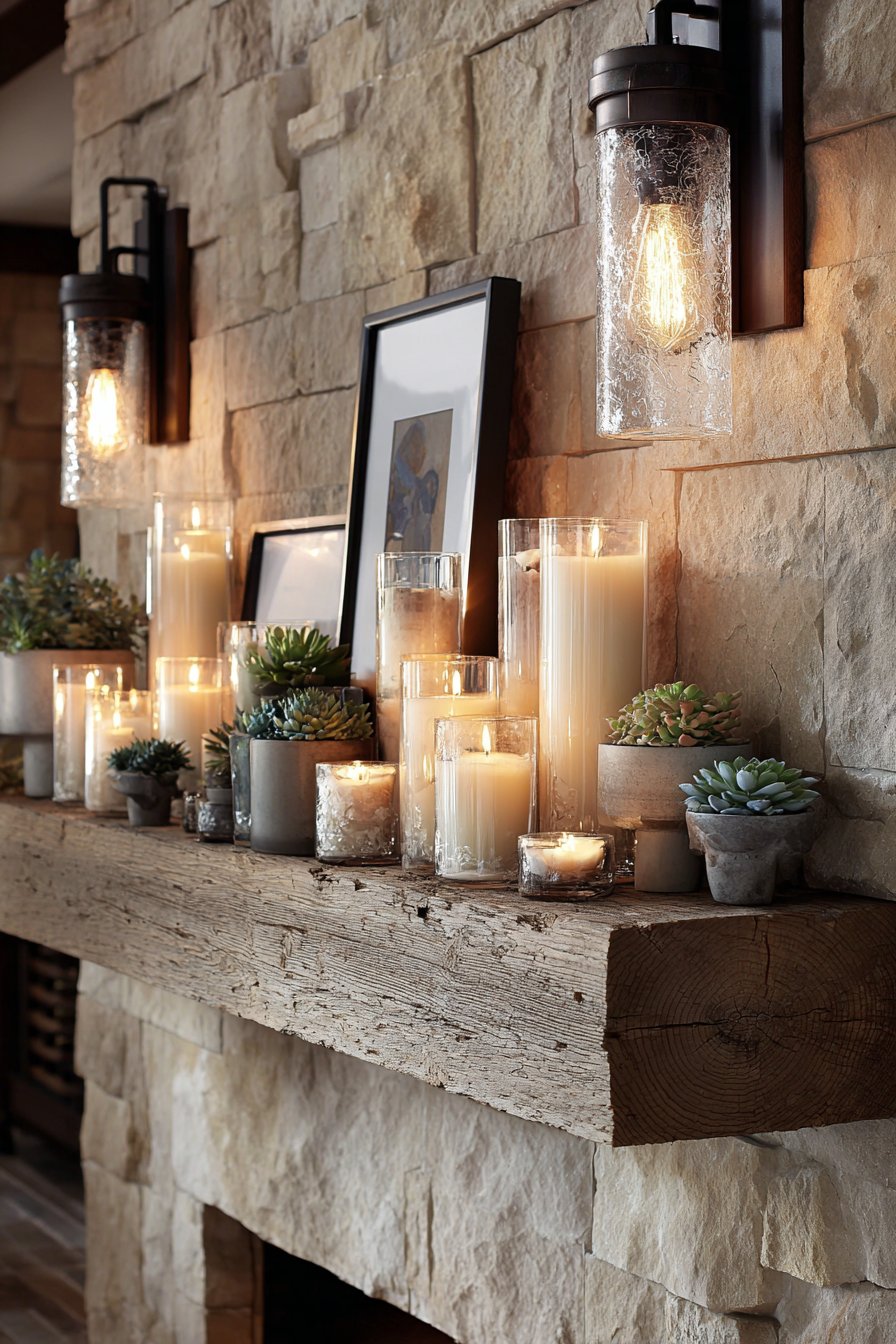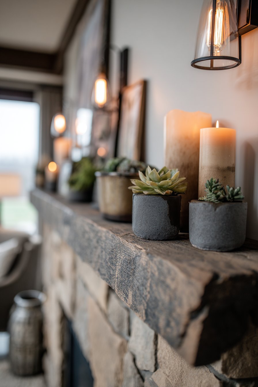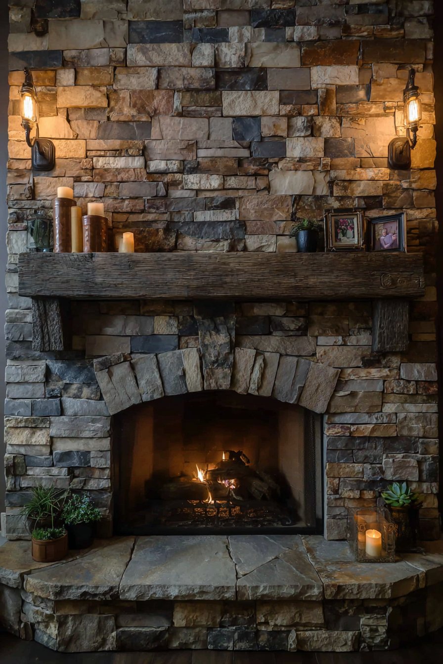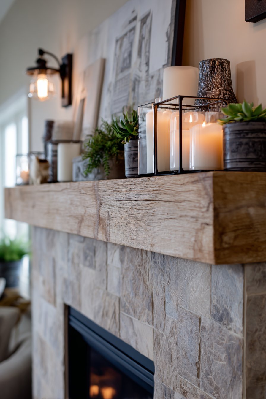 A statement fireplace serves as more than just a heat source—it becomes the emotional and visual anchor of a cozy living room. This design showcases a reclaimed barn wood mantel displaying a carefully curated collection that includes candles in varying heights, small potted succulents, and framed family photos. The mantel styling demonstrates restraint and intention, with each piece serving a purpose while contributing to the overall composition. The stacked stone fireplace surround features natural color variations in warm greys and taupes, creating organic visual interest that reflects the beauty of natural materials.