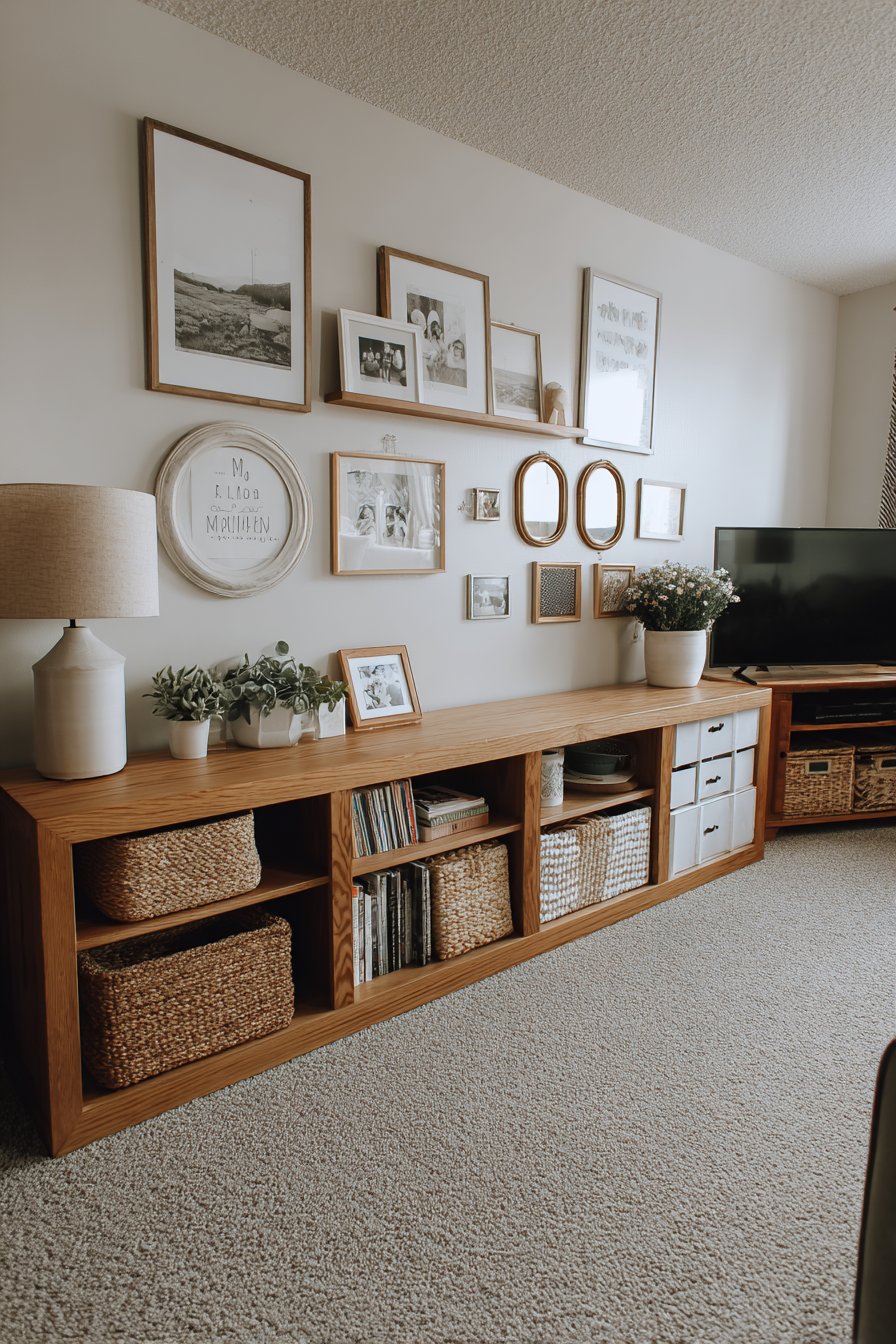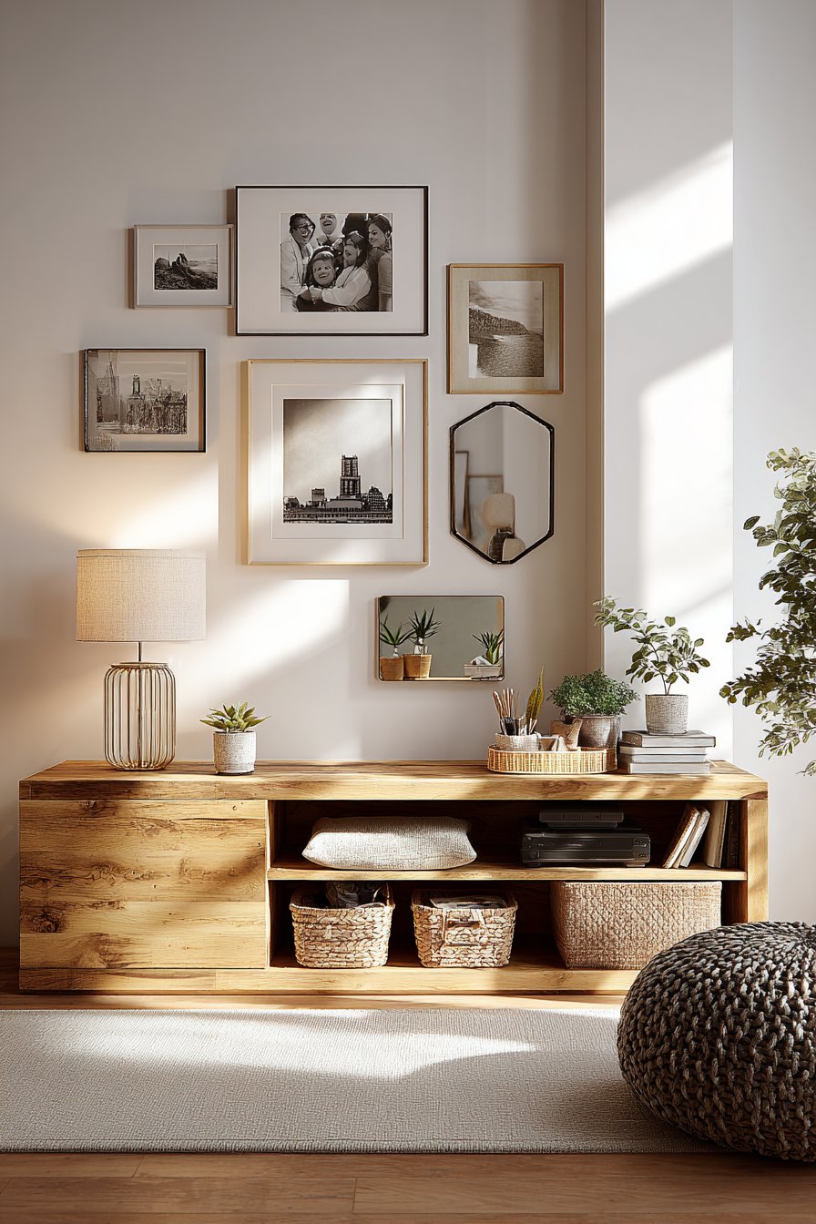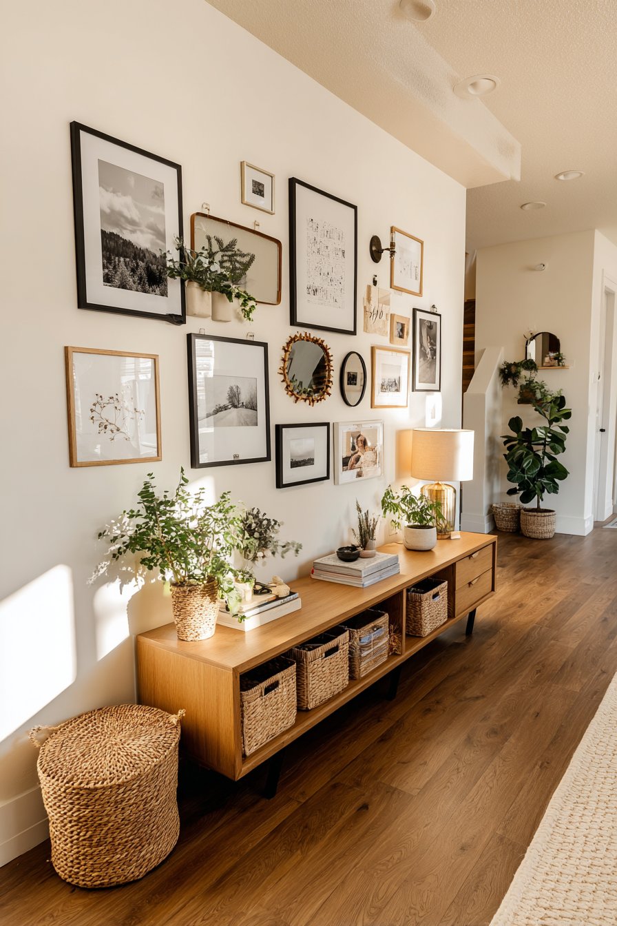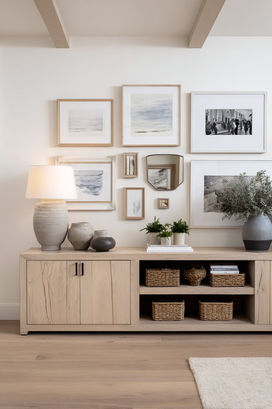 The foundation for this gallery wall is a low-profile media console in natural oak with visible wood grain, providing both practical storage and a beautiful horizontal line that grounds the wall arrangement above. The console’s styling demonstrates how to balance function with aesthetics—a table lamp provides task lighting while woven storage baskets conceal clutter and small potted plants add life and organic texture. This layered approach to styling creates depth and prevents the console from looking sparse or overly staged.