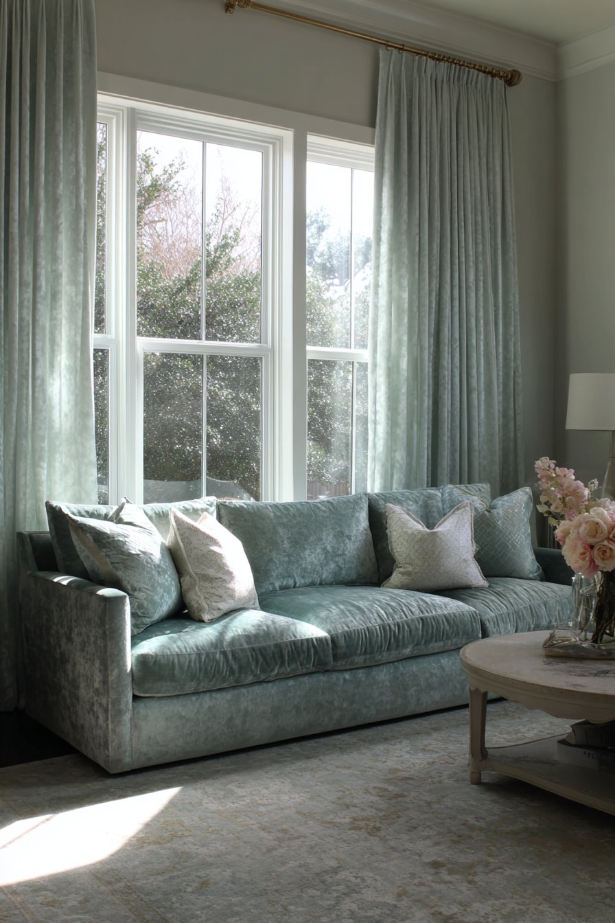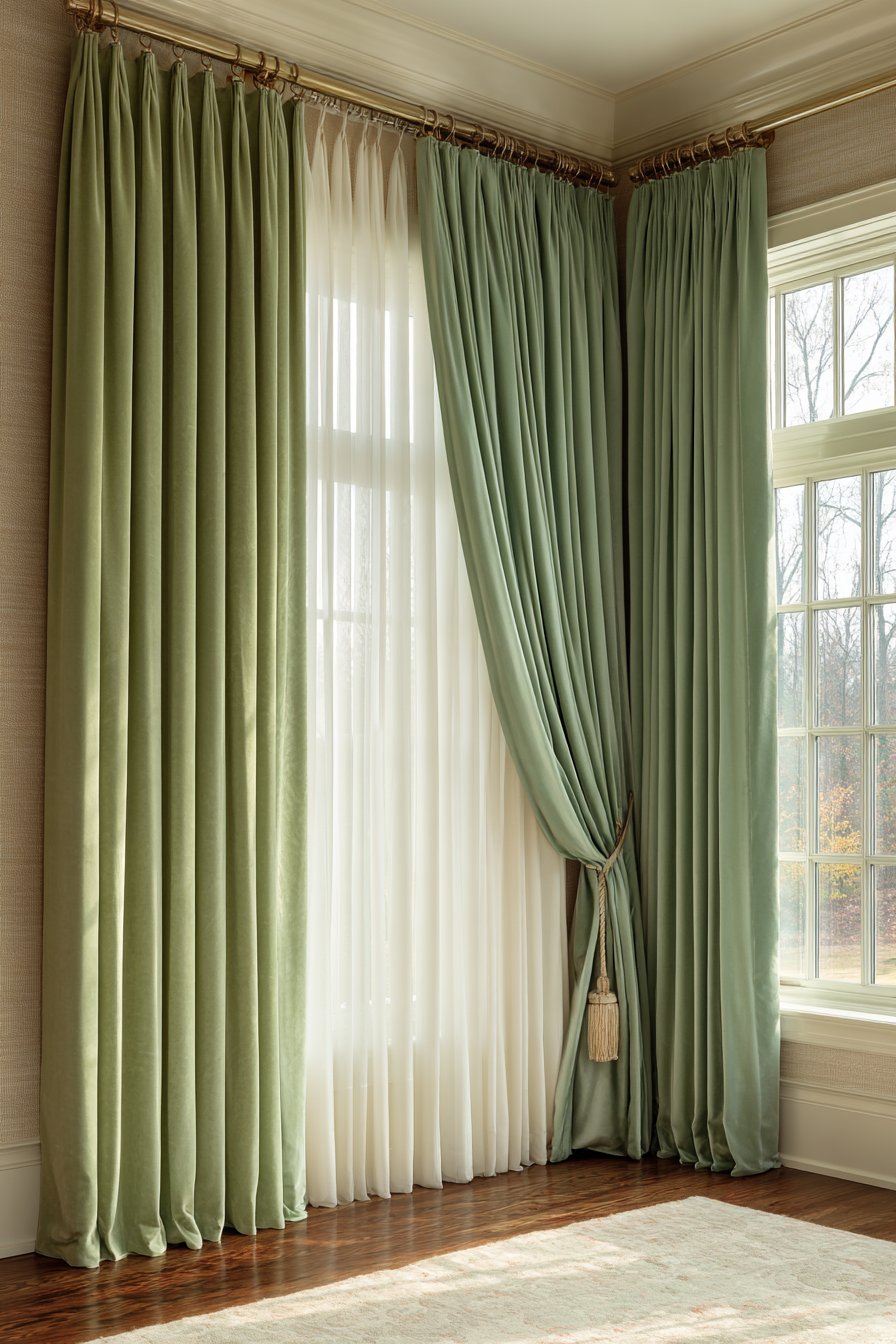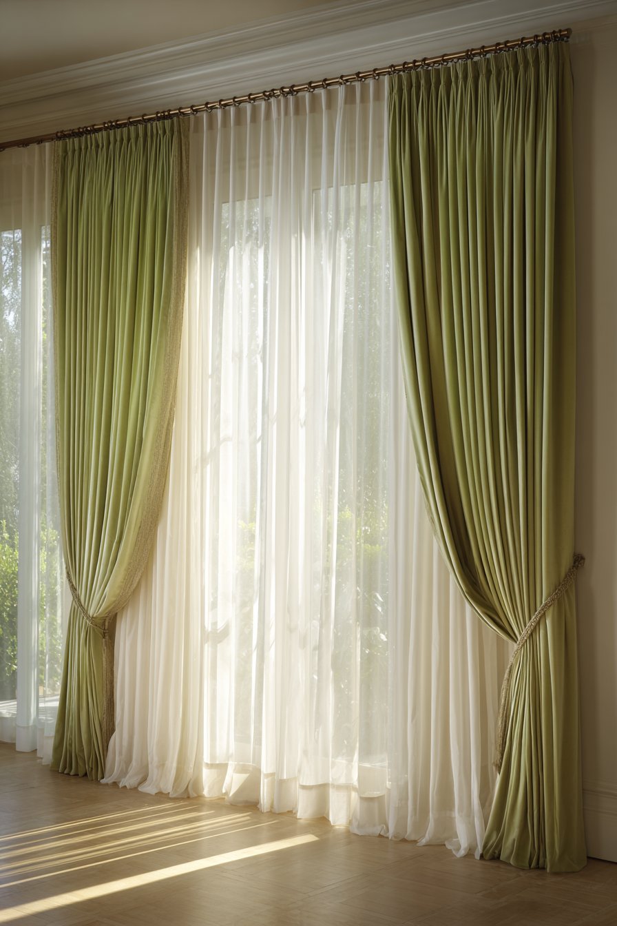 The fabric choices in this layered window treatment tell a story of thoughtful design. The crisp white sheers maintain privacy during the day while preserving the connection to natural light and outdoor views. When afternoon light filters through, the sheers create a luminous quality that makes the entire room feel airy and uplifted. The velvet drapes provide substantial weight and drape beautifully, their soft sage green hue introducing a nature-inspired color that complements rather than competes with other room elements.