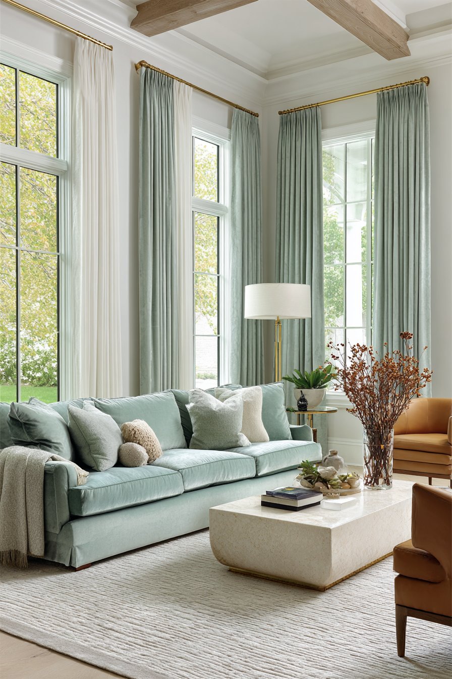 Window treatments have the power to completely transform a room’s atmosphere, and this design demonstrates the sophisticated beauty of layering. Sheer white linen curtains provide the foundation layer, filtering natural light to create a soft, diffused glow that feels ethereal and peaceful. The addition of floor-length velvet drapes in soft sage green introduces color, texture, and light control, while the brushed brass rods with simple finials add a touch of refined elegance. The decision to mount curtains at ceiling height is crucial—it draws the eye upward and creates the illusion of taller windows and more spacious rooms.