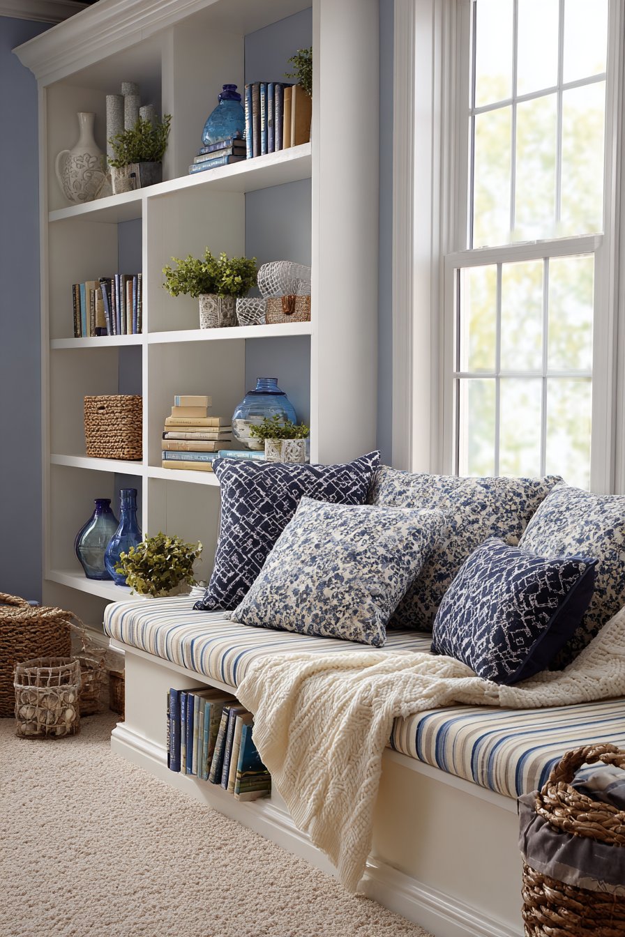 The built-in window seat represents the ultimate in cozy living room design—a dedicated space for relaxation, reading, or simply gazing out the window. This design features a cushioned bench upholstered in classic striped ticking fabric, providing both comfort and timeless style. The flanking built-in shelving creates a frame for the window seat while offering extensive storage and display opportunities. The shelves hold a mix of color-organized books, decorative objects, woven baskets for concealing clutter, and small indoor plants that add life and air-purifying benefits.