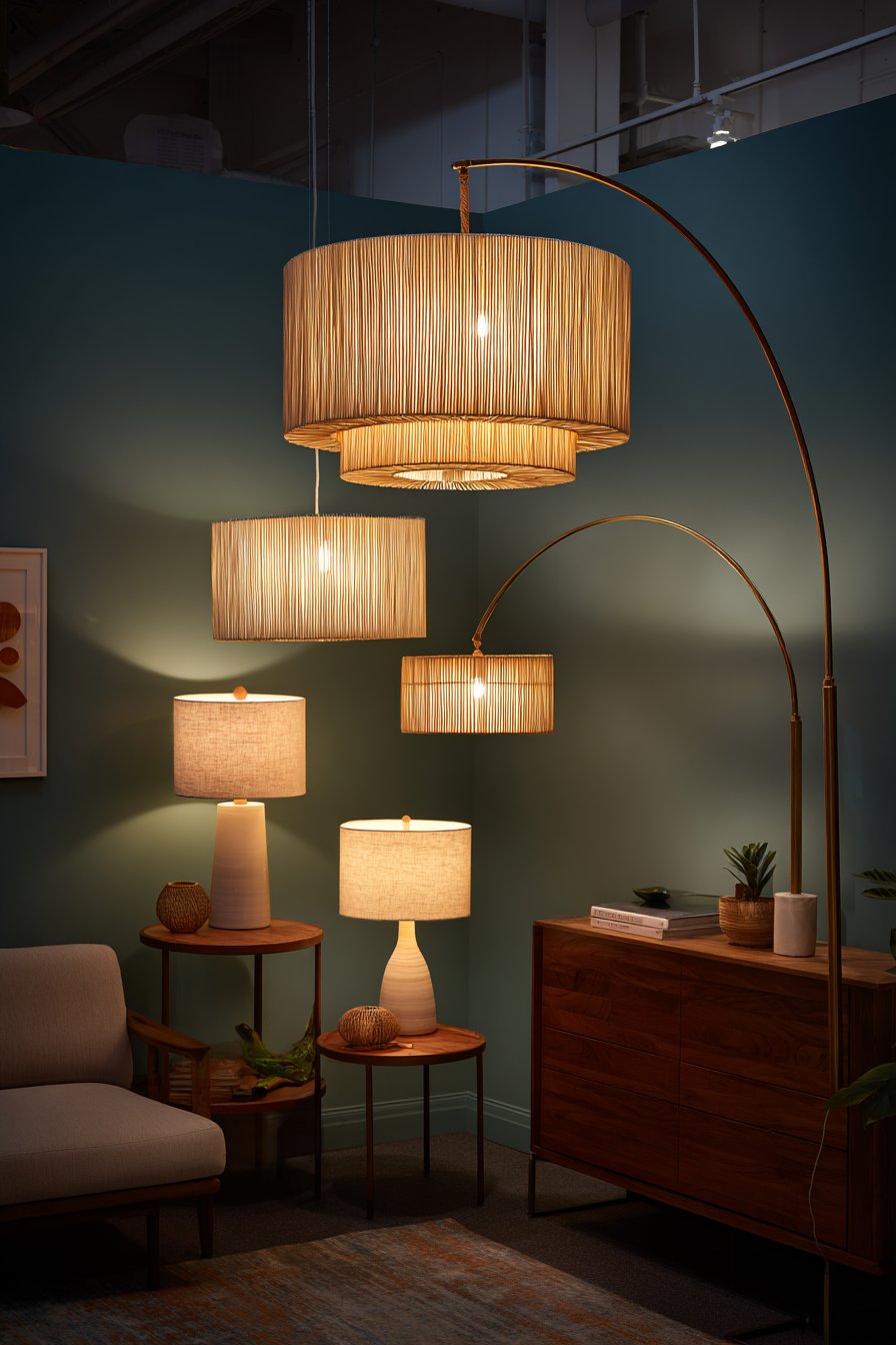 The varied light sources create distinct pools of illumination throughout the space, each serving specific functions while contributing to the overall atmosphere. The pendant light draws the eye upward and provides general illumination that makes the room navigable and welcoming. Table lamps create intimate circles of light perfect for evening conversations or reading, their linen shades diffusing the light source for a soft, flattering glow. The arc floor lamp demonstrates how directional lighting can be both functional and sculptural, its brass finish catching and reflecting light while its adjustable nature allows for customized positioning.
