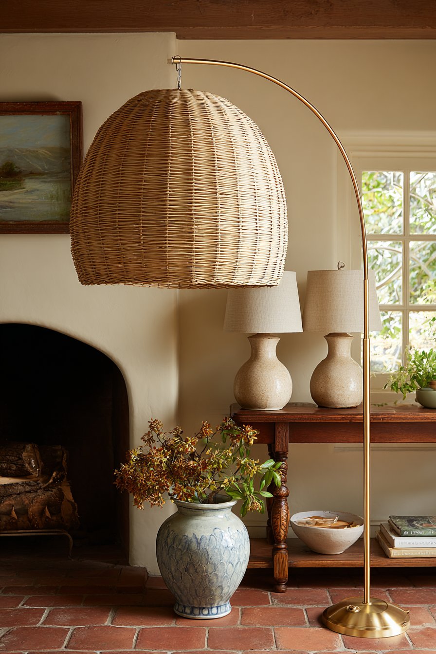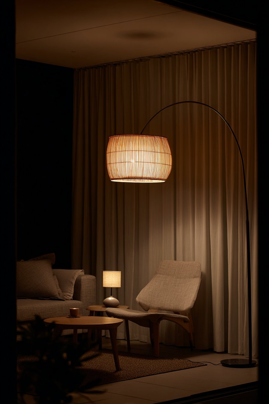 Exceptional living room lighting goes far beyond a single overhead fixture, and this design demonstrates the transformative power of layered illumination. A central pendant light with a natural rattan shade provides ambient lighting while introducing organic texture and visual interest to the ceiling plane. Two matching table lamps with ceramic bases and neutral linen shades on side tables offer task lighting for reading and close work, while a modern arc floor lamp with brushed brass finish arches gracefully over a reading chair, providing focused illumination exactly where needed.