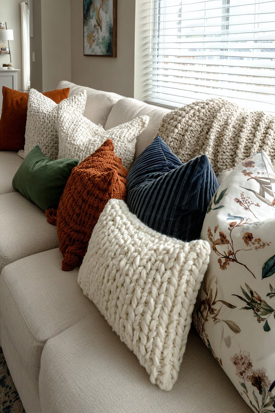 Each pillow texture serves a distinct purpose beyond mere decoration. The chunky knit covers introduce tactile warmth and visual weight, their dimensional surfaces creating shadows and highlights that change with lighting conditions. Linen pillows provide a natural, slightly rumpled quality that prevents the arrangement from feeling too perfect or staged. Velvet introduces luxury and light reflection—as you move through the room, velvet pillows appear to change color subtly as light hits their pile from different angles. The patterned pillows provide focal points and visual energy that draw the eye.