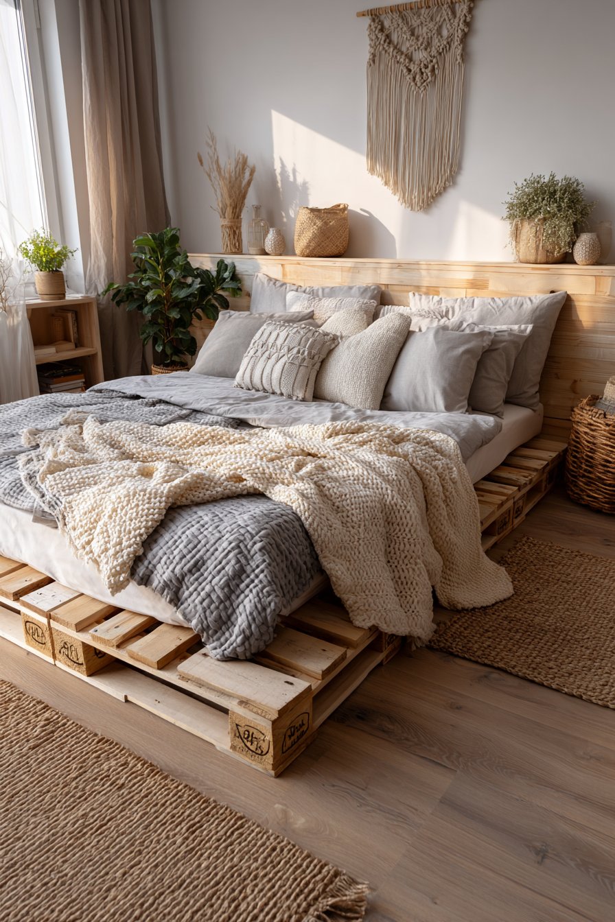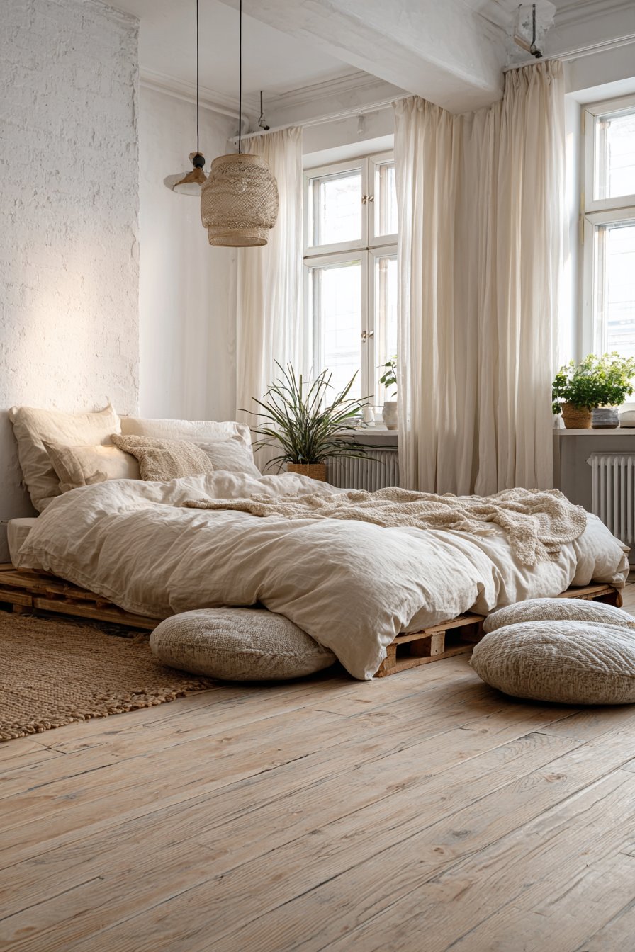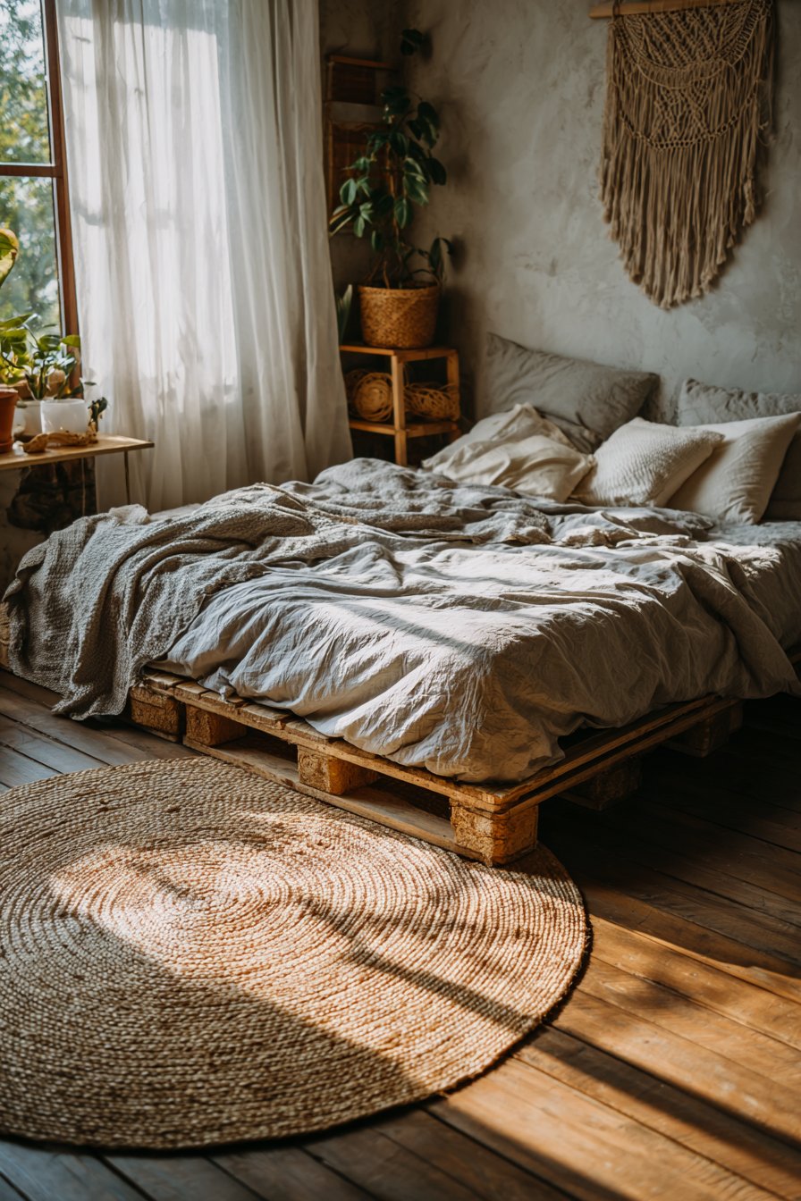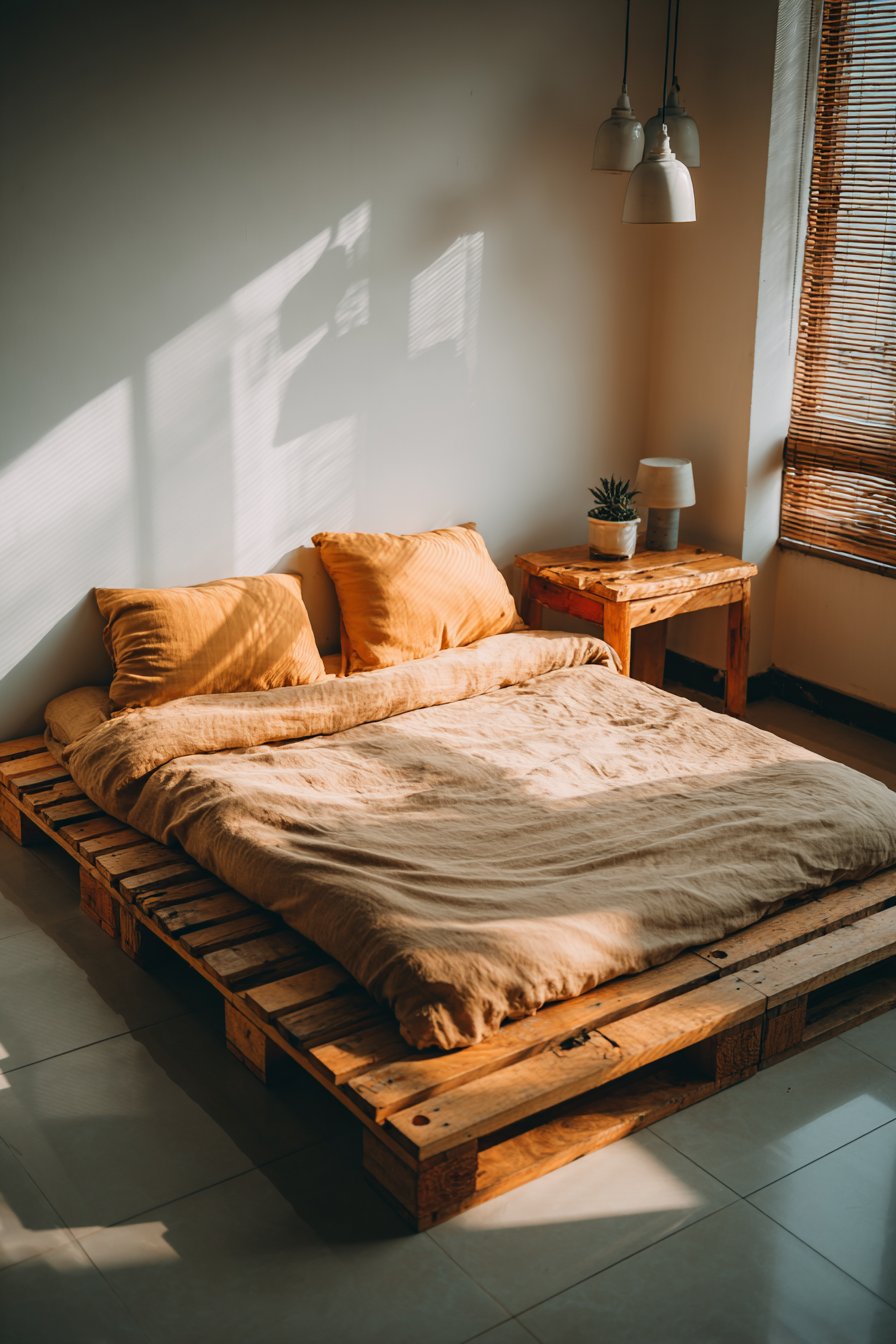 Embrace creative resourcefulness with this cozy low-bed bedroom idea featuring a DIY pallet platform bed with industrial aesthetic, constructed from raw wood planks treated with clear matte sealant. This ultra-low construction sits just five inches from concrete flooring, creating an honest, unfussy sleeping arrangement that celebrates the beauty of simple materials and straightforward construction. The visible pallet structure becomes a design feature rather than something to hide, with the gaps between planks creating interesting shadow play when light filters through.