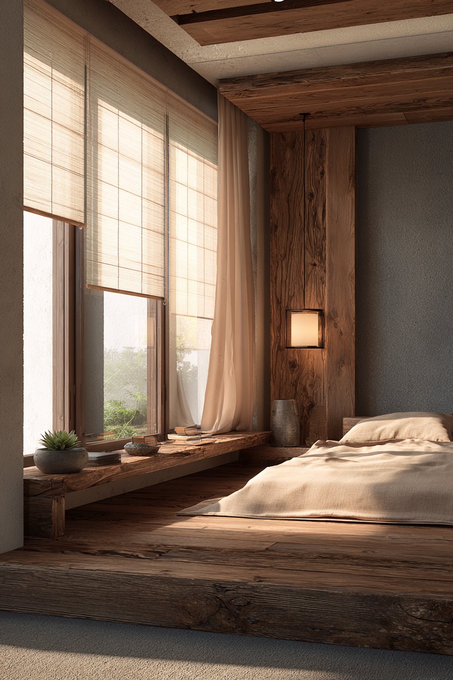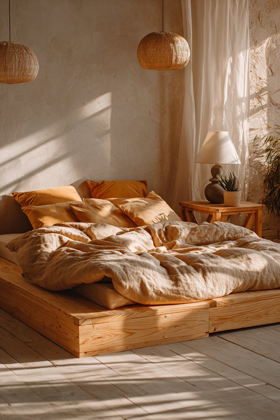 Step into a space that embodies the essence of Japanese design philosophy, where a tatami platform bed elevated merely four inches from the floor creates an atmosphere of profound tranquility. The minimalist wooden frame showcases the natural beauty of honey-toned wood grain, each subtle variation telling its own story. Draped in a natural linen duvet in warm beige, this cozy low-bed bedroom idea exemplifies the principle of “less is more,” where every element serves both aesthetic and functional purposes. The extreme low profile doesn’t just save space—it fundamentally changes how you experience the room, making ceilings appear higher and creating an expansive sense of openness.
