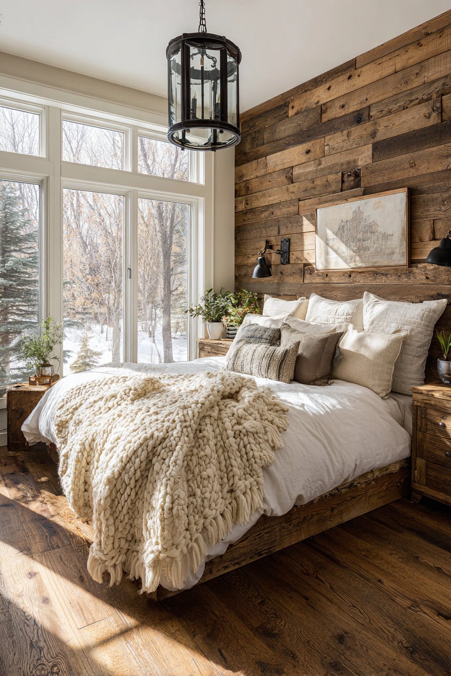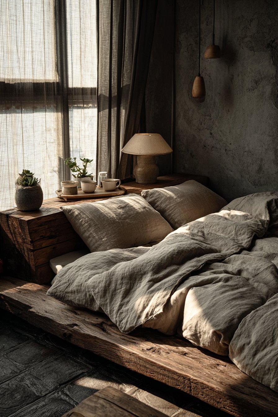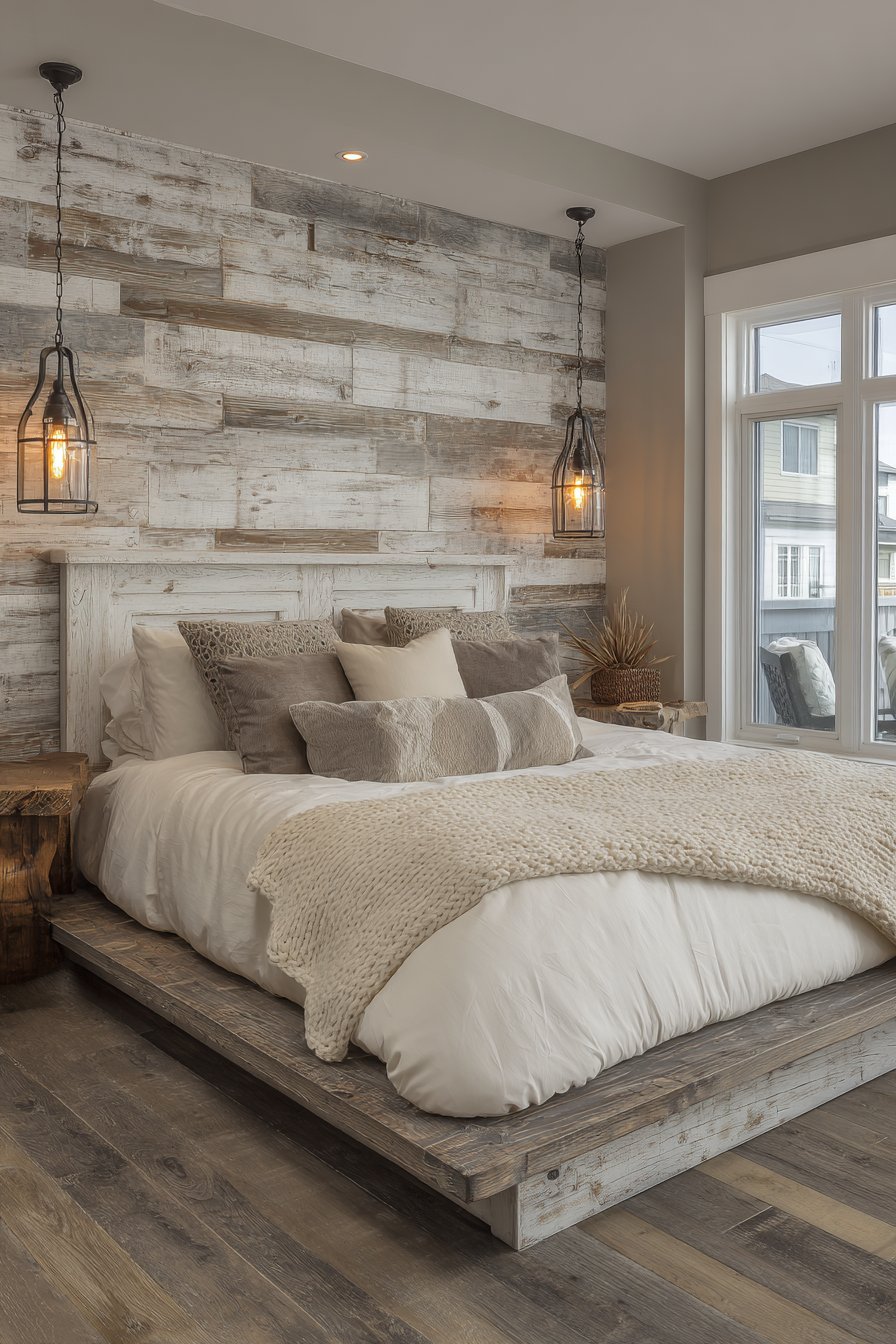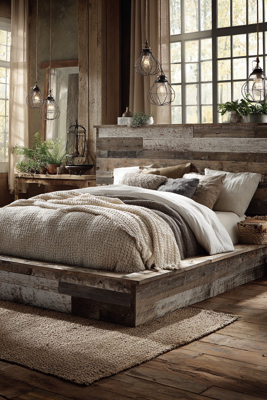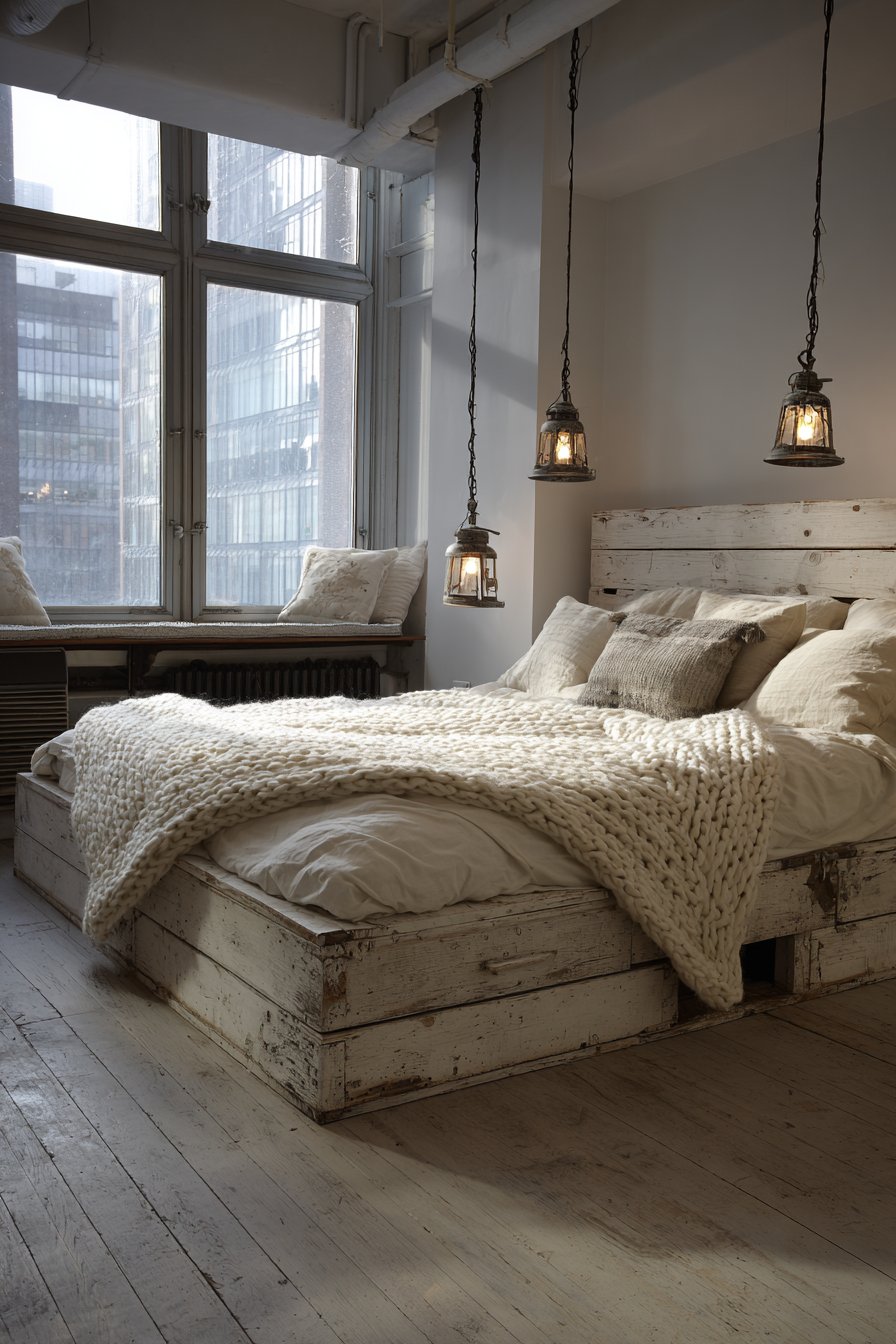 Textiles play a starring role in softening the rugged character of reclaimed wood. Chunky knit throw blankets in cream and taupe drape naturally over organic cotton bedding, creating layers of comfort that contrast beautifully with the bed’s rough-hewn appearance. This interplay between hard and soft, rustic and refined, creates visual tension that keeps the design interesting without feeling chaotic. The natural, undyed fibers of the bedding allow the wood to remain the focal point while contributing their own subtle textures to the overall composition.