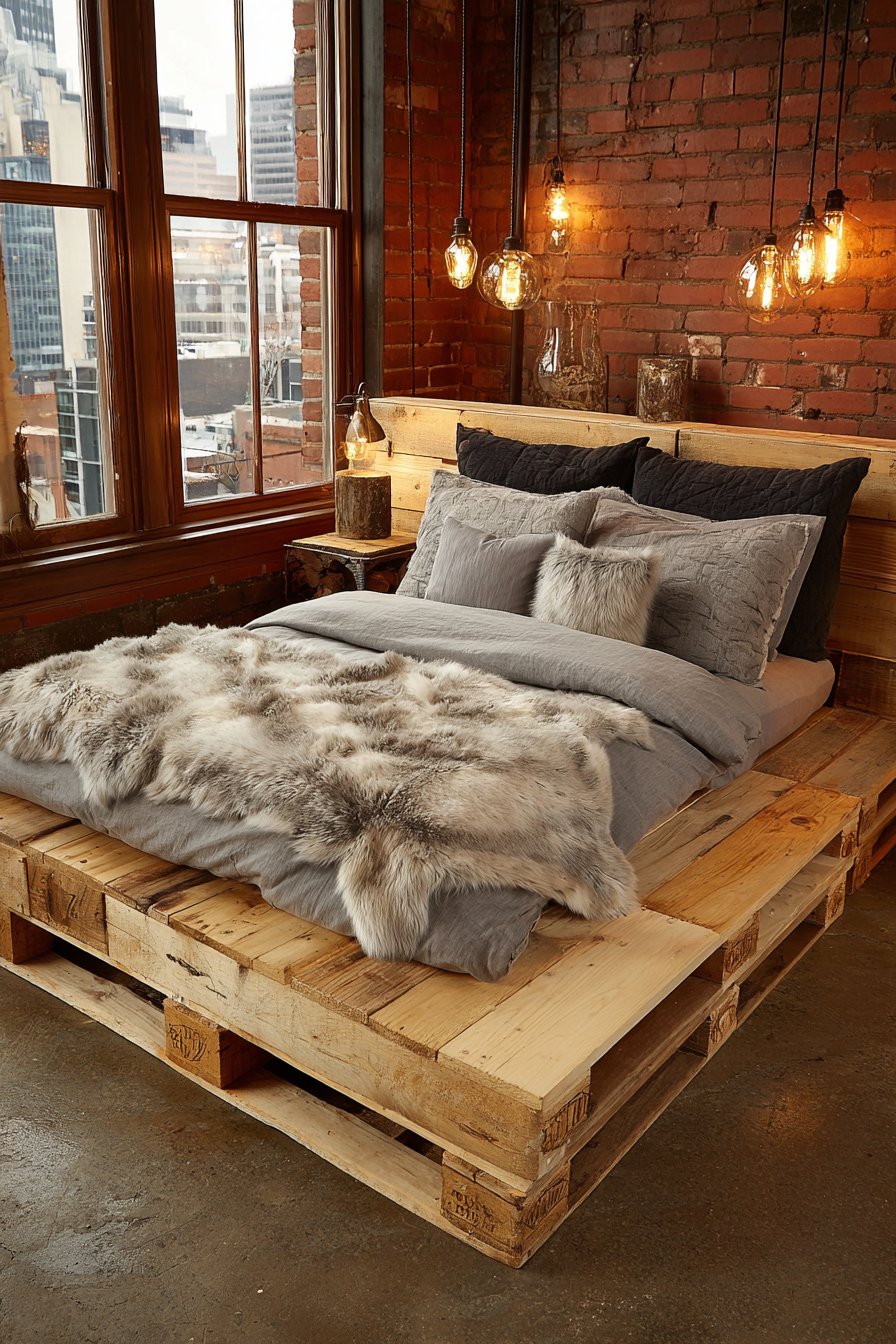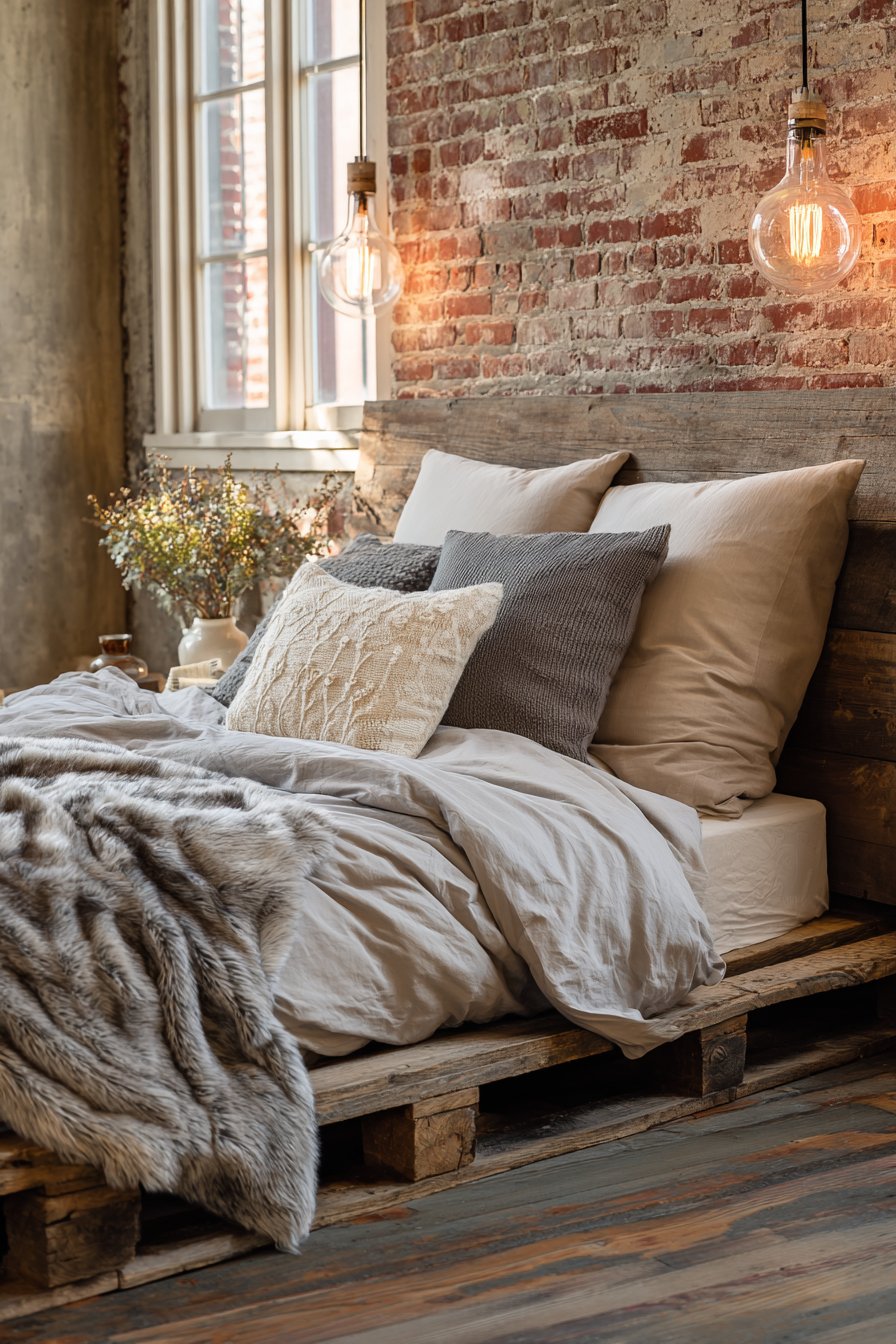 The success of this industrial design lies in its sophisticated material contrasts. Soft grey jersey knit bedding and faux fur throws add essential comfort elements that prevent the space from feeling too stark or masculine. These textiles soften the hard edges of the raw wood and concrete without undermining the industrial aesthetic—they simply make it livable and inviting. An exposed brick accent wall and Edison bulb pendant lighting enhance the urban loft feeling, creating a cohesive environment that looks deliberately designed rather than accidentally assembled.